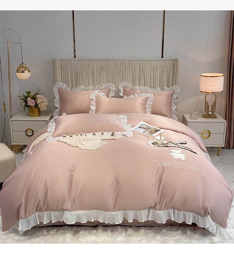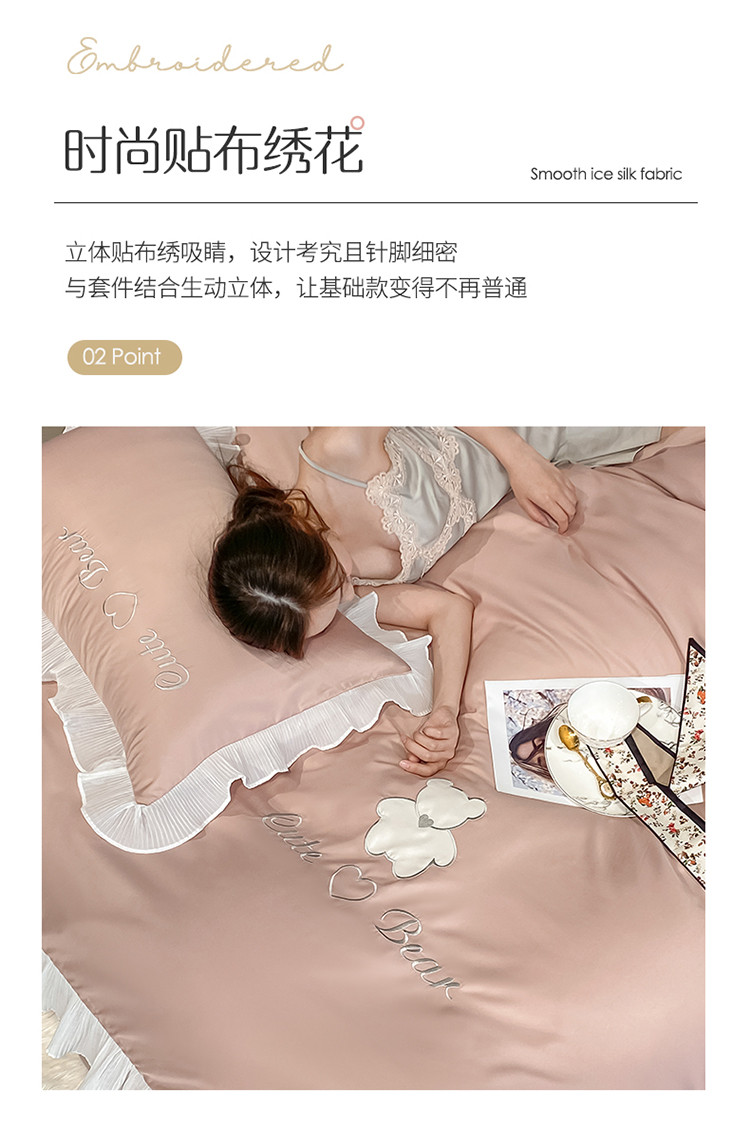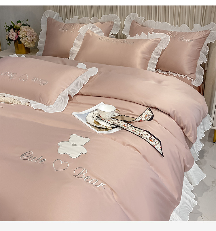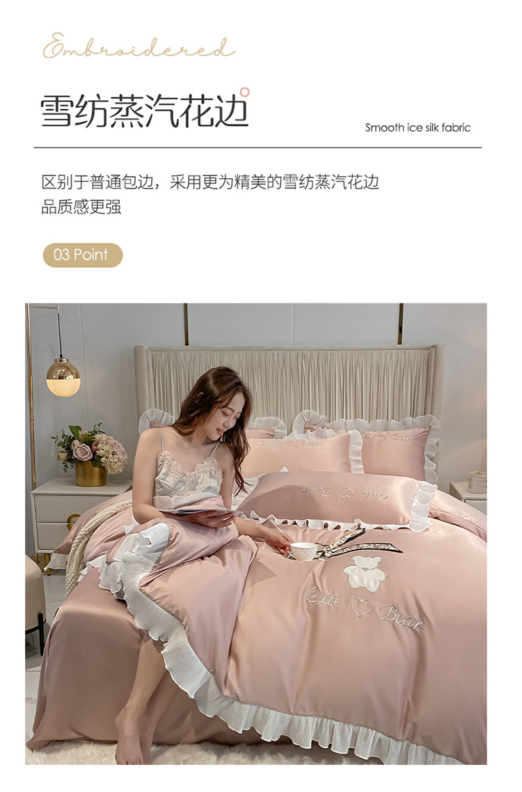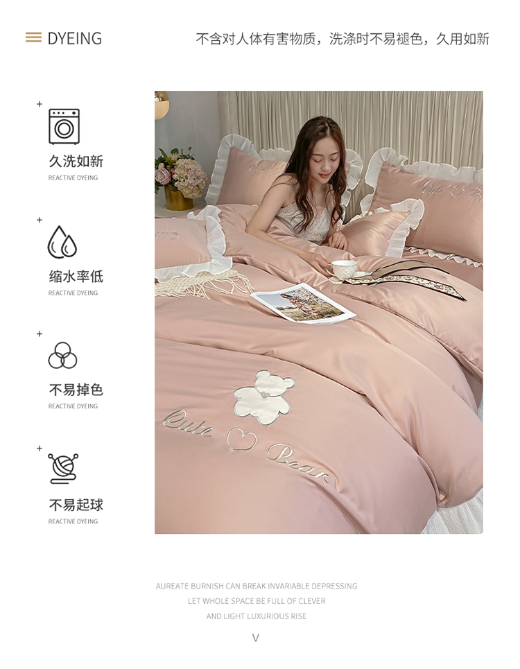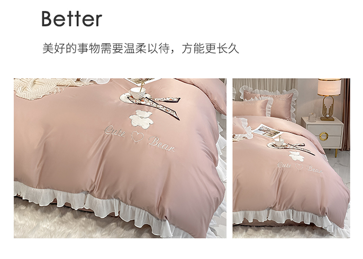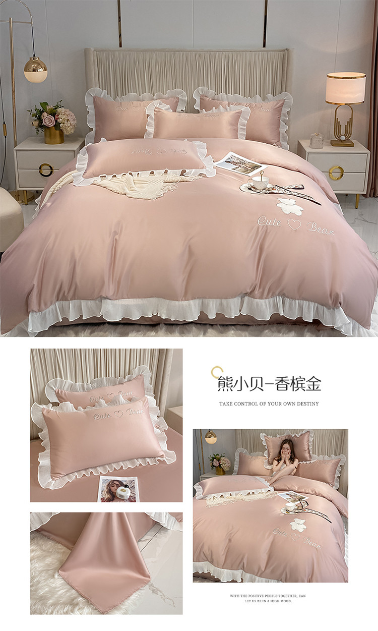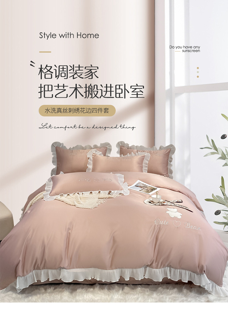 当前位置: 91家纺网 > 商品网购 > 床品套件 > 四件套 > 真丝四件套 > 菲儿家纺 2023新款水洗真丝花边四件套-熊小贝 香槟金