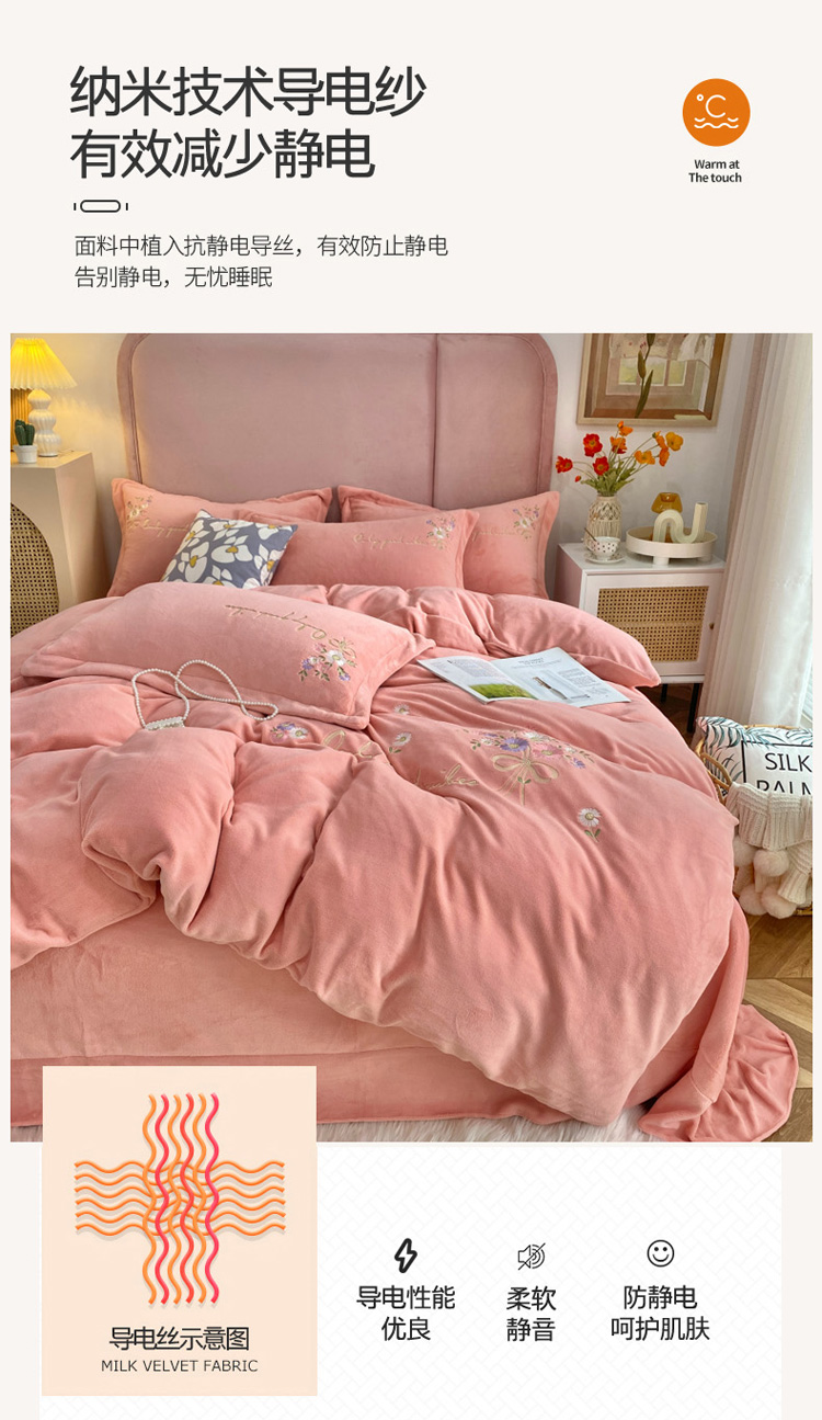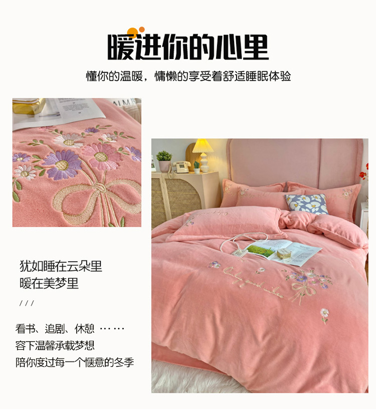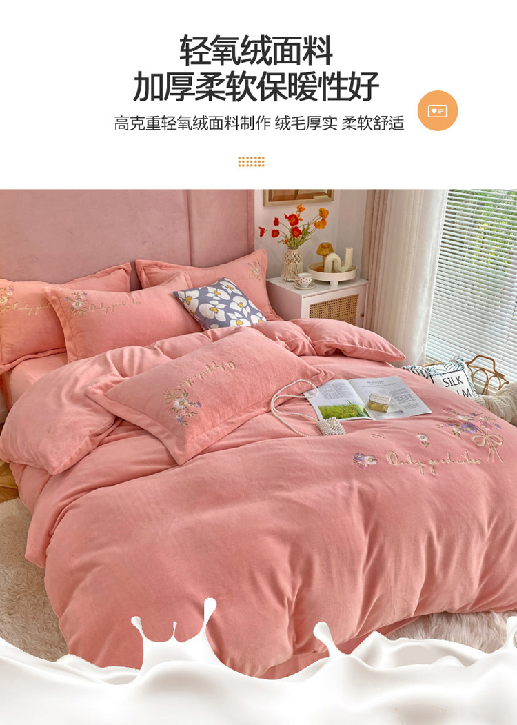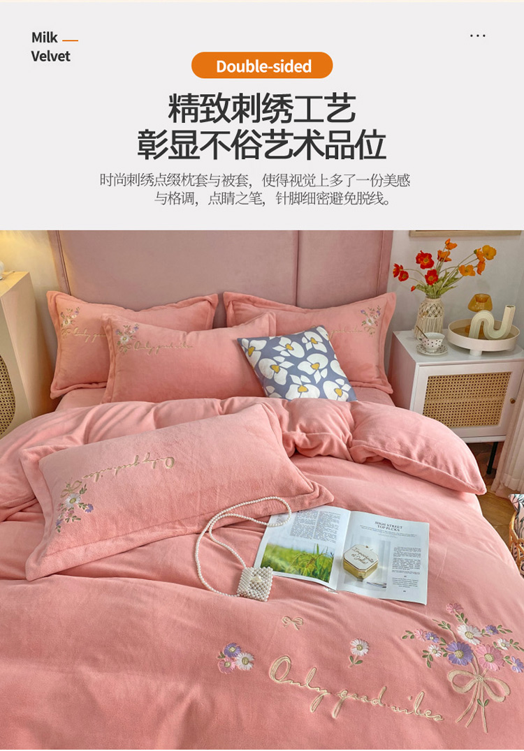 (总)星尚家纺 2024新款全消光230g牛奶绒刺绣保暖四件套-花漾,晨雾绿,豆沙粉,樱花粉