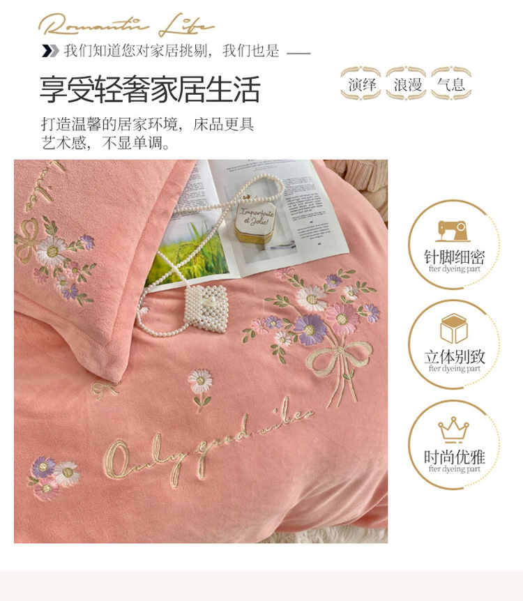 (总)星尚家纺 2024新款全消光A类230g牛奶绒韩版绣花绒四件套-绚丽花语,豆沙粉,浪漫紫,雾霾蓝,樱花粉,晨雾绿