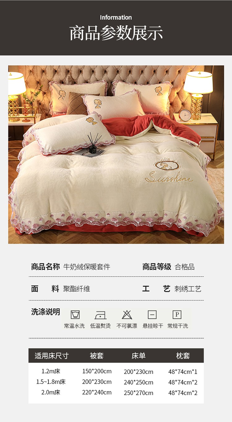 商品名称:青竹苑2021新款220克加厚保暖牛奶绒刺绣蕾丝太妃款四件套 太妃白桔