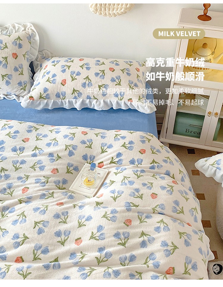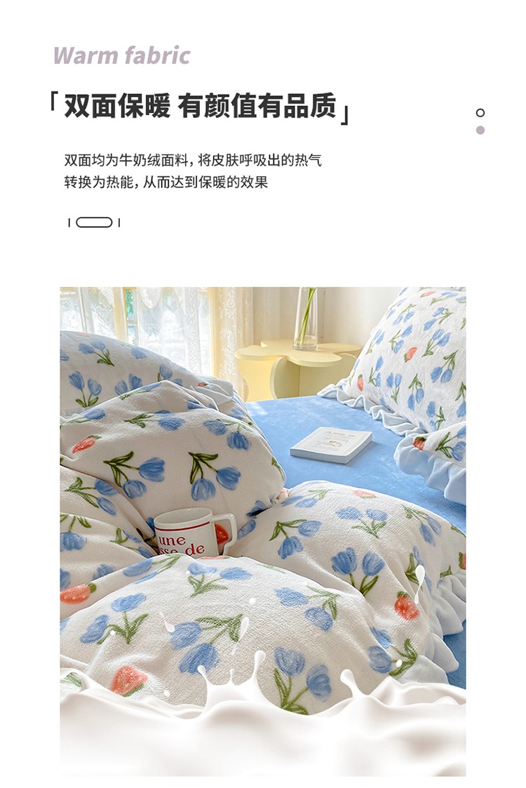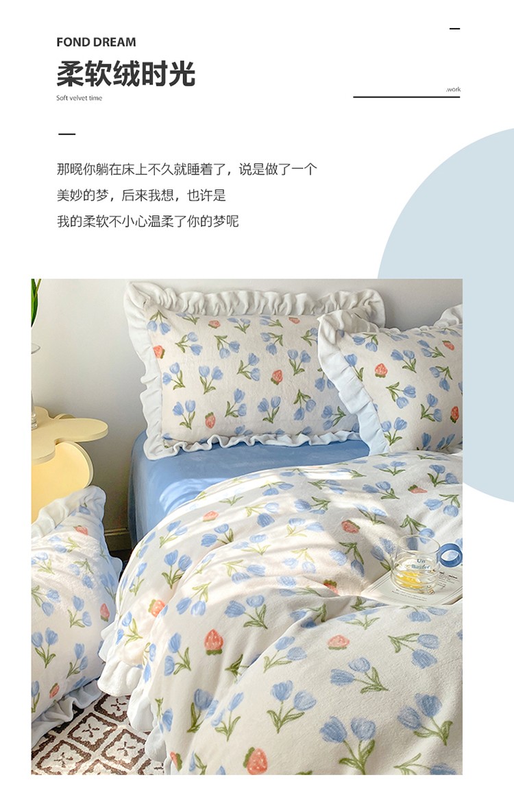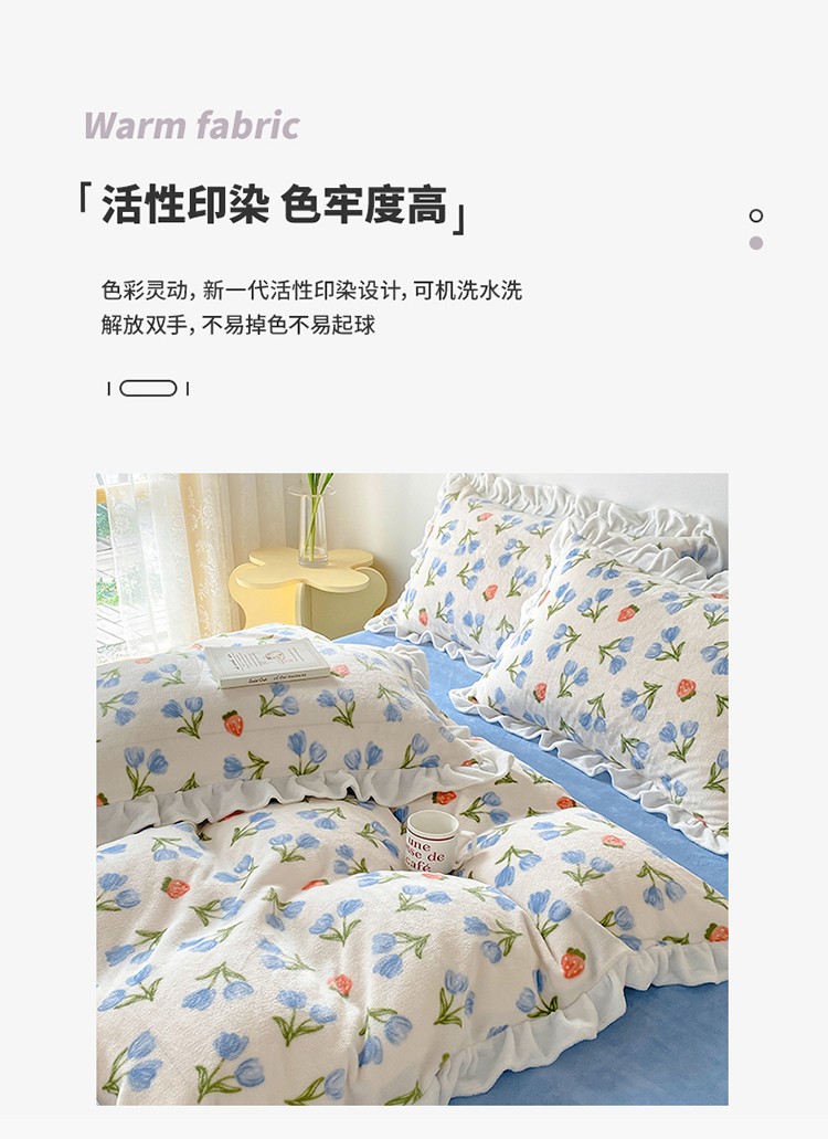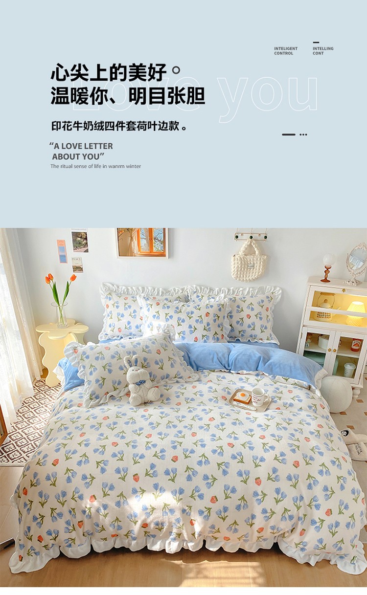 呗旺鹿2022新ykk拉链荷叶边印花牛奶绒四件套法莱绒 偏爱