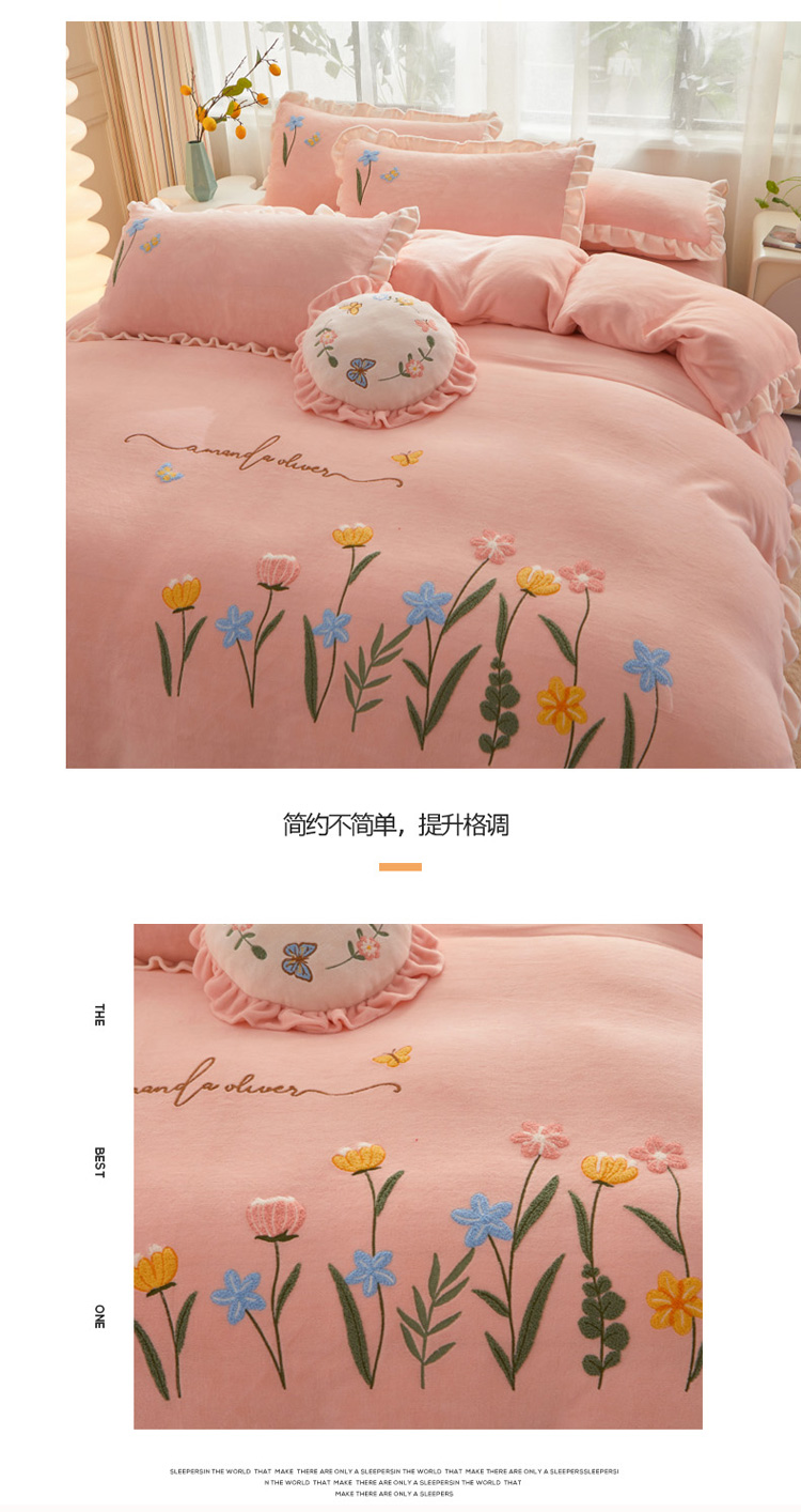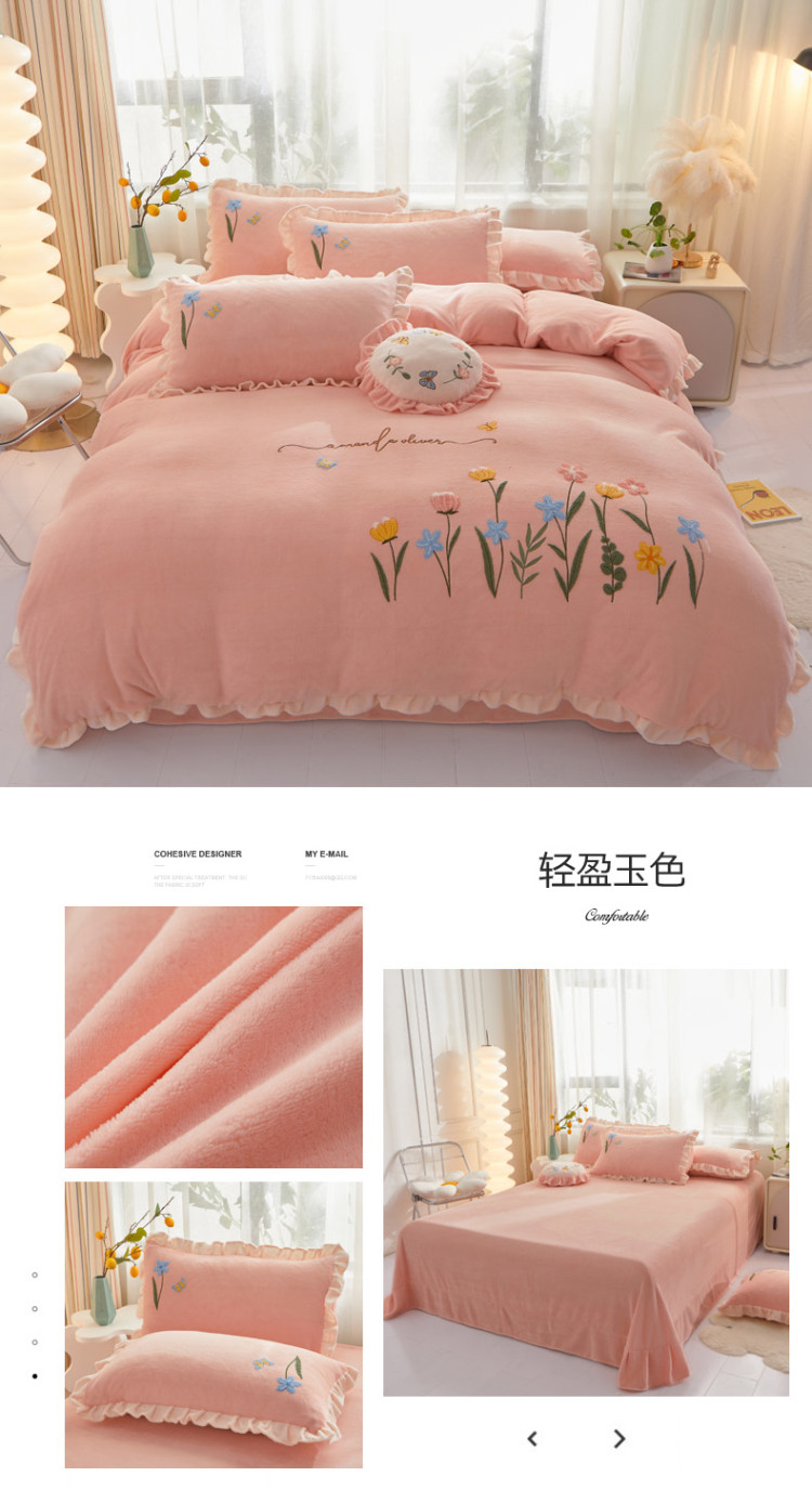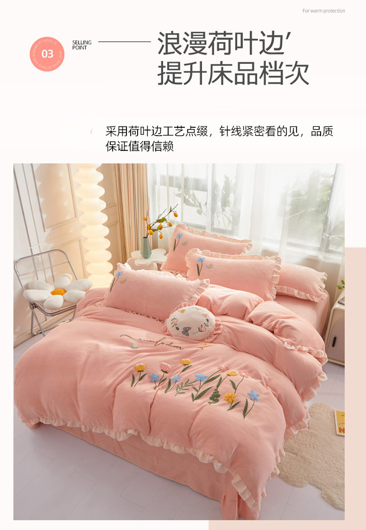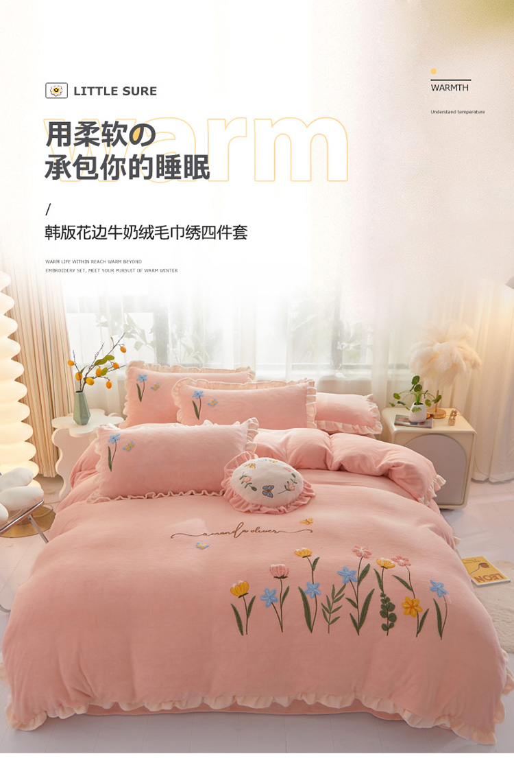 商品名称:恋佳 2023新款加厚牛奶绒荷叶边毛巾绣四件套 轻盈玉色