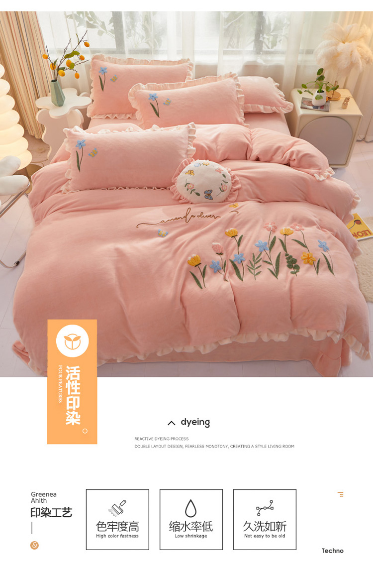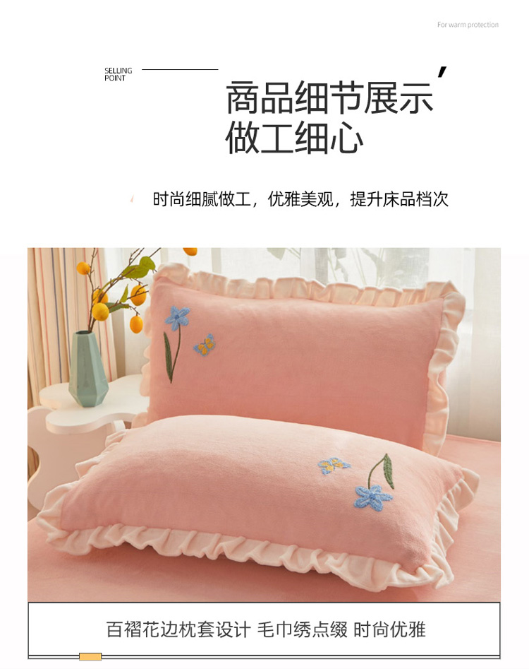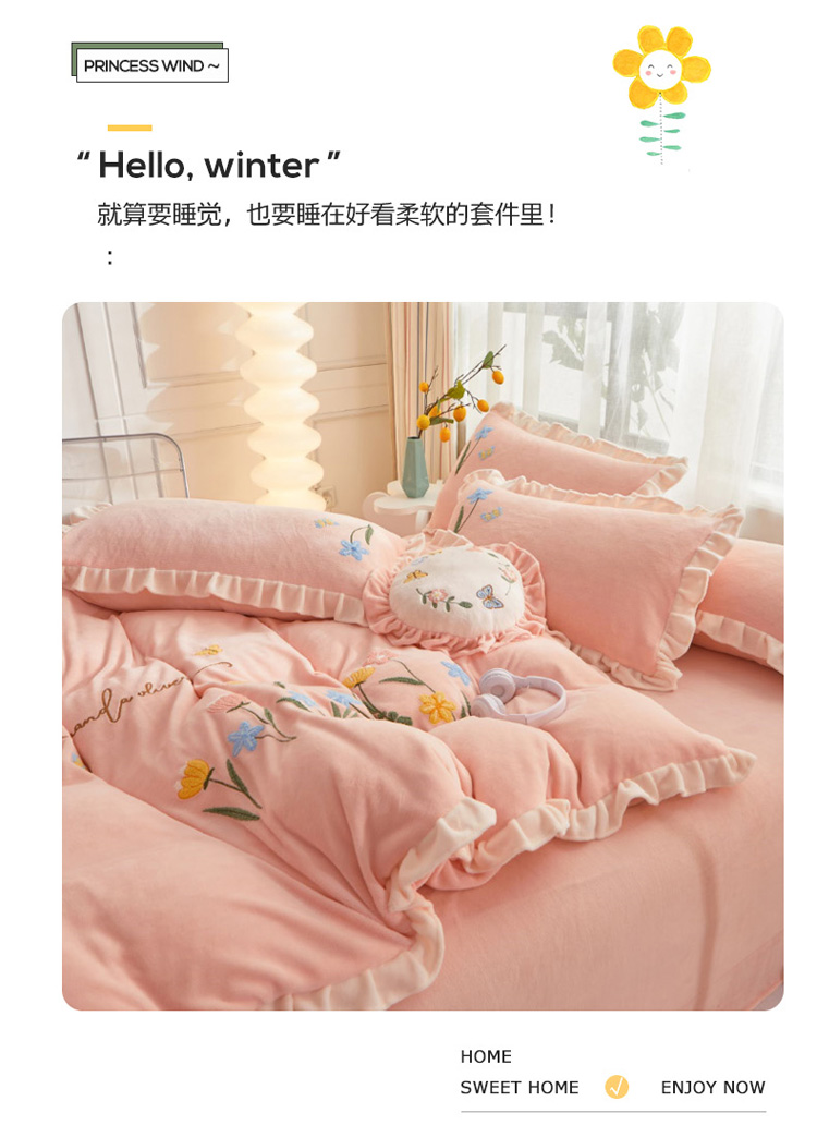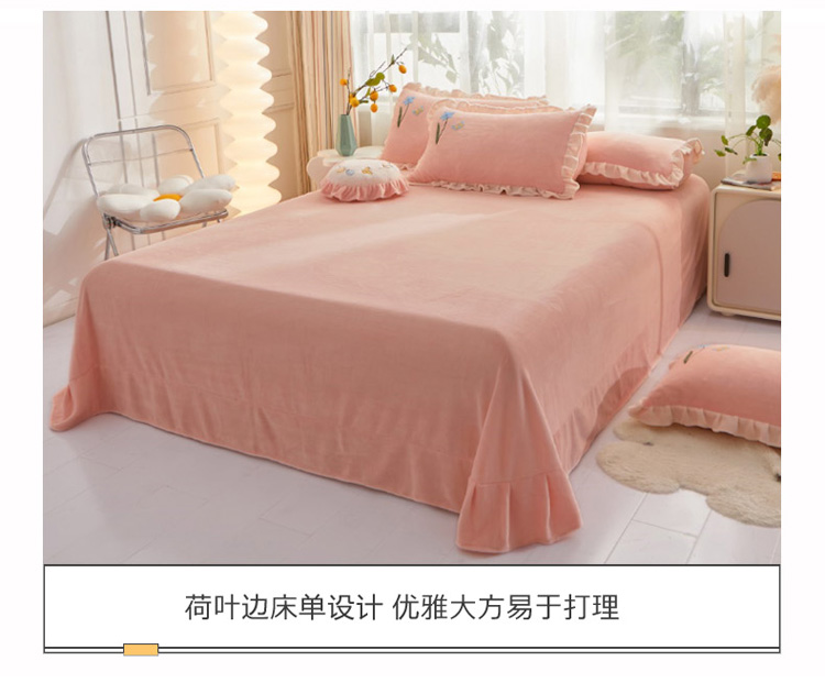 商品名称:恋佳 2023新款加厚牛奶绒荷叶边毛巾绣四件套 轻盈玉色
