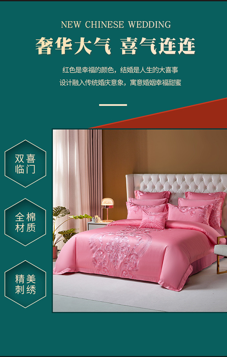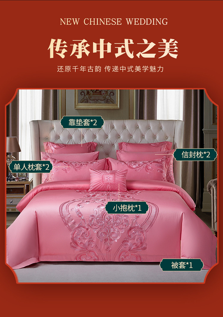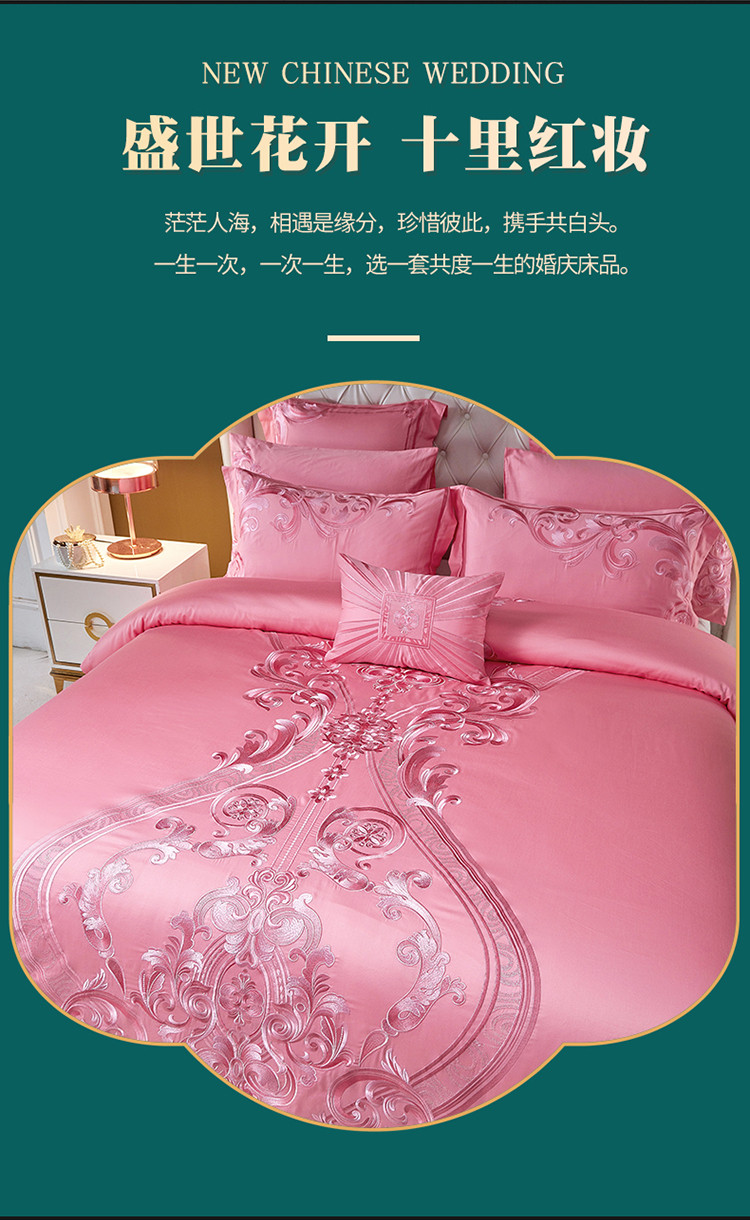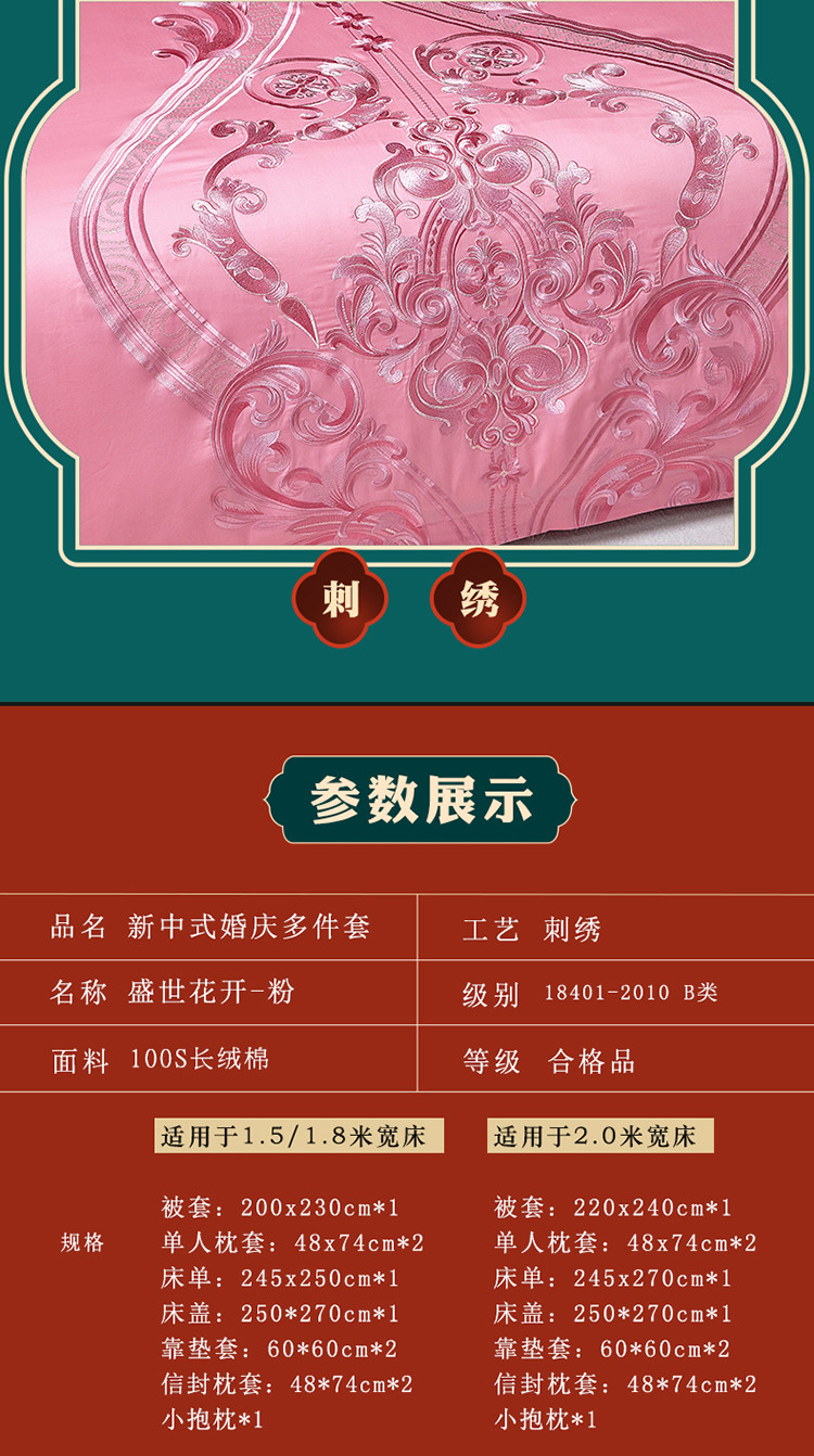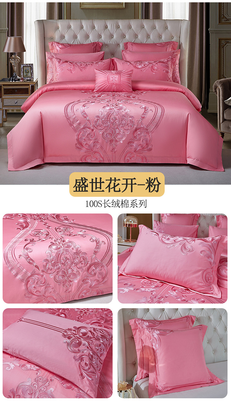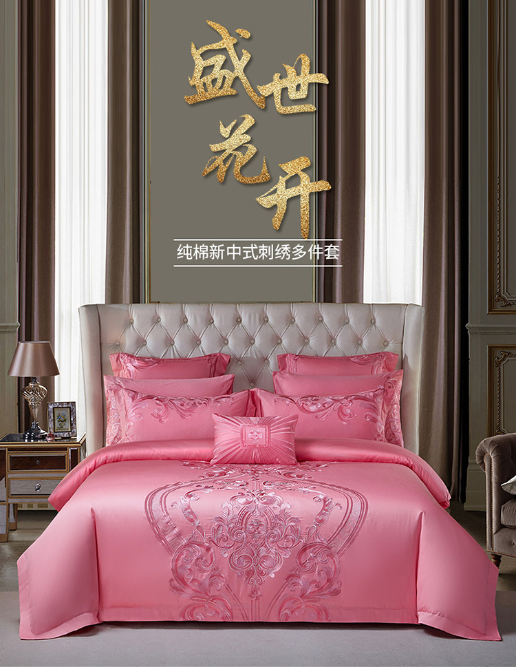 当前位置: 91家纺网 > 商品网购 > 床品套件 > 多件套 > 多件套 > 红番天新款全棉提花贡缎澳棉提花中式精美苏绣多件套盛世花开-粉
