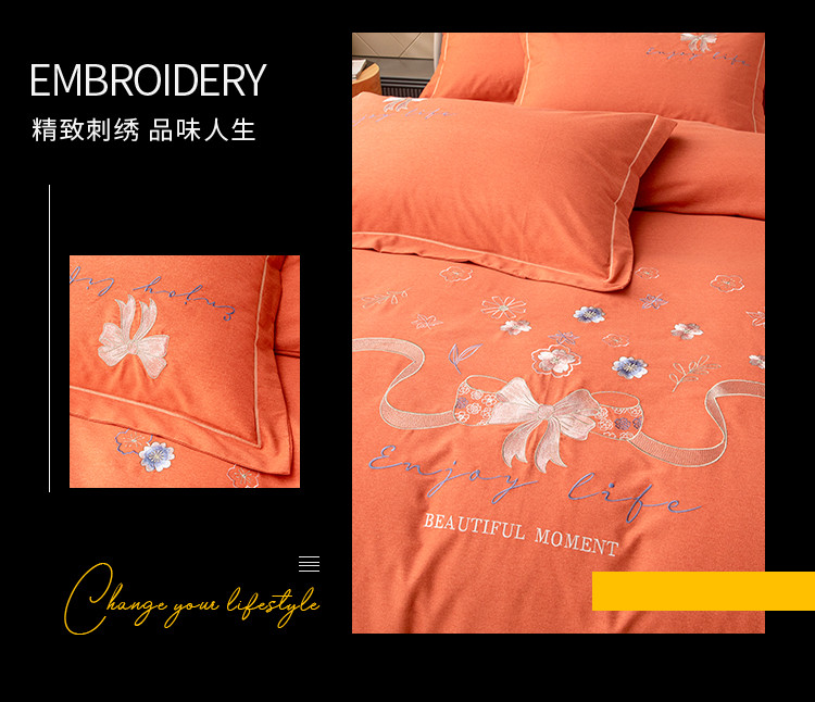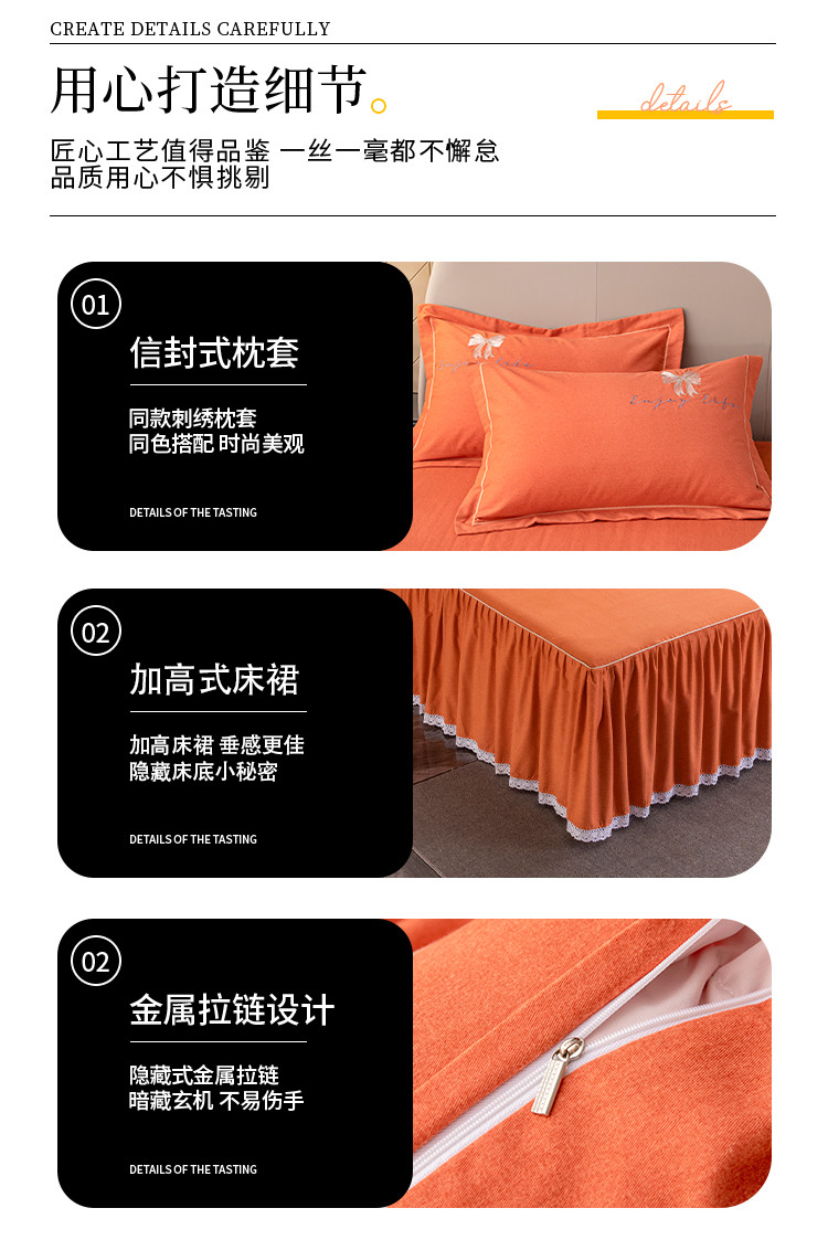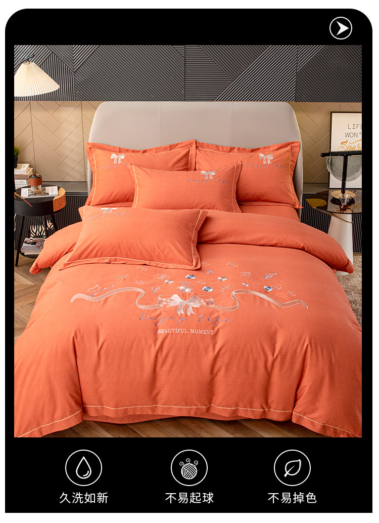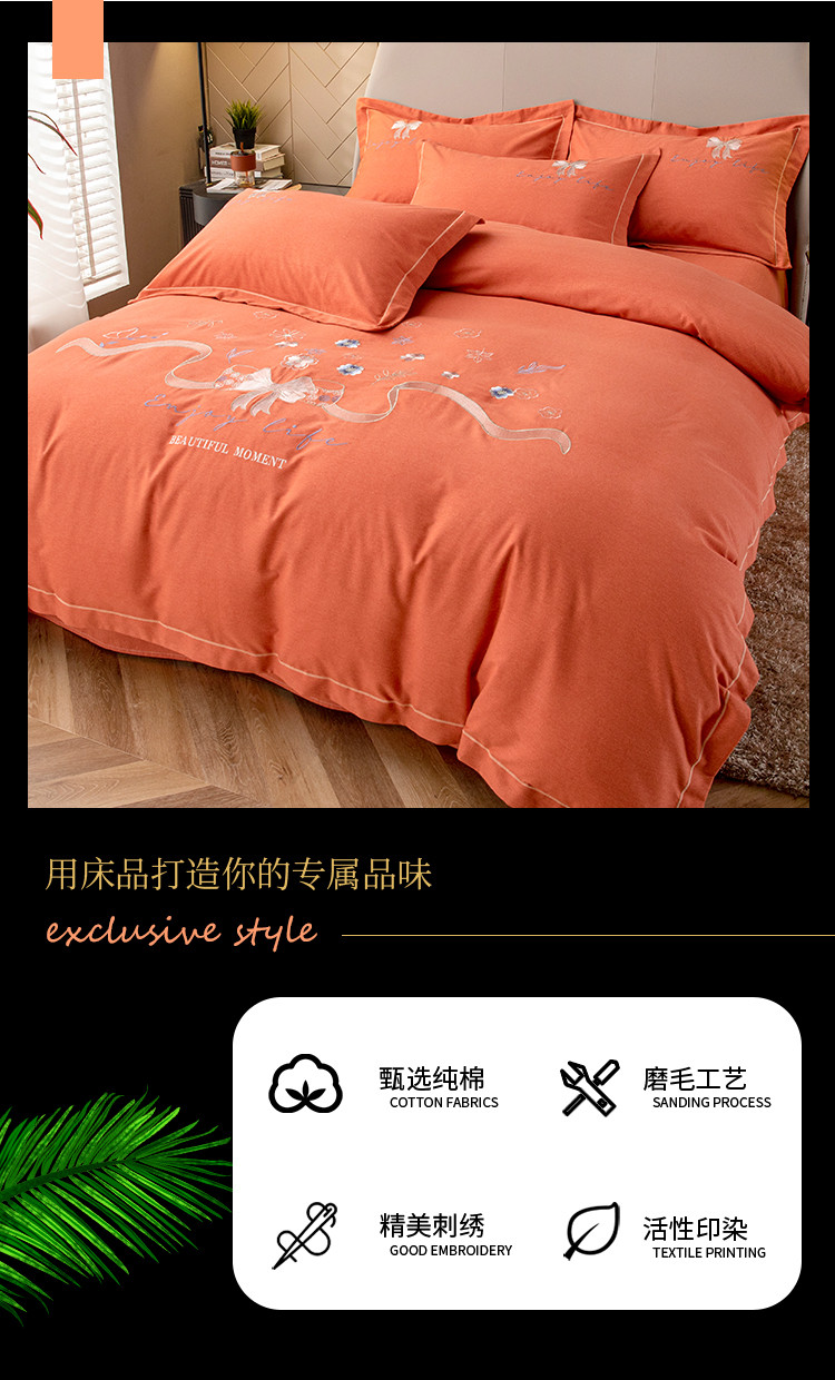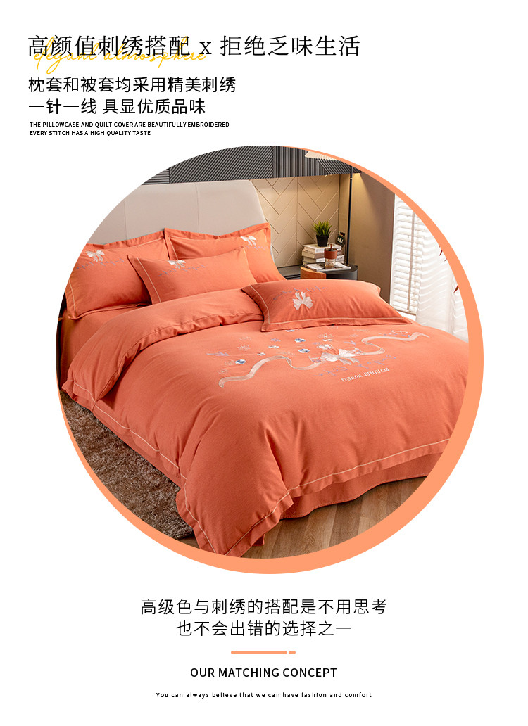 商品名称:纽缦 2022新款纯棉加厚纯色绣花款床裙四件套 蝶恋花爱马橙