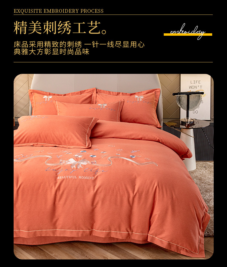 纽缦 2022新款纯棉加厚纯色绣花款床裙四件套 蝶恋花爱马橙