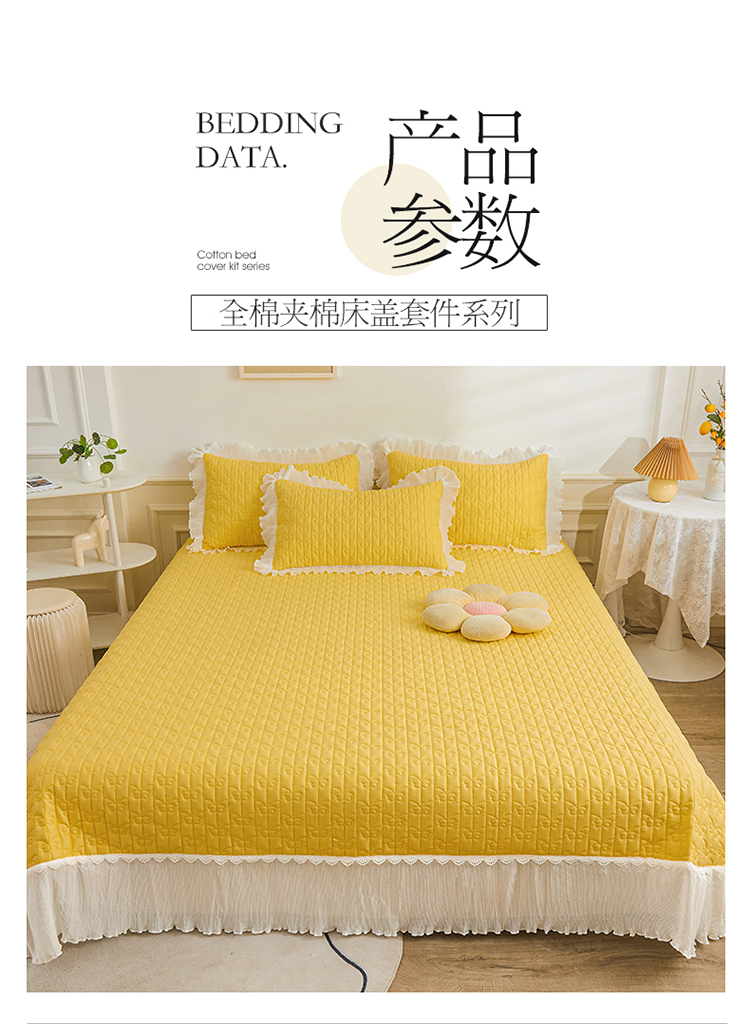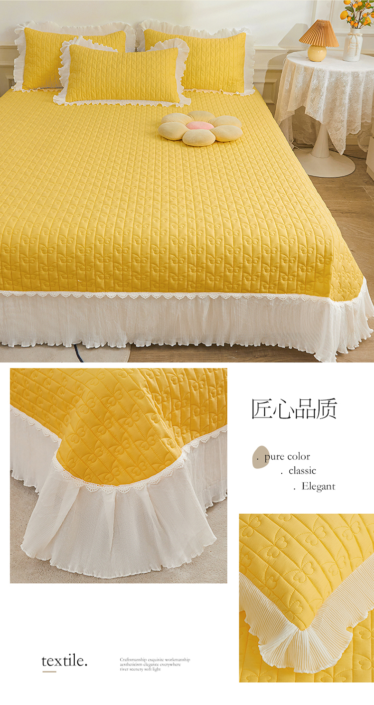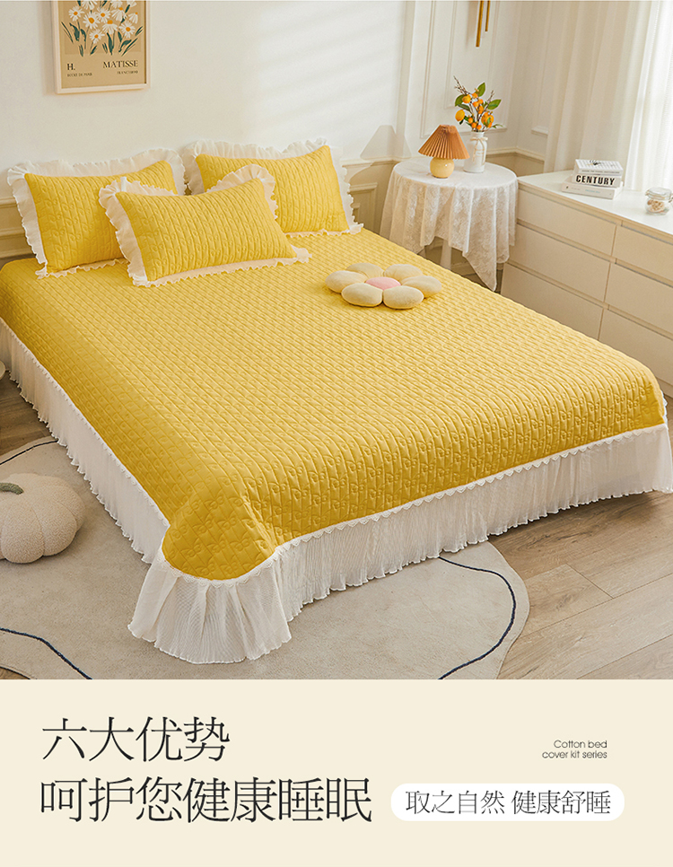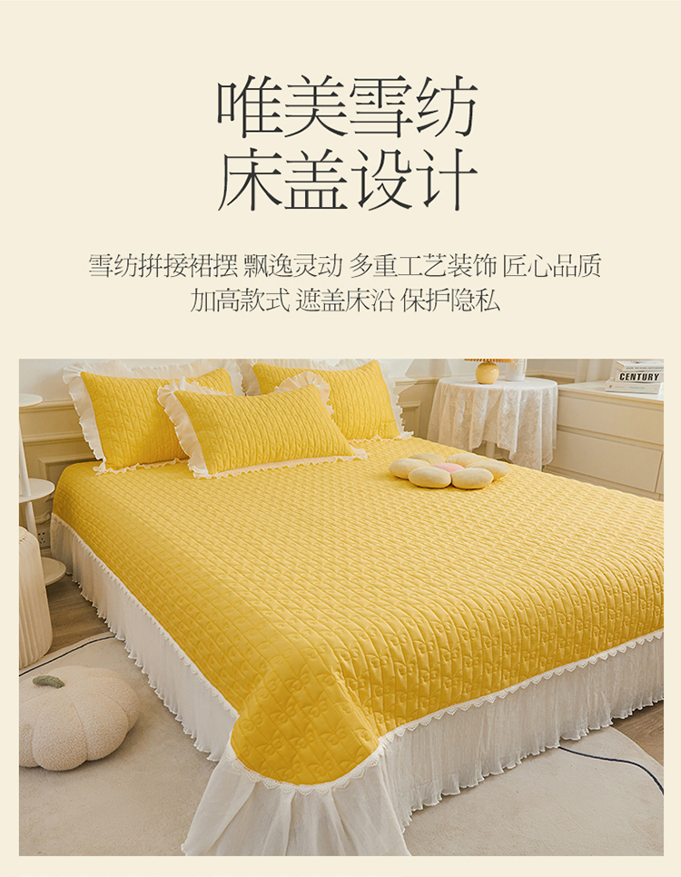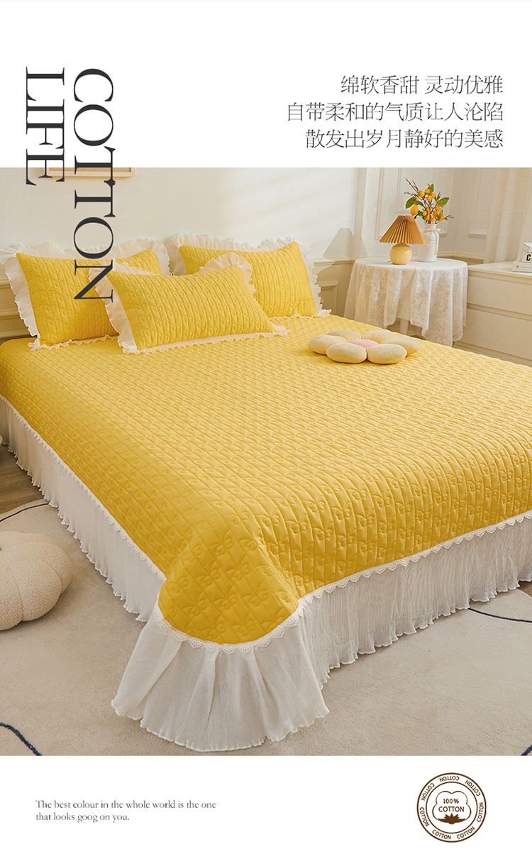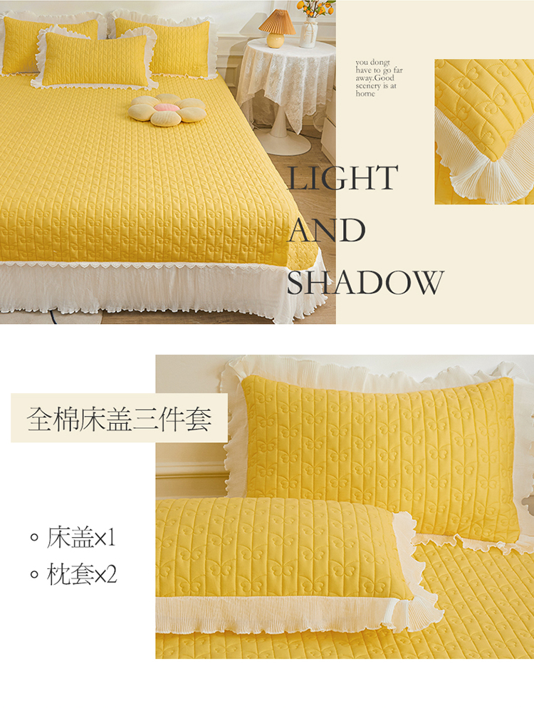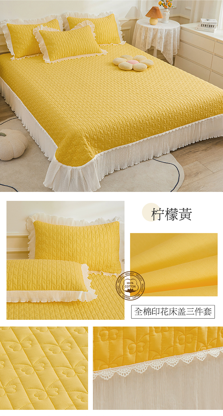 当前位置: 91家纺网 > 商品网购 > 床品套件 > 四件套 > 全棉普通四件套 > 宜凡家纺 2023新款全棉花边床盖三四件套 柠檬黄
