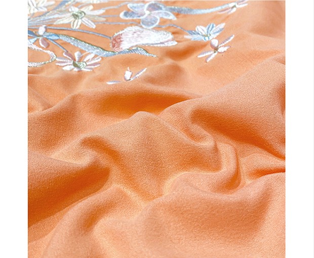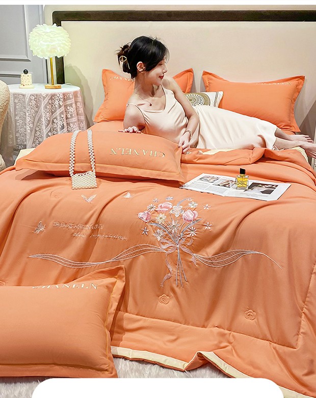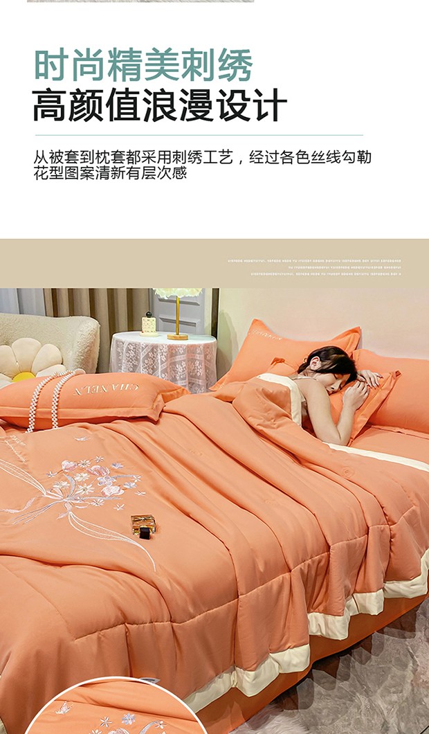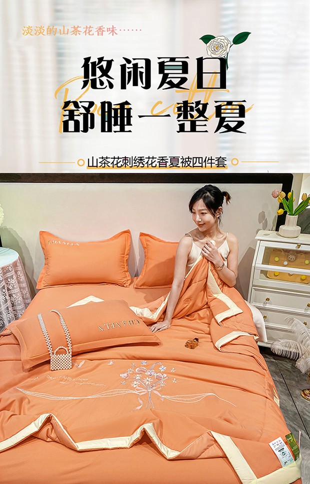 商品名称:2023苏米娜刺绣山茶花香夏被四件套天丝棉麻双层纱磨毛纯棉夏凉空调夏被 花香伊人-橙