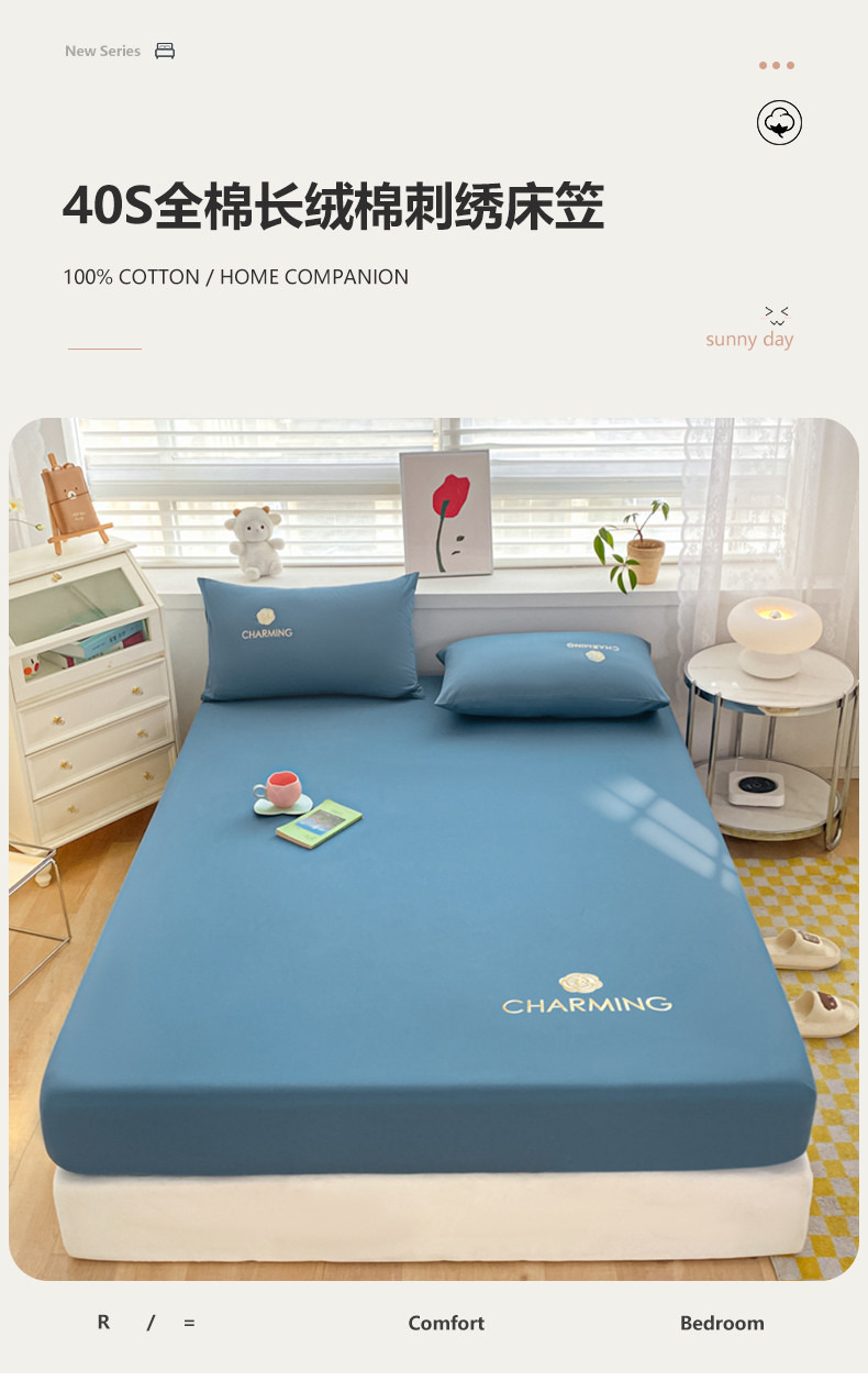 • 91家纺网 家纺一手货源 找家纺 暖季 2025新款40长绒棉刺绣款单床笠山茶花系列 山茶花-宾利蓝