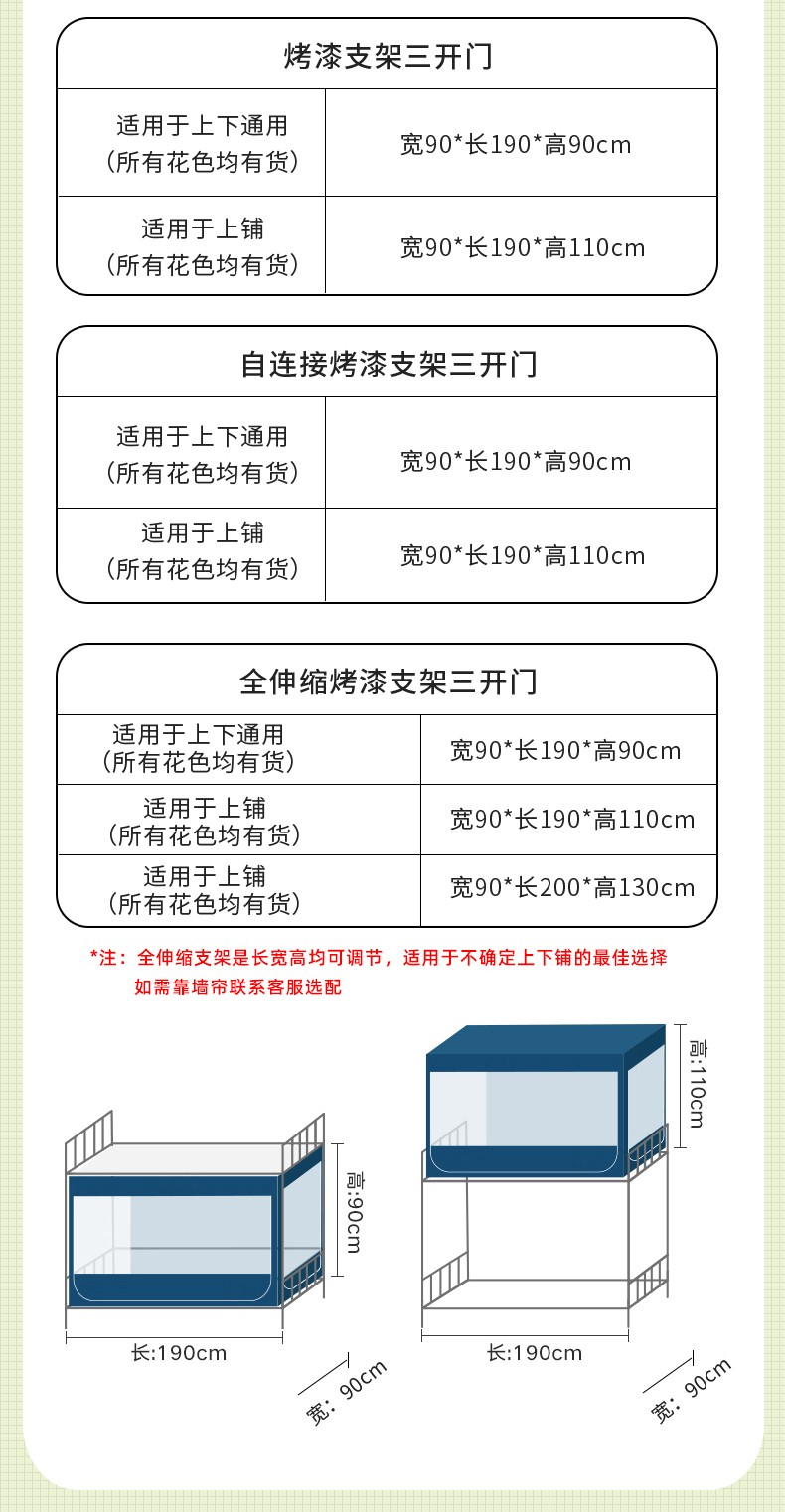 90*190*90三开门 上下铺通用 全伸缩烤漆支架 | ¥100.00 |