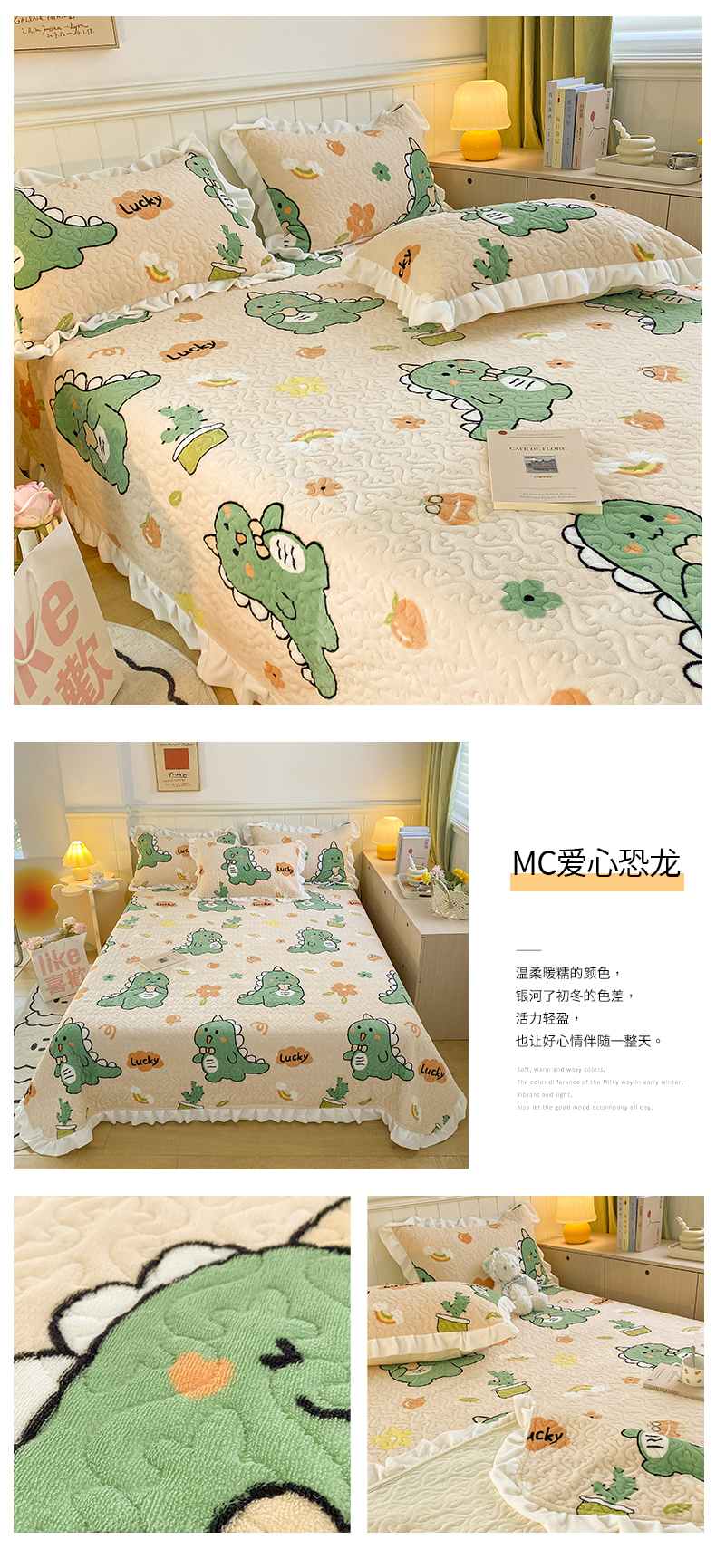 沐辰家居2023新款牛奶绒印花床盖 MC爱心恐龙