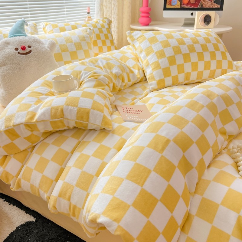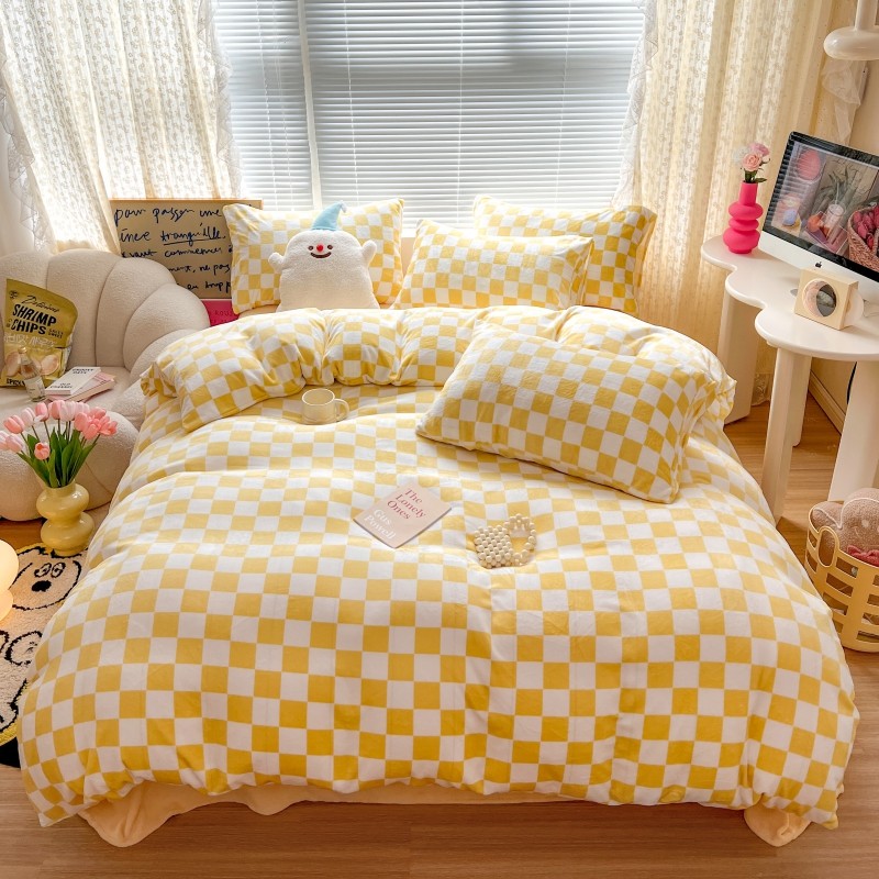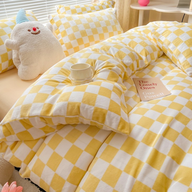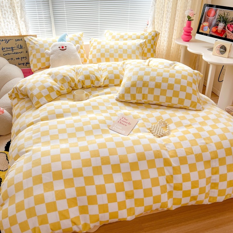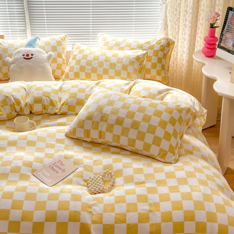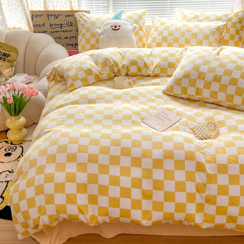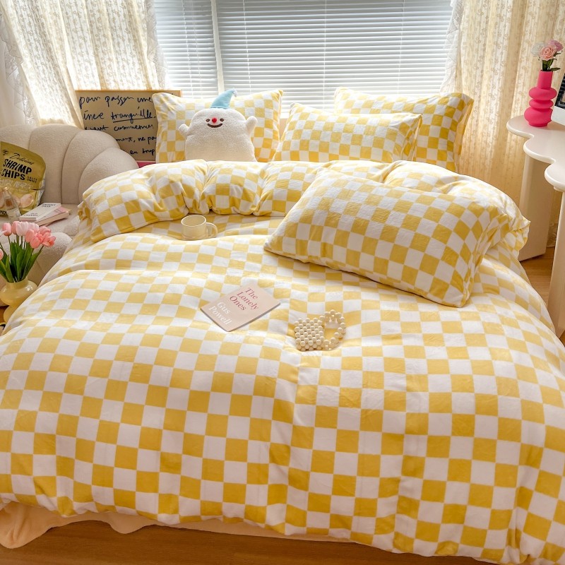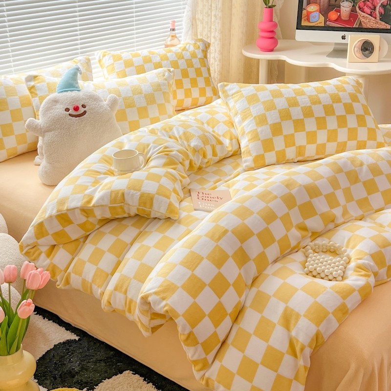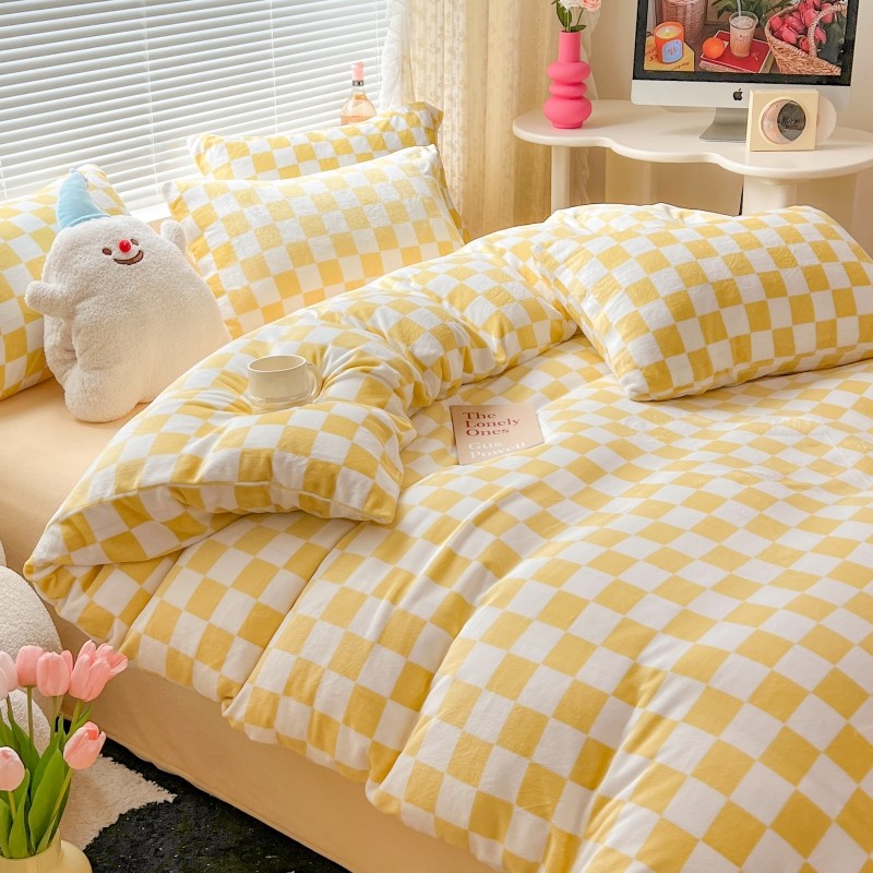 顾里 2023新款ins少女保暖牛奶绒奶油治 愈系四件套第 一批 棋盘格黄