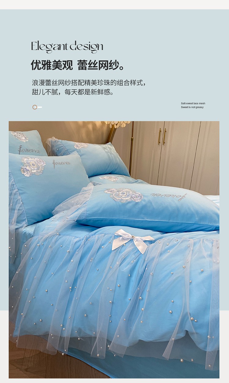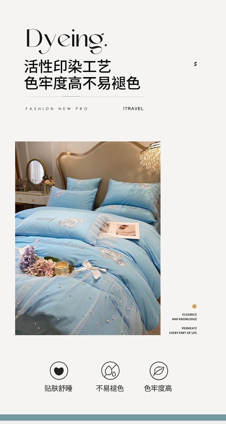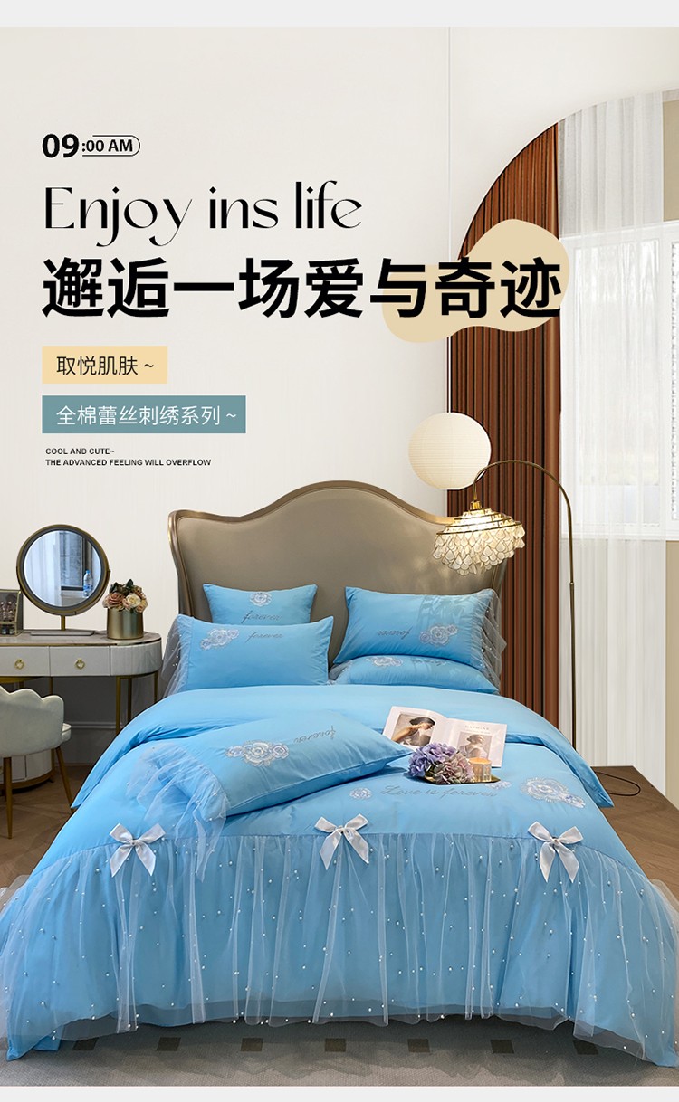 欧冠 2023新款秋冬保暖60S全棉蕾丝刺绣丽丽贝尔系列四件套 马卡龙蓝