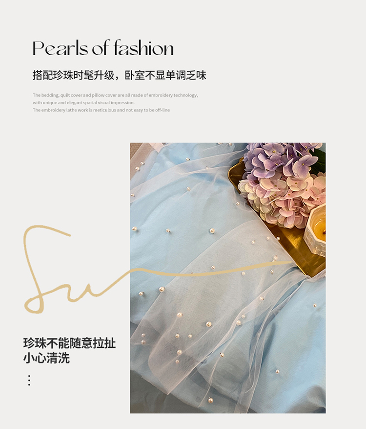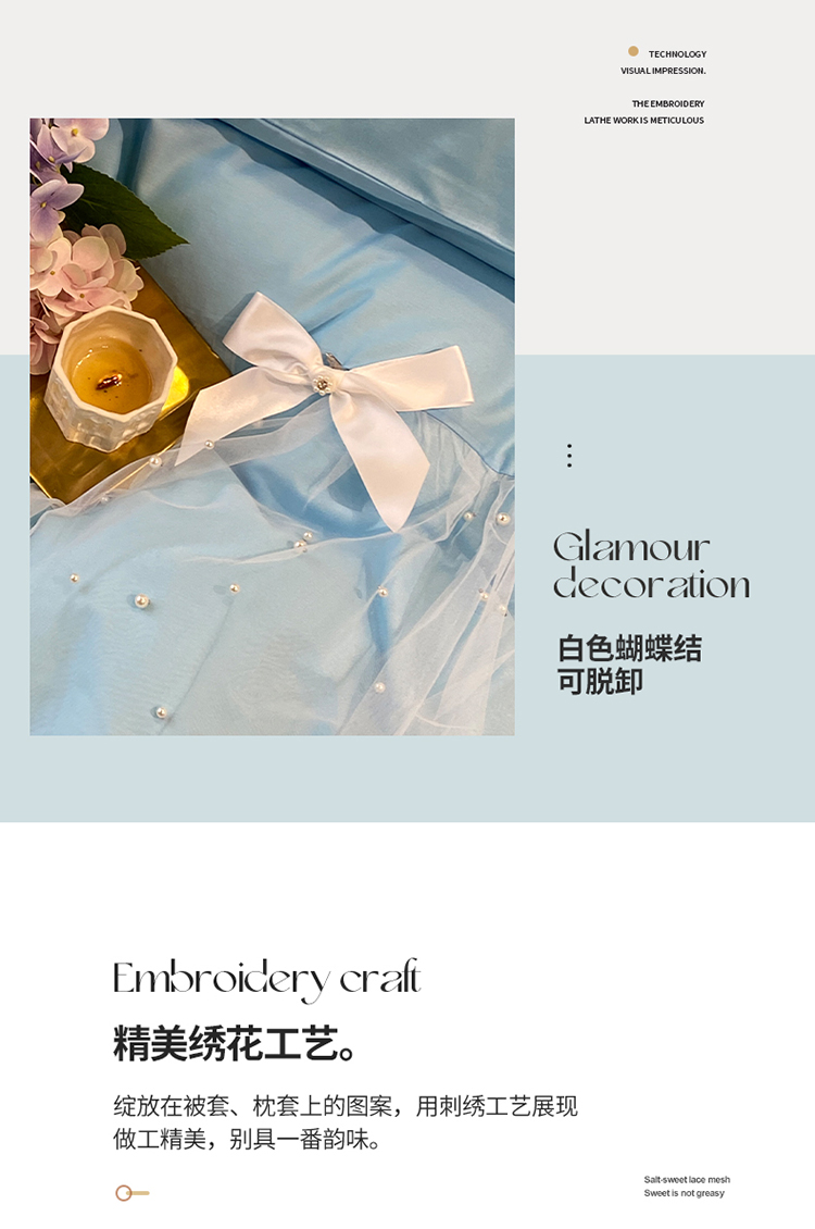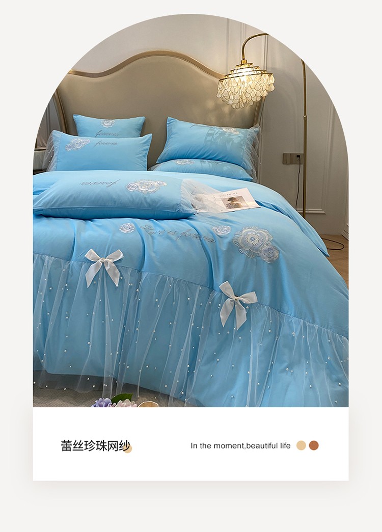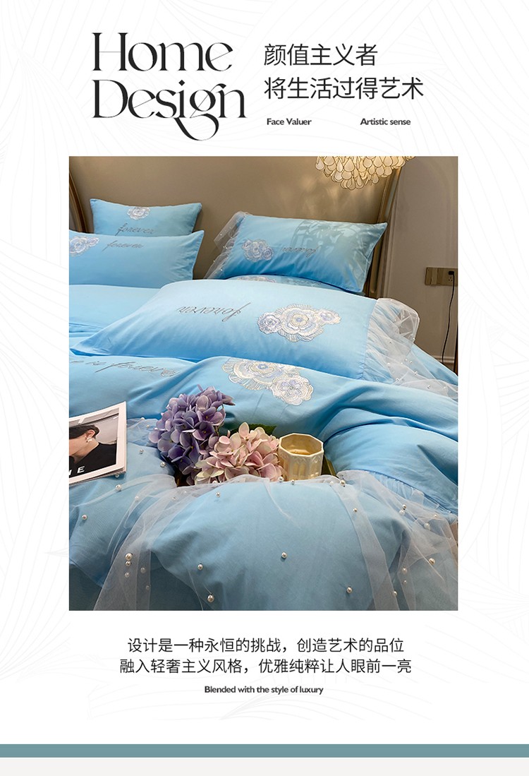 商品名称:欧冠 2023新款秋冬保暖60S全棉蕾丝刺绣丽丽贝尔系列四件套 马卡龙蓝