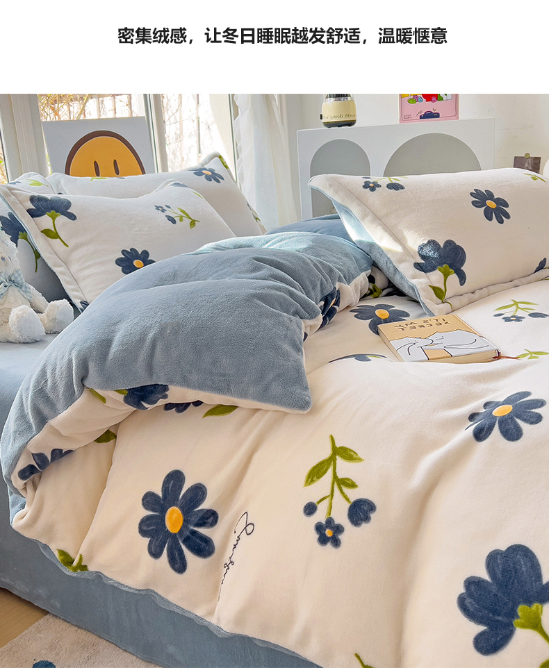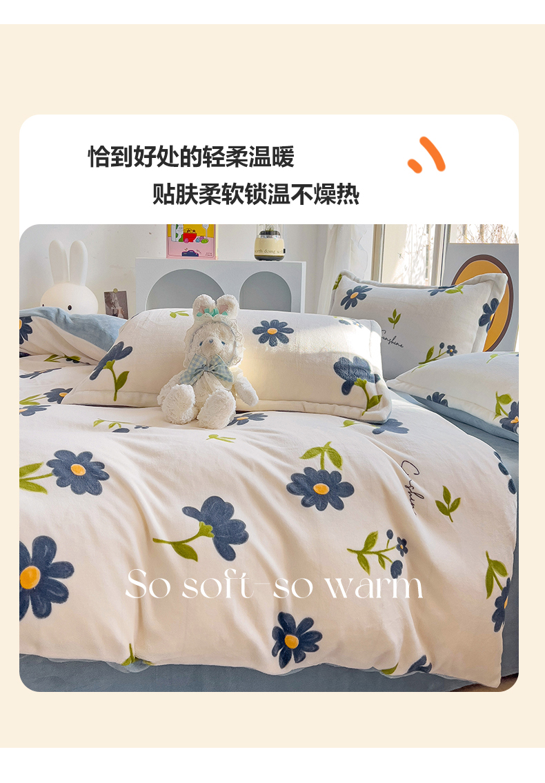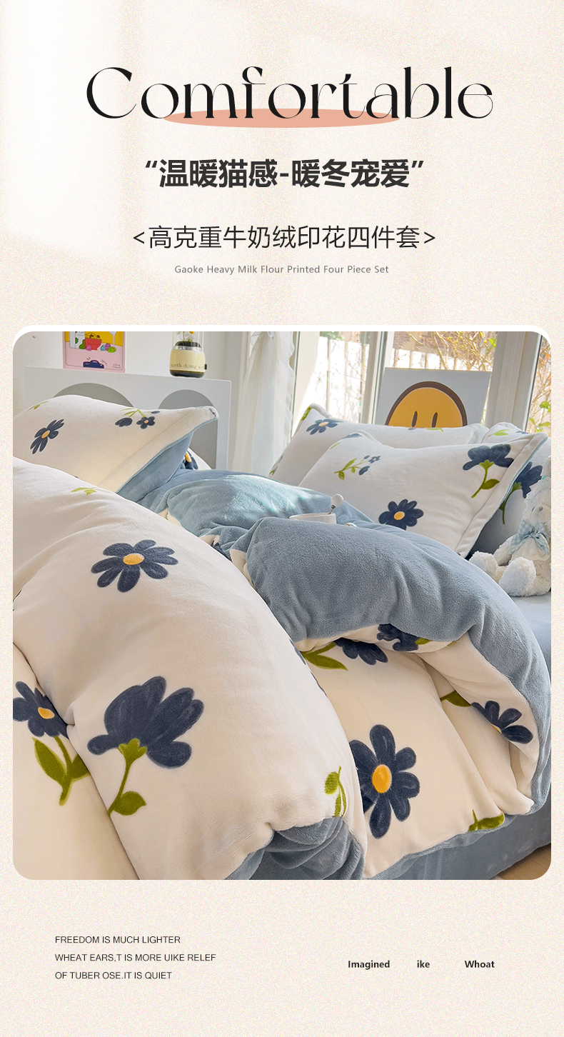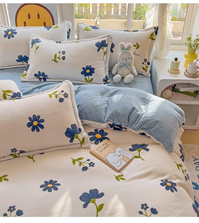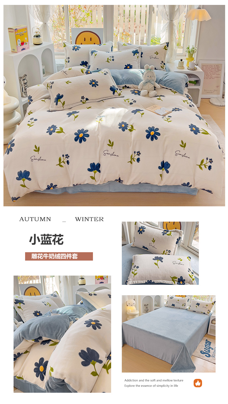 当前位置: 91家纺网 > 商品网购 > 床品套件 > 四件套 > 牛奶绒四件套 > 包小包 2023直播爆款220g高克重印花小清新牛奶绒四件套 小蓝花