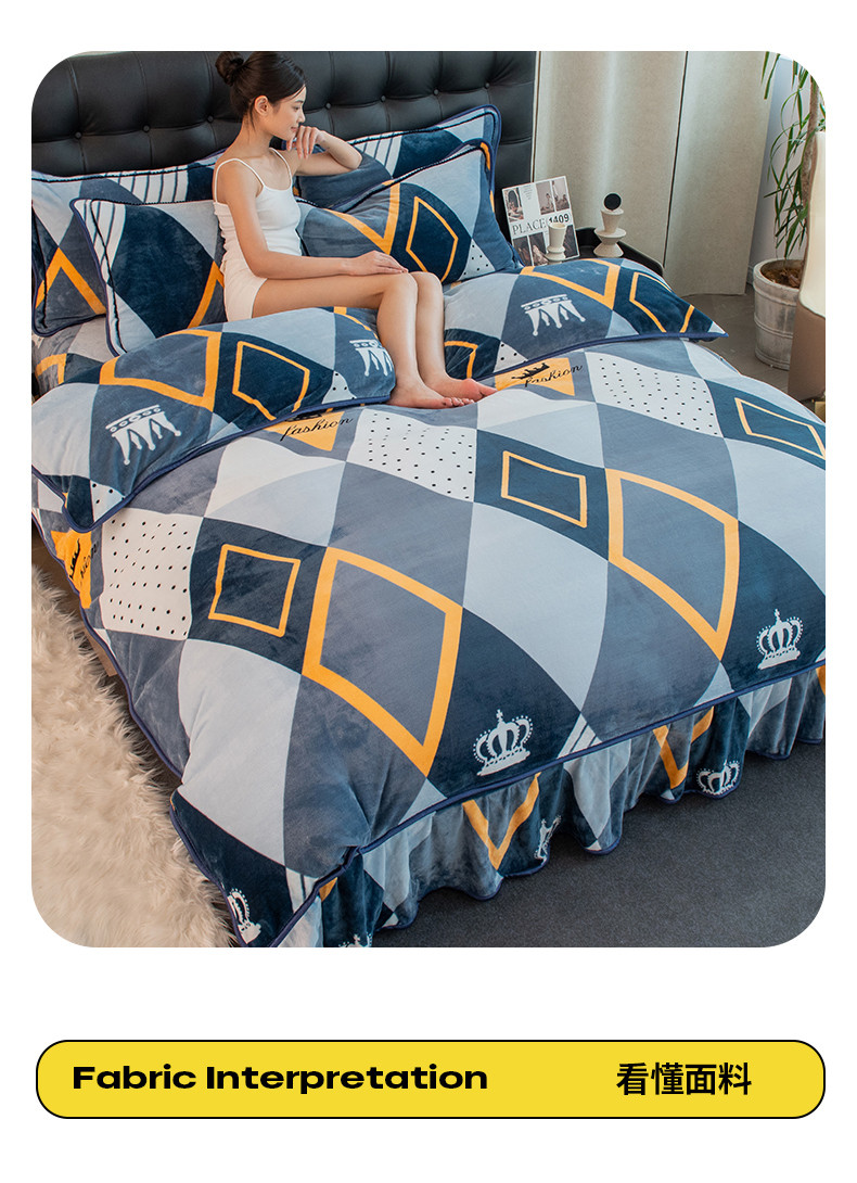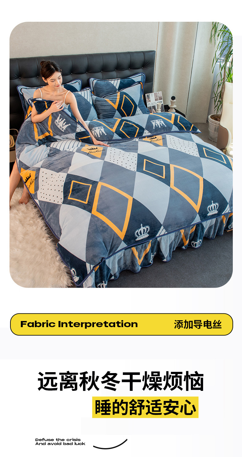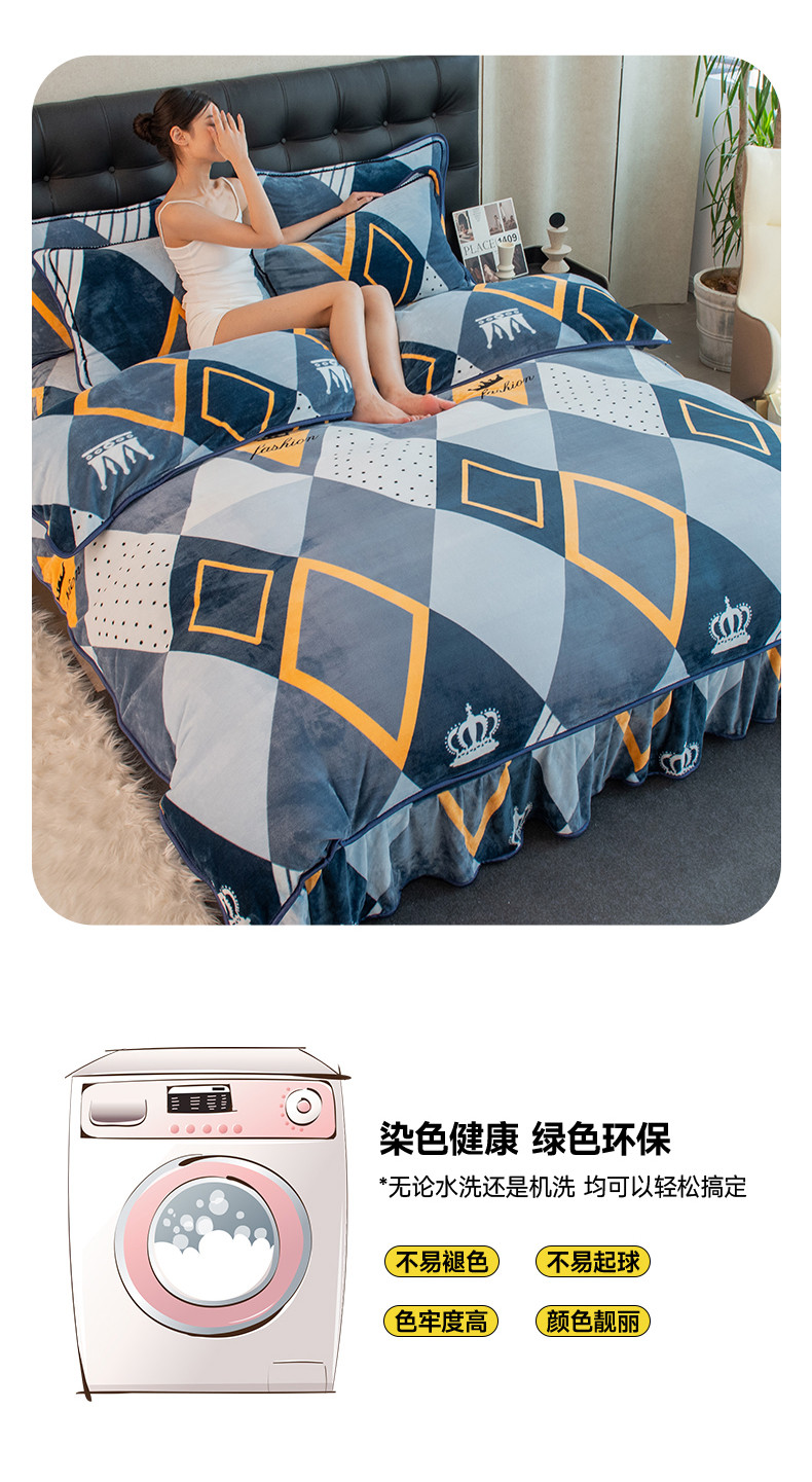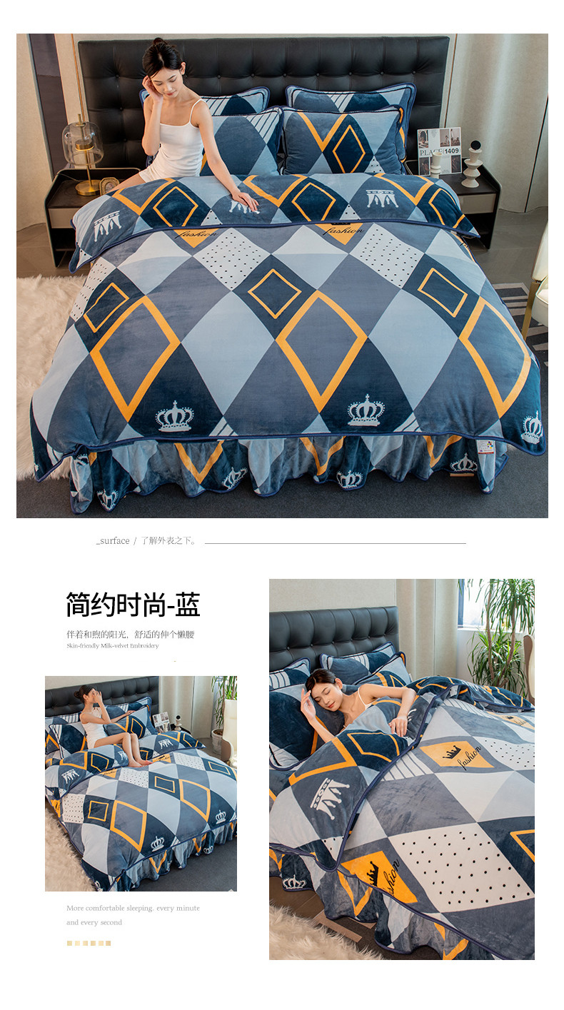 商品名称:2024印花8.5斤牛奶绒金貂水晶法莱珊瑚绒四件套床裙款 简约时尚-蓝
