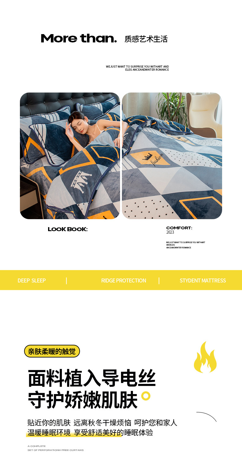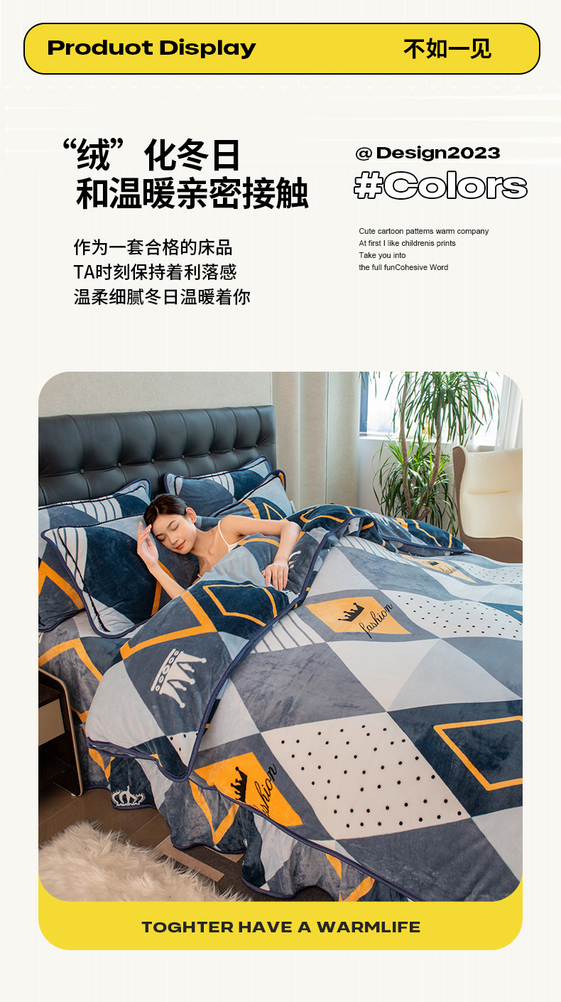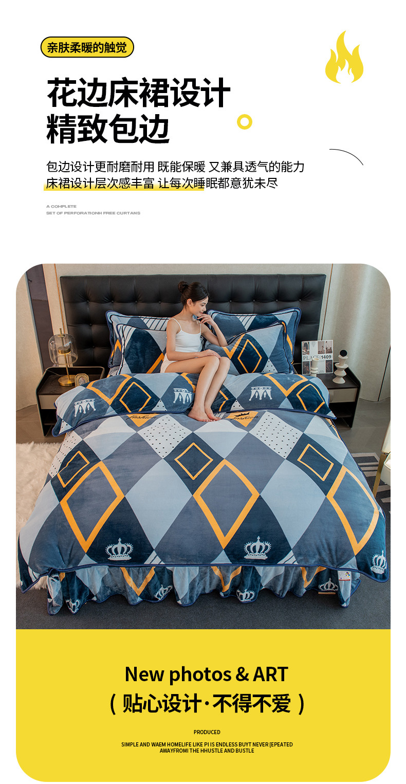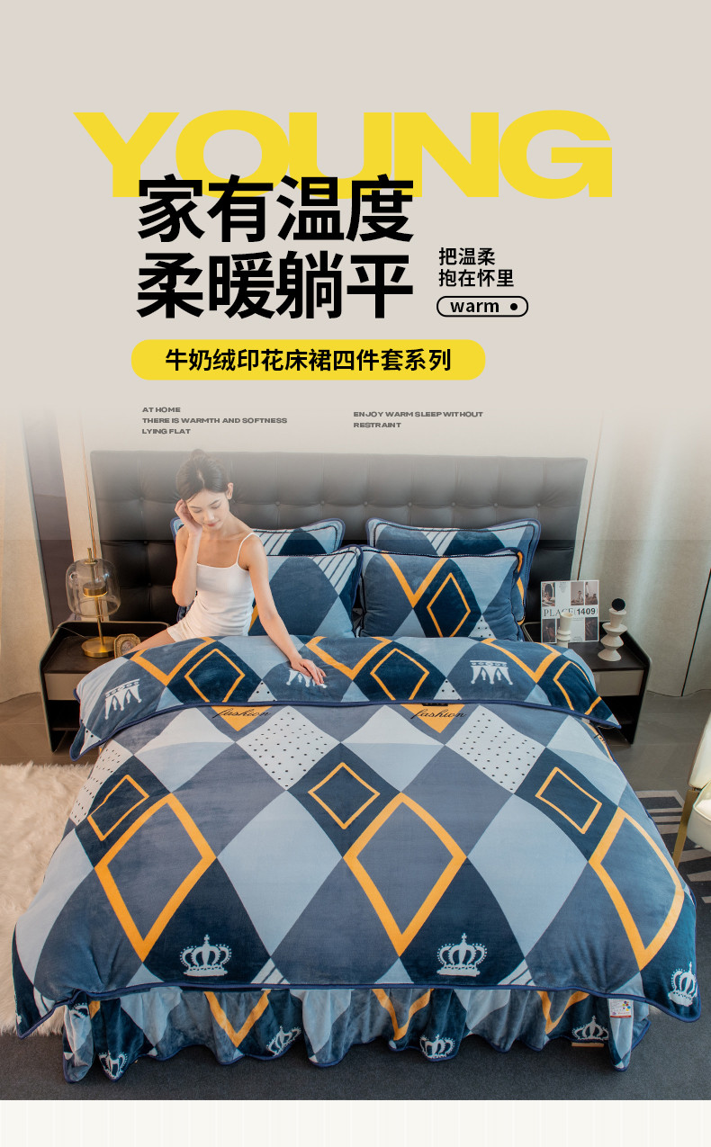 商品名称:2024印花8.5斤牛奶绒金貂水晶法莱珊瑚绒四件套床裙款 简约时尚-蓝