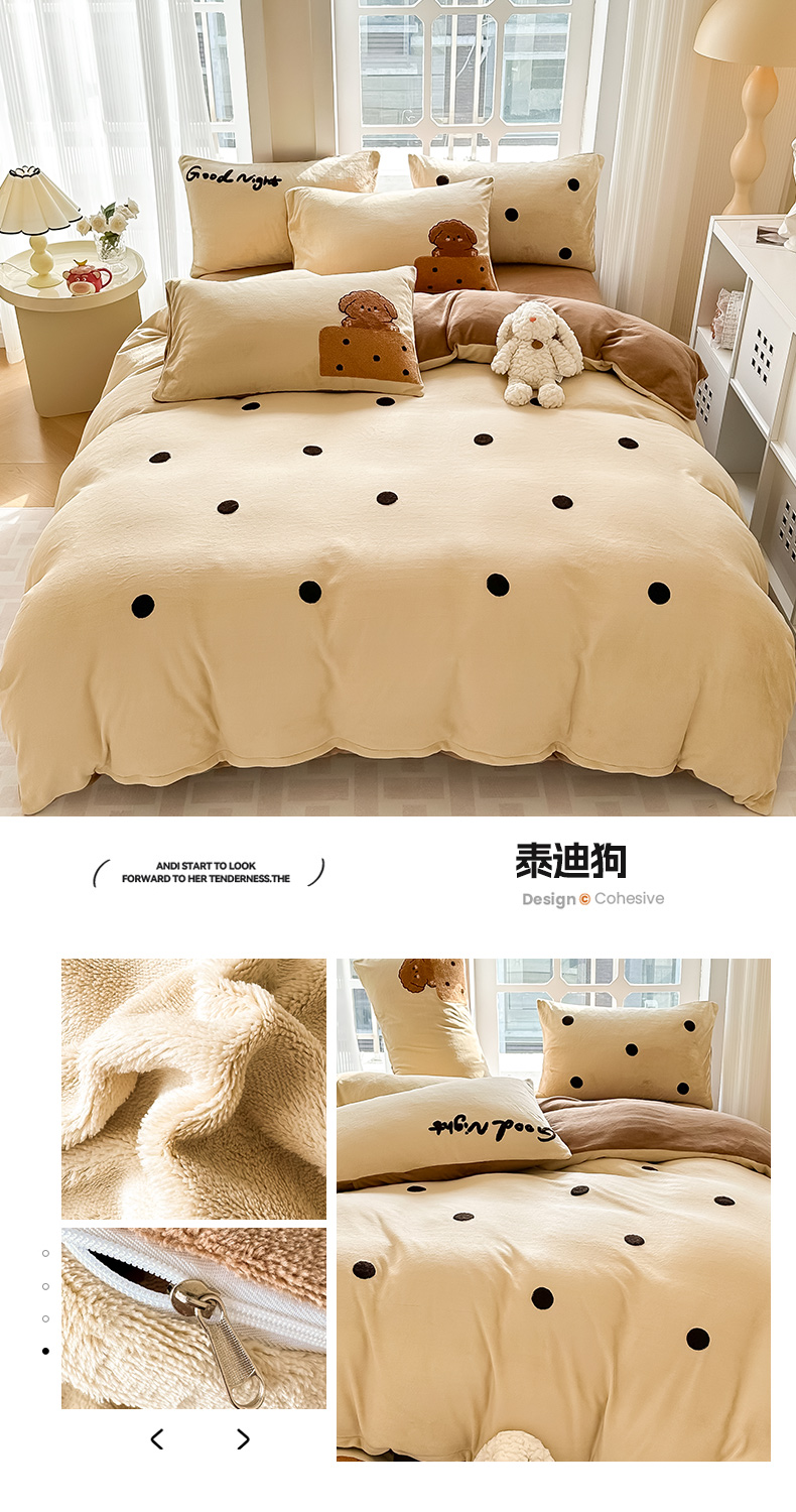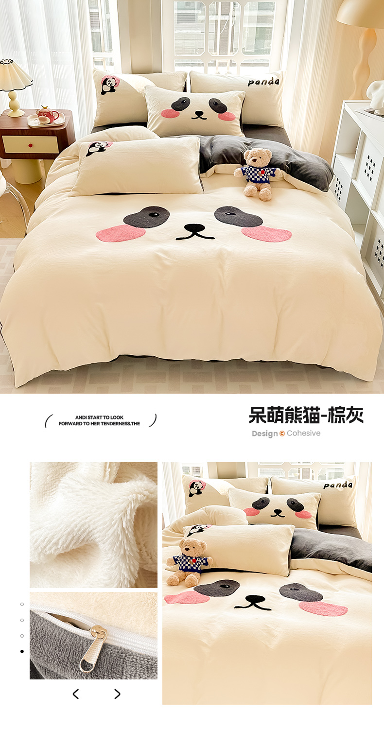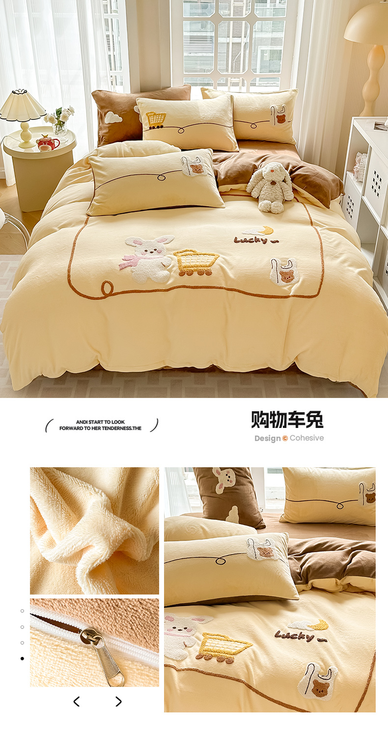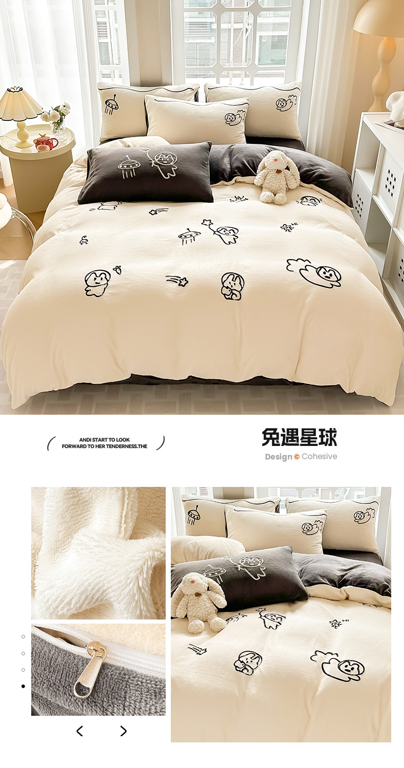 (总)眠屿家纺 2025新款加厚牛奶绒毛巾绣四件套,乐趣,面包狗,玩偶,玩泡泡