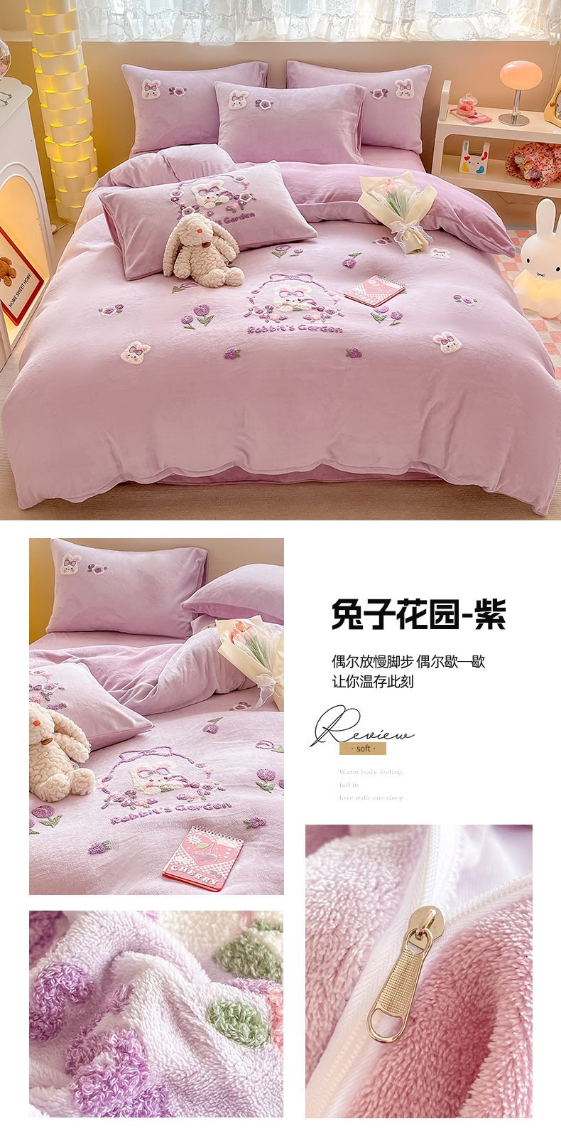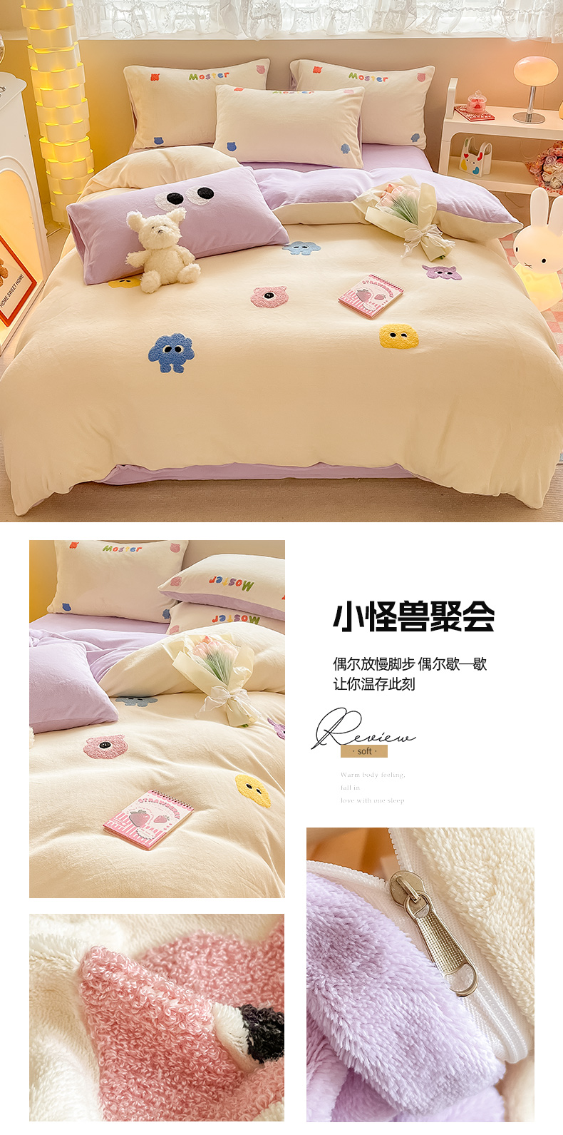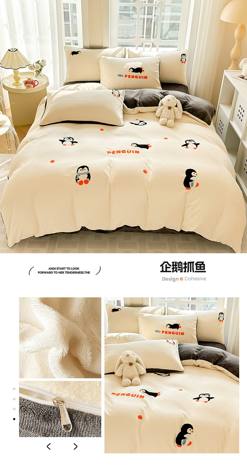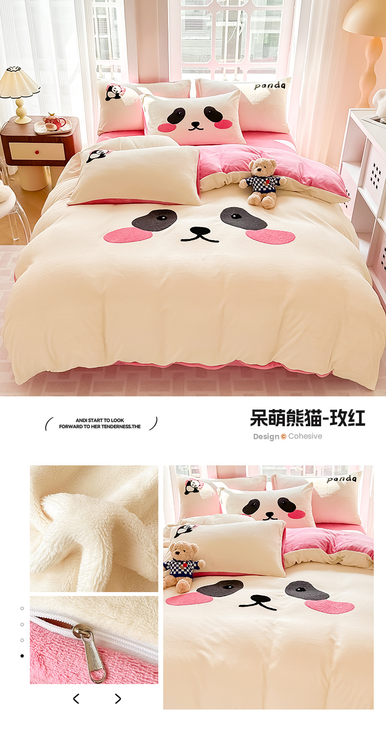 (总)眠屿家纺 2025新款加厚牛奶绒毛巾绣四件套,乐趣,面包狗,玩偶,玩泡泡