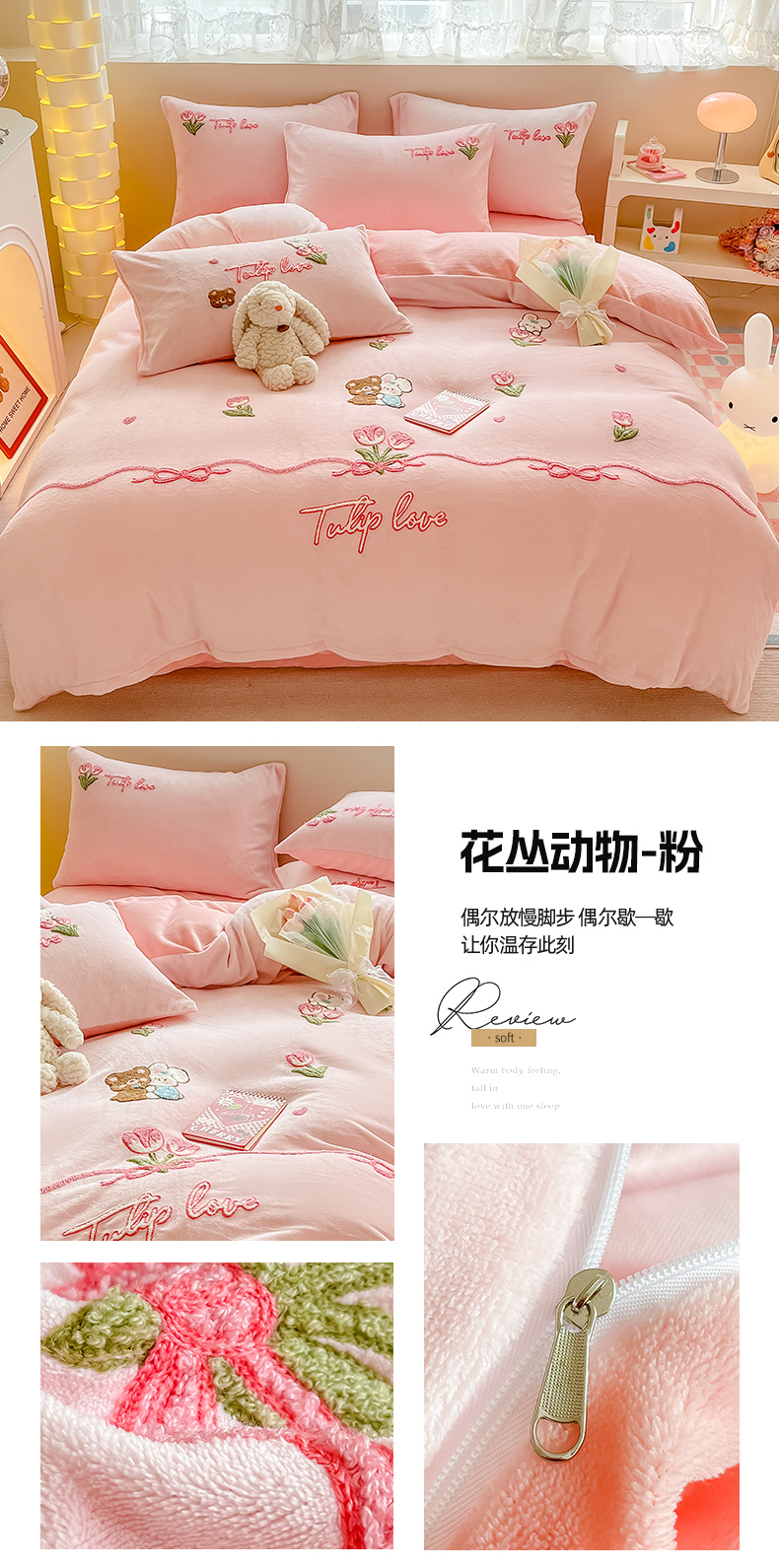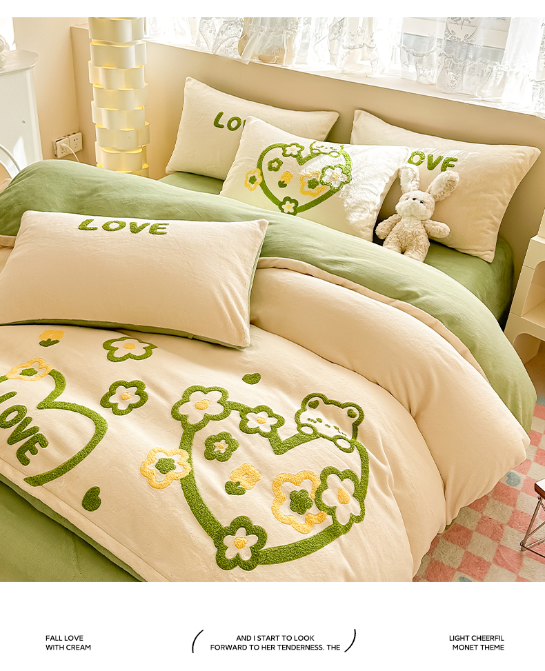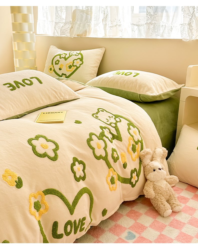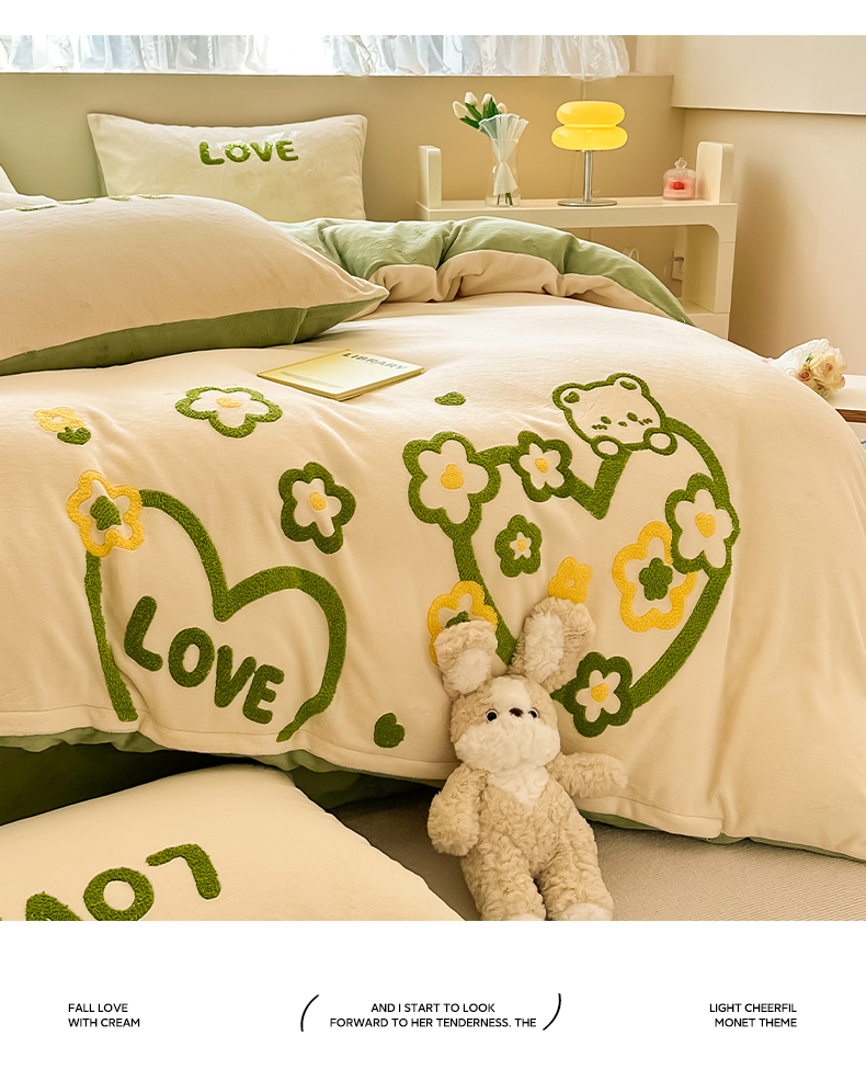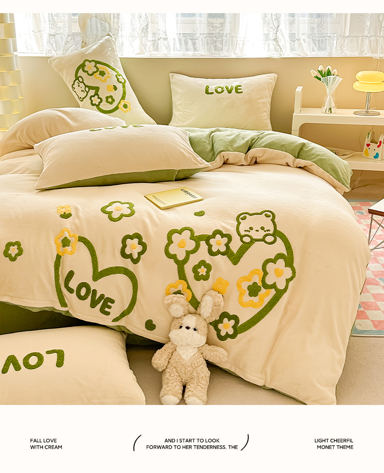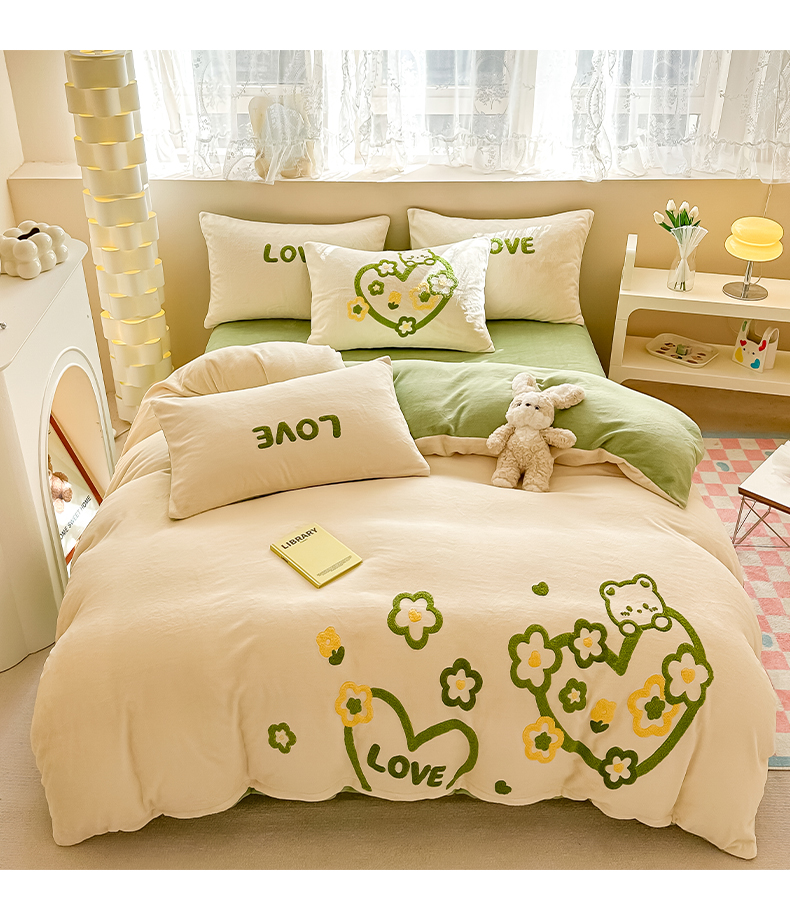 (总)眠屿 2022新款韩国绒绣花四件套-爱心熊,宝石蓝,豆沙粉,芥末绿,奶茶咖