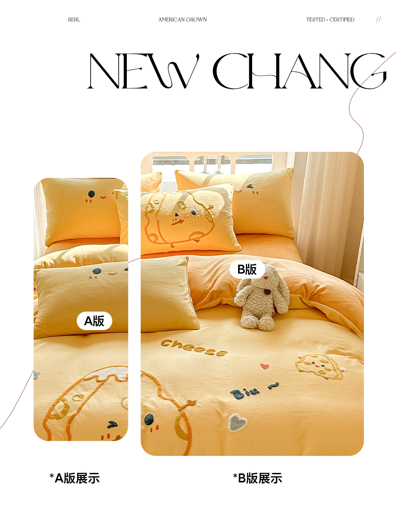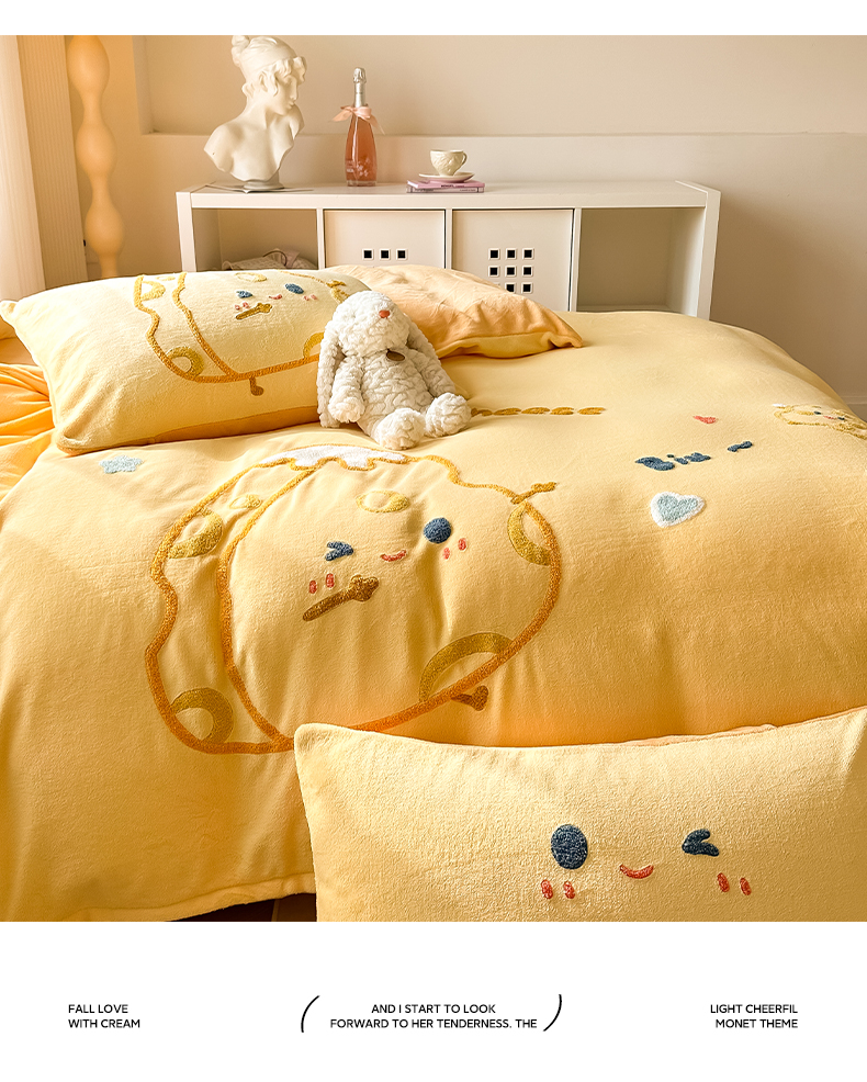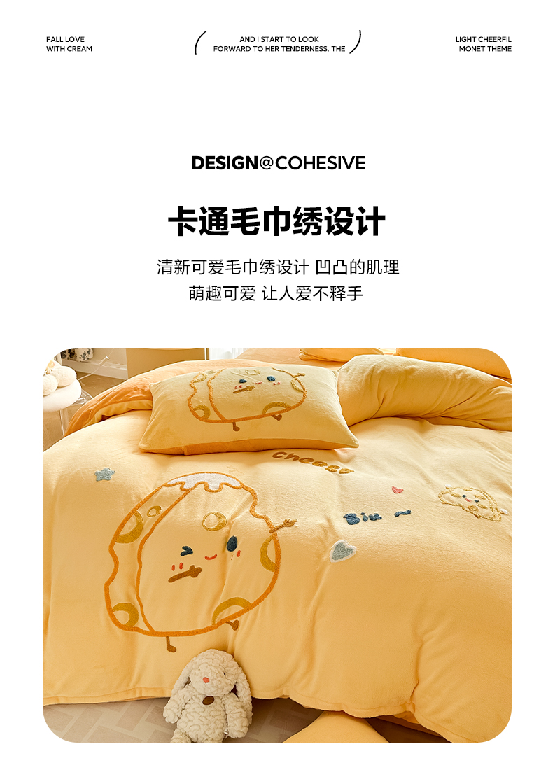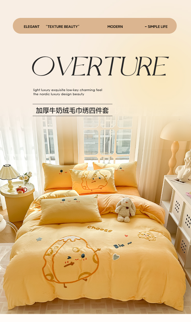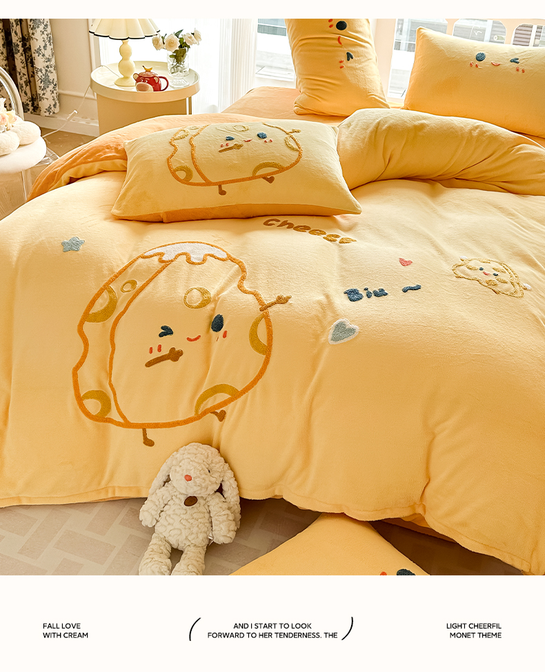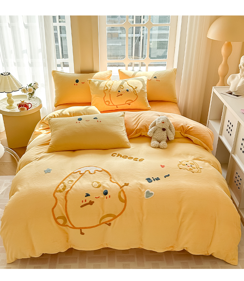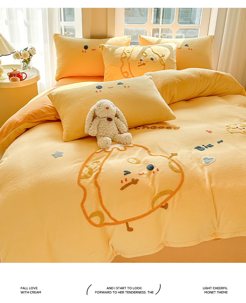 当前位置: 91家纺网 > 商品网购 > 床品套件 > 四件套 > 牛奶绒四件套 > 眠屿家纺 2023新款牛奶绒毛巾绣四件套(温馨版) 调皮芝士(场景1)