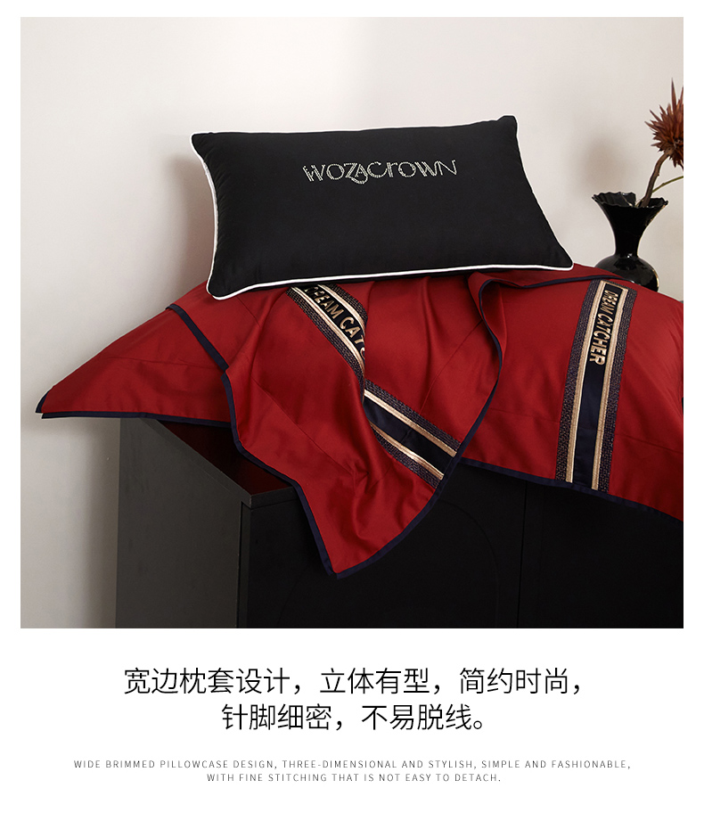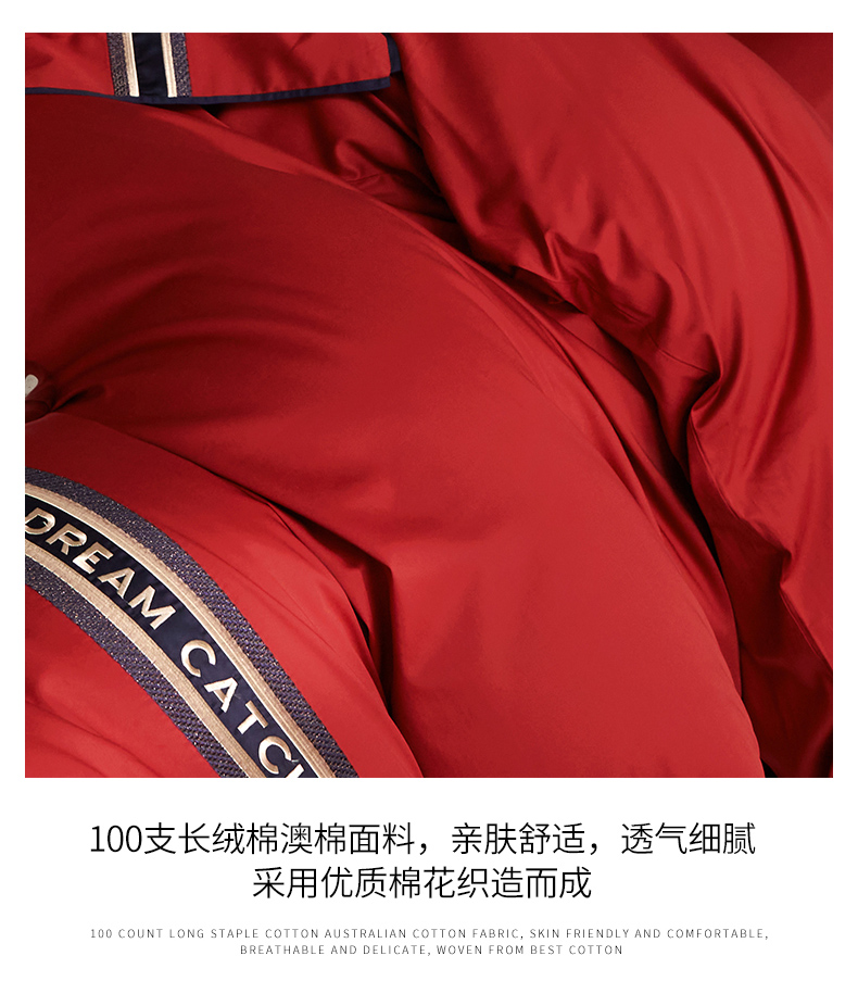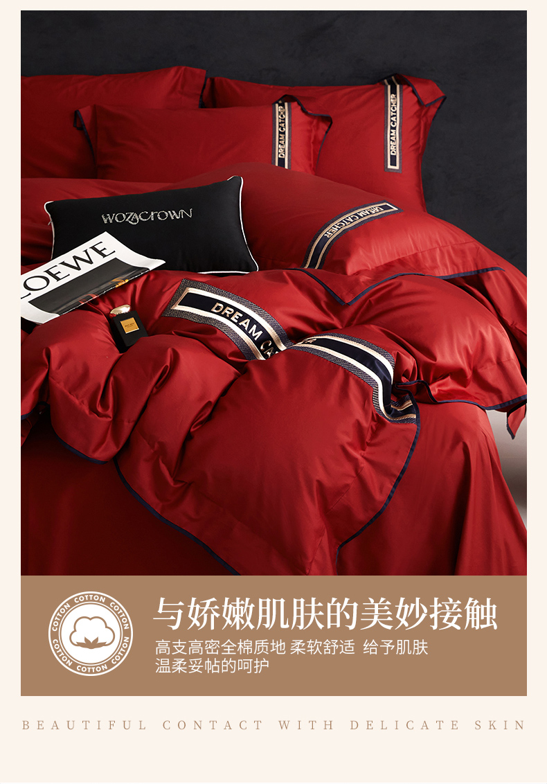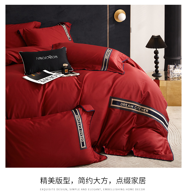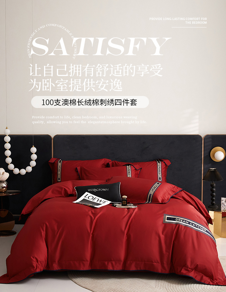 商品名称:爱缦 2024新款100支澳棉CR工艺极简轻奢刺绣四件套-茹伊 风格二 汐云红