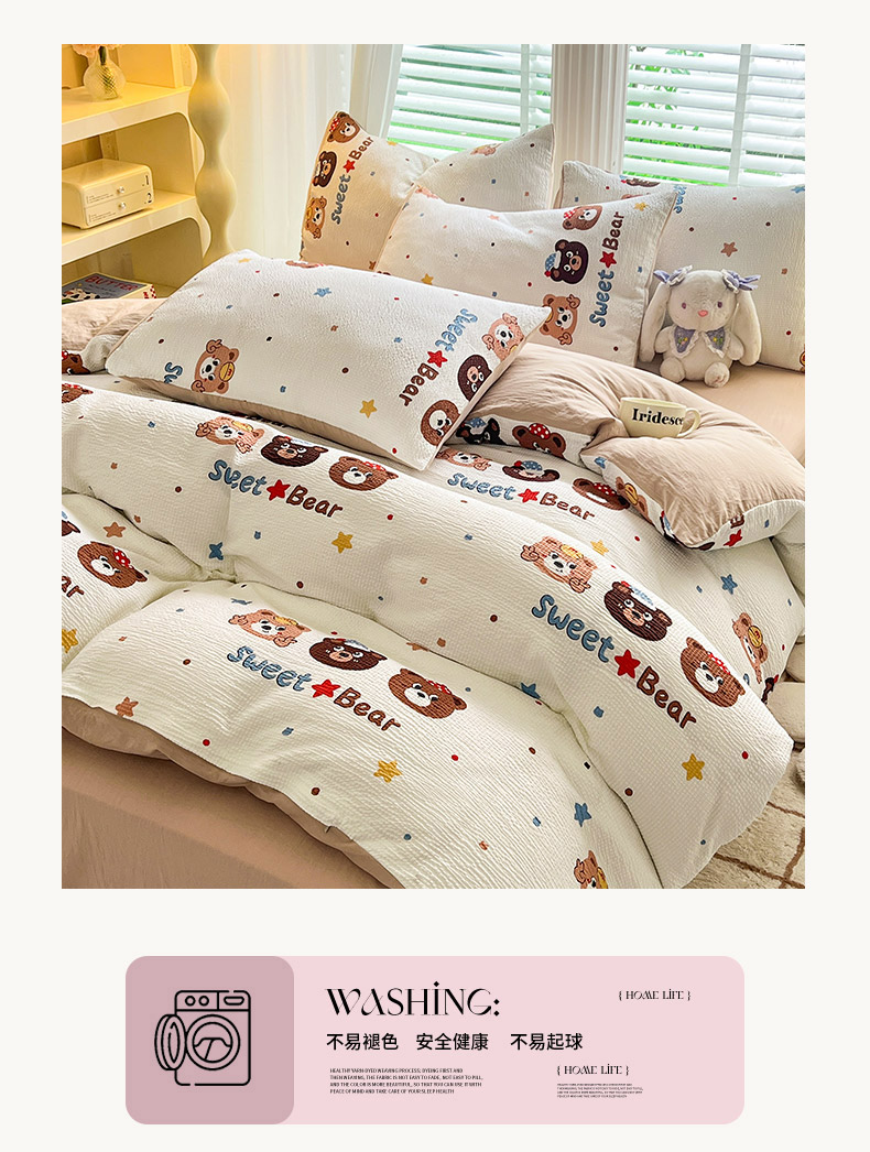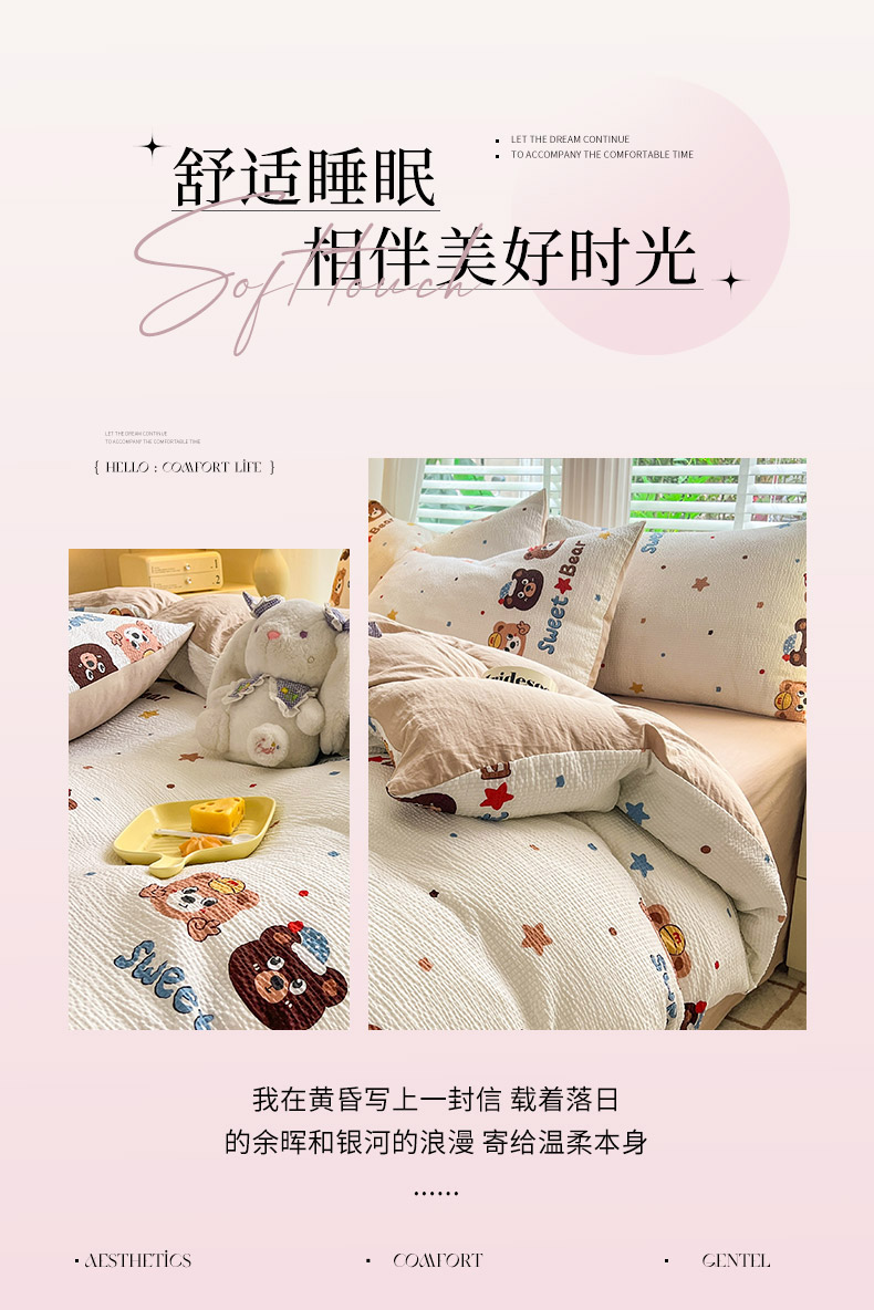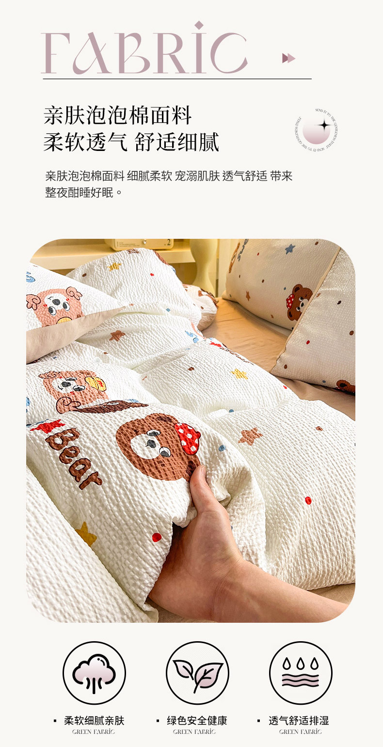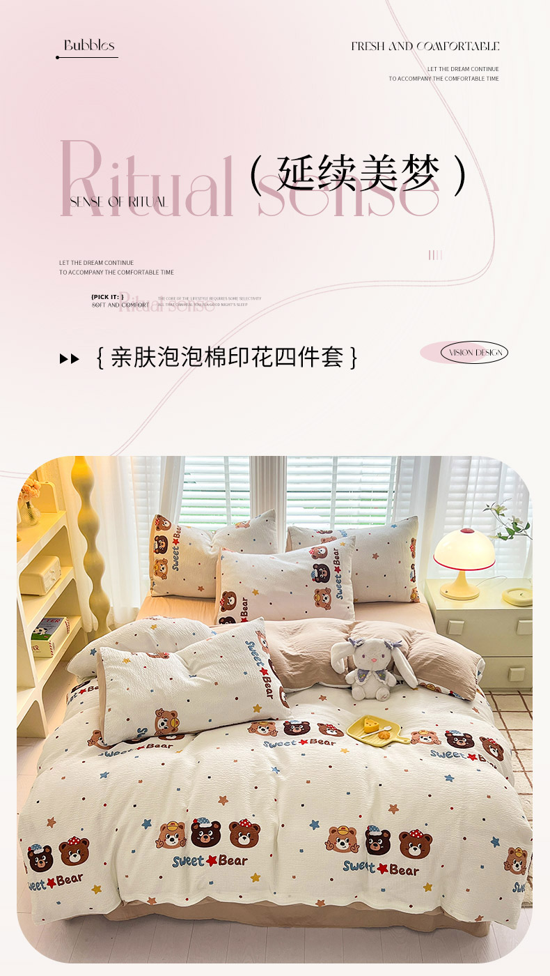 当前位置: 91家纺网 > 商品网购 > 床品套件 > 四件套 > 水洗棉四件套 > 妖妖家纺 2024新款有氧水洗泡泡棉印花四套泡芙棉四件套 三只小熊
