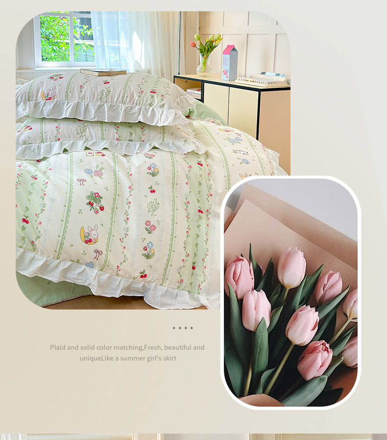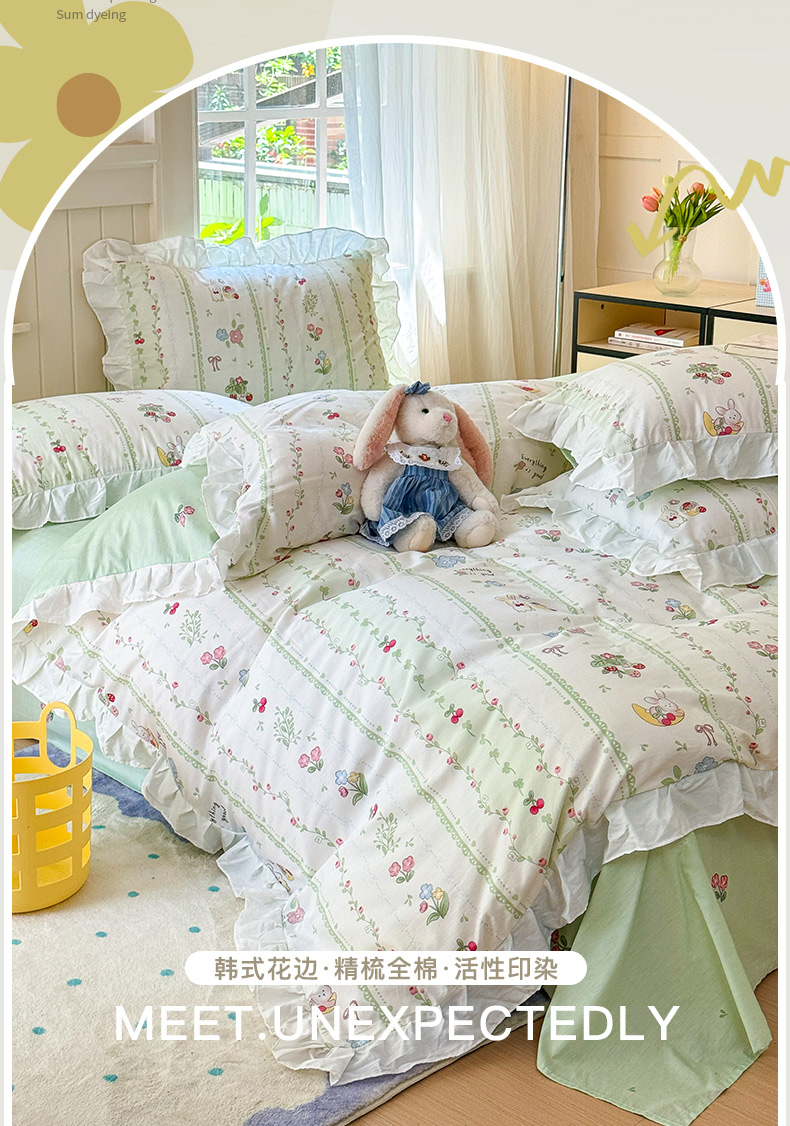 商品名称:清雅福 2024新款喷气全棉13372韩版花边款四件套 草莓兔花边款