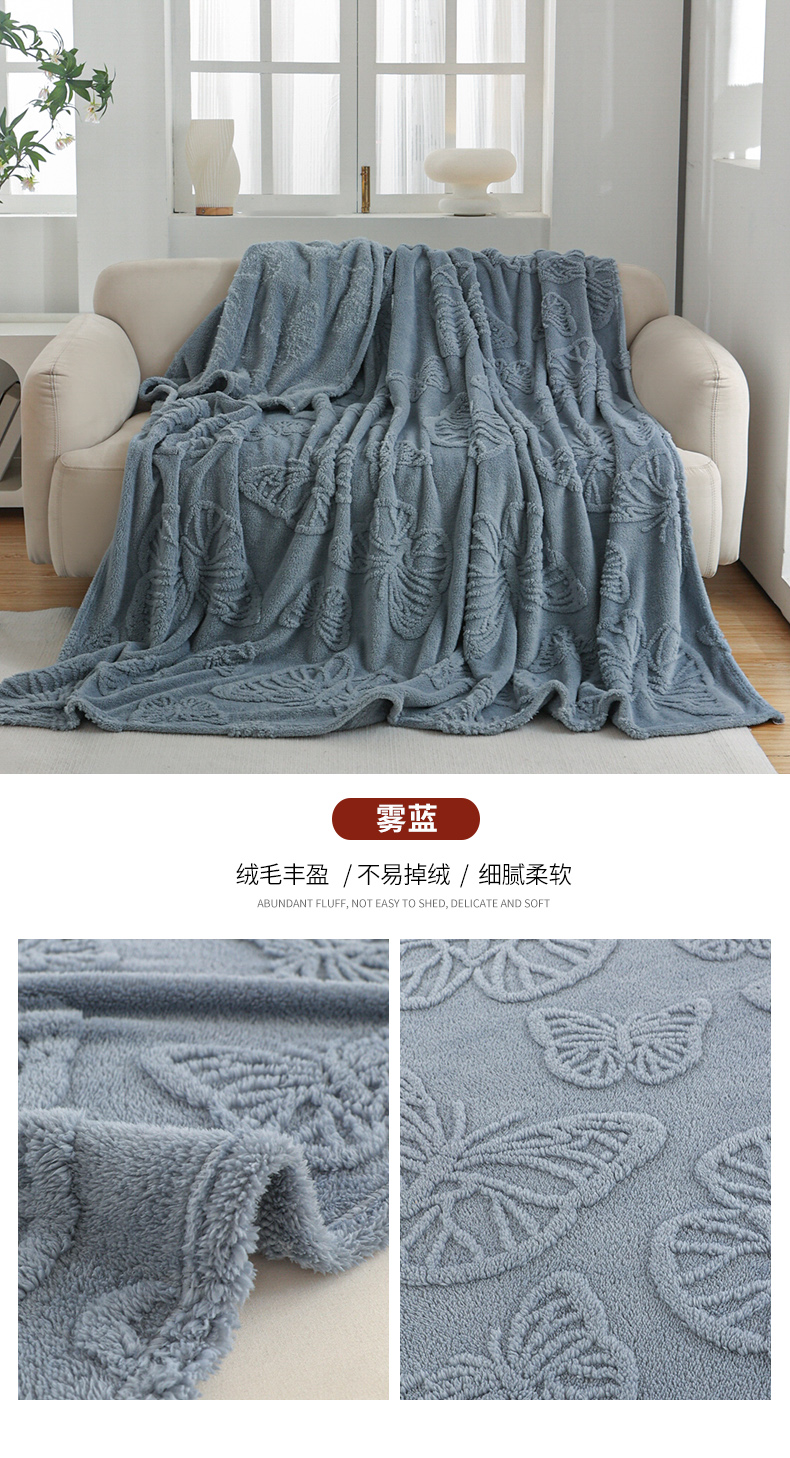 商品名称:枋梢家纺 2024新款跨境电商塔芙绒纯色蝴蝶花提花多功能盖毯午睡毯子办公毛毯 雾蓝