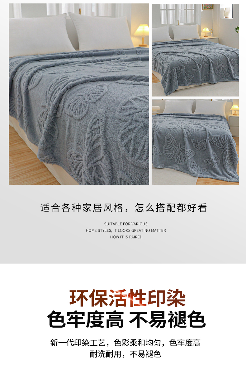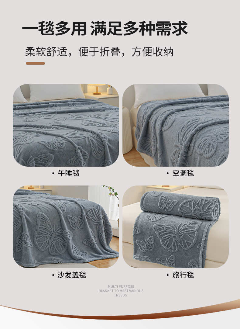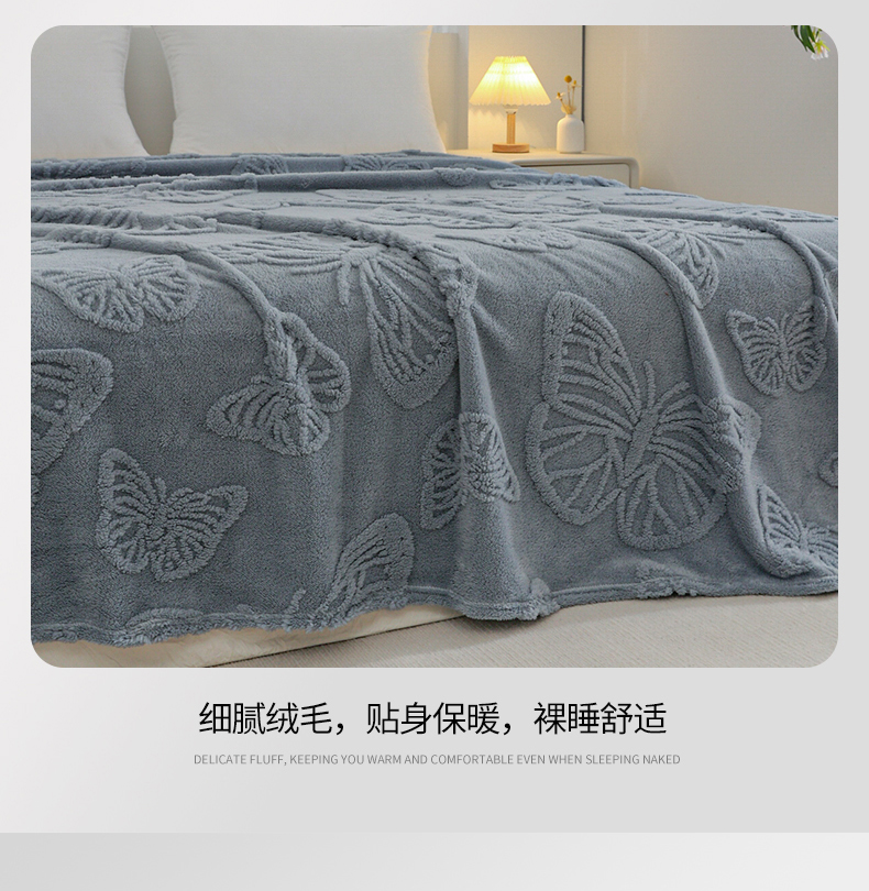 枋梢家纺 2024新款跨境电商塔芙绒纯色蝴蝶花提花多功能盖毯午睡毯子办公毛毯 雾蓝