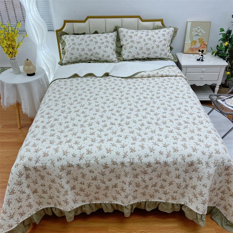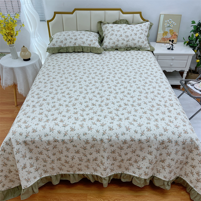 暖居 2024新款A类双层纱全棉床盖三件套防滑不跑床绗缝加厚纯棉床单 花枝叶