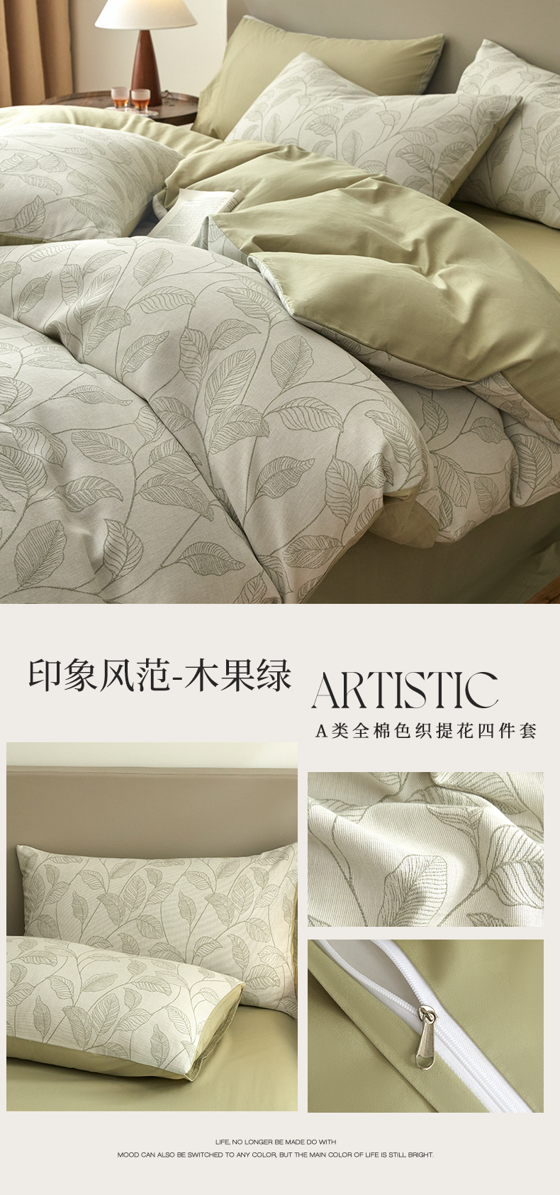 当前位置: 91家纺网 > 商品网购 > 床品套件 > 四件套 > 全棉普通四件套 > 慕色家纺 2024新款A类全棉色织提花四件套系列 印象风范-木果绿