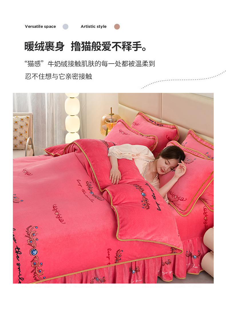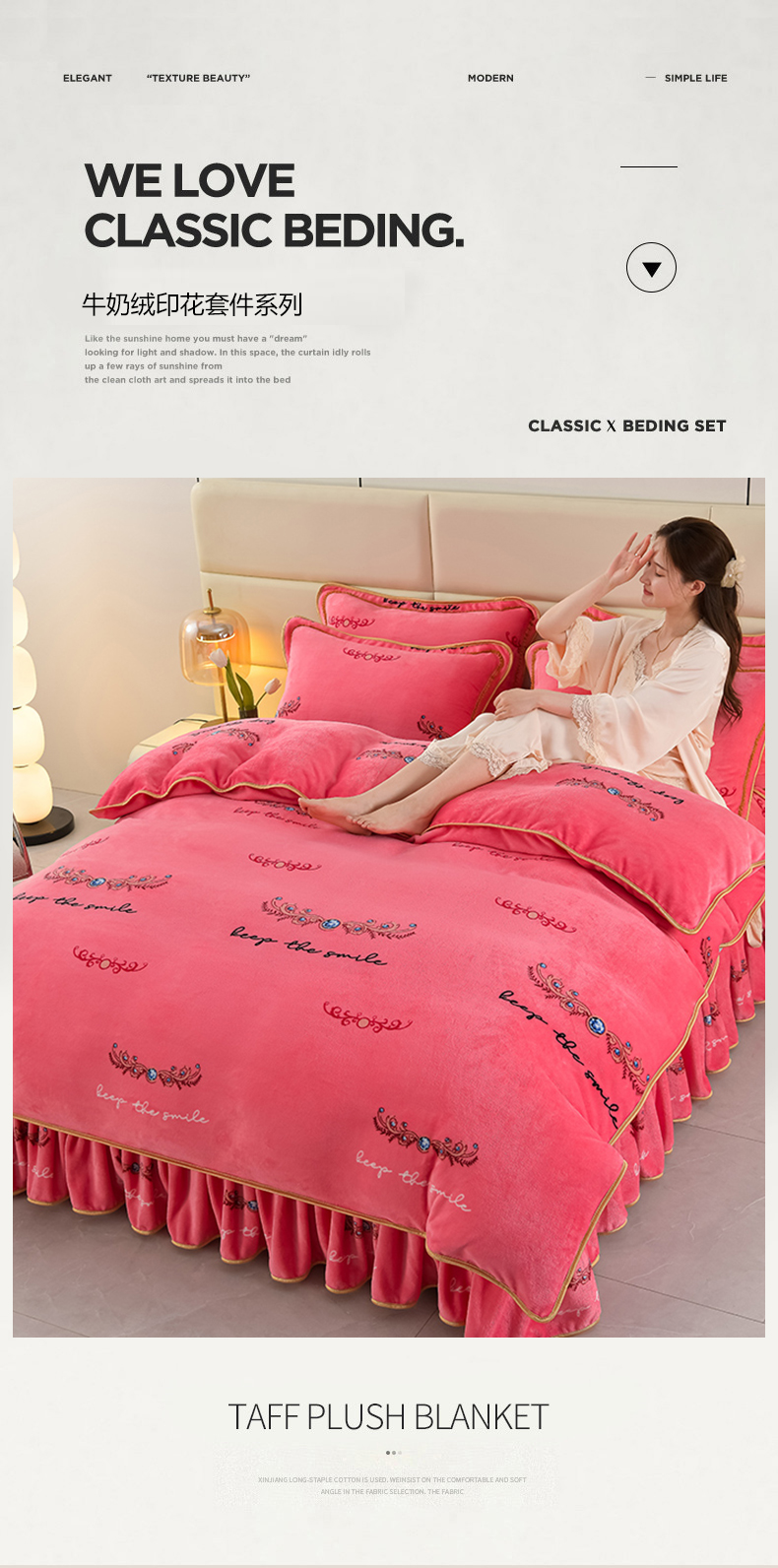 绒品壹家 2025新款电商直播爆款高克重7斤牛奶绒金貂绒印花床裙款三件套四件套 花颜,花颜