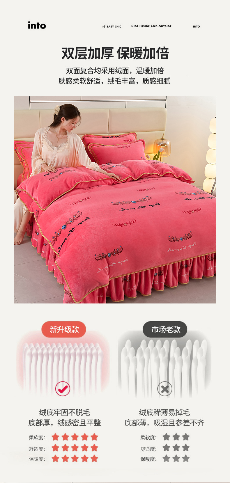 绒品壹家 2025新款电商直播爆款高克重7斤牛奶绒金貂绒印花床裙款三件套四件套 繁花似锦,繁花似锦
