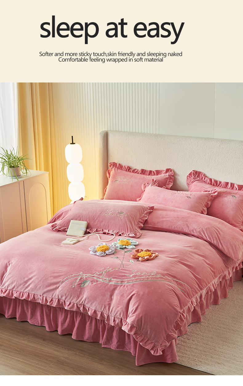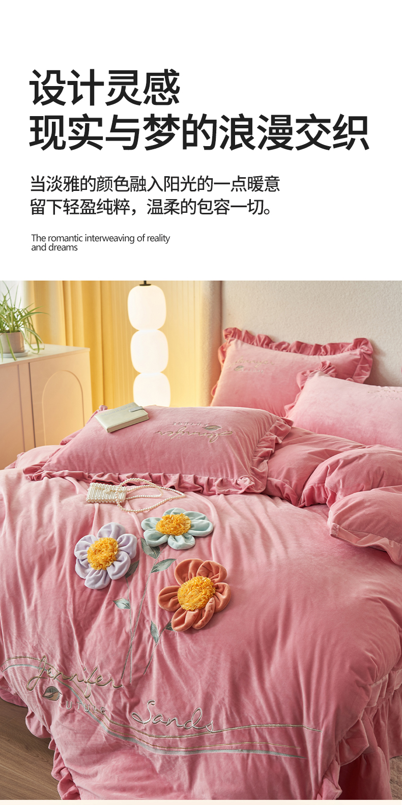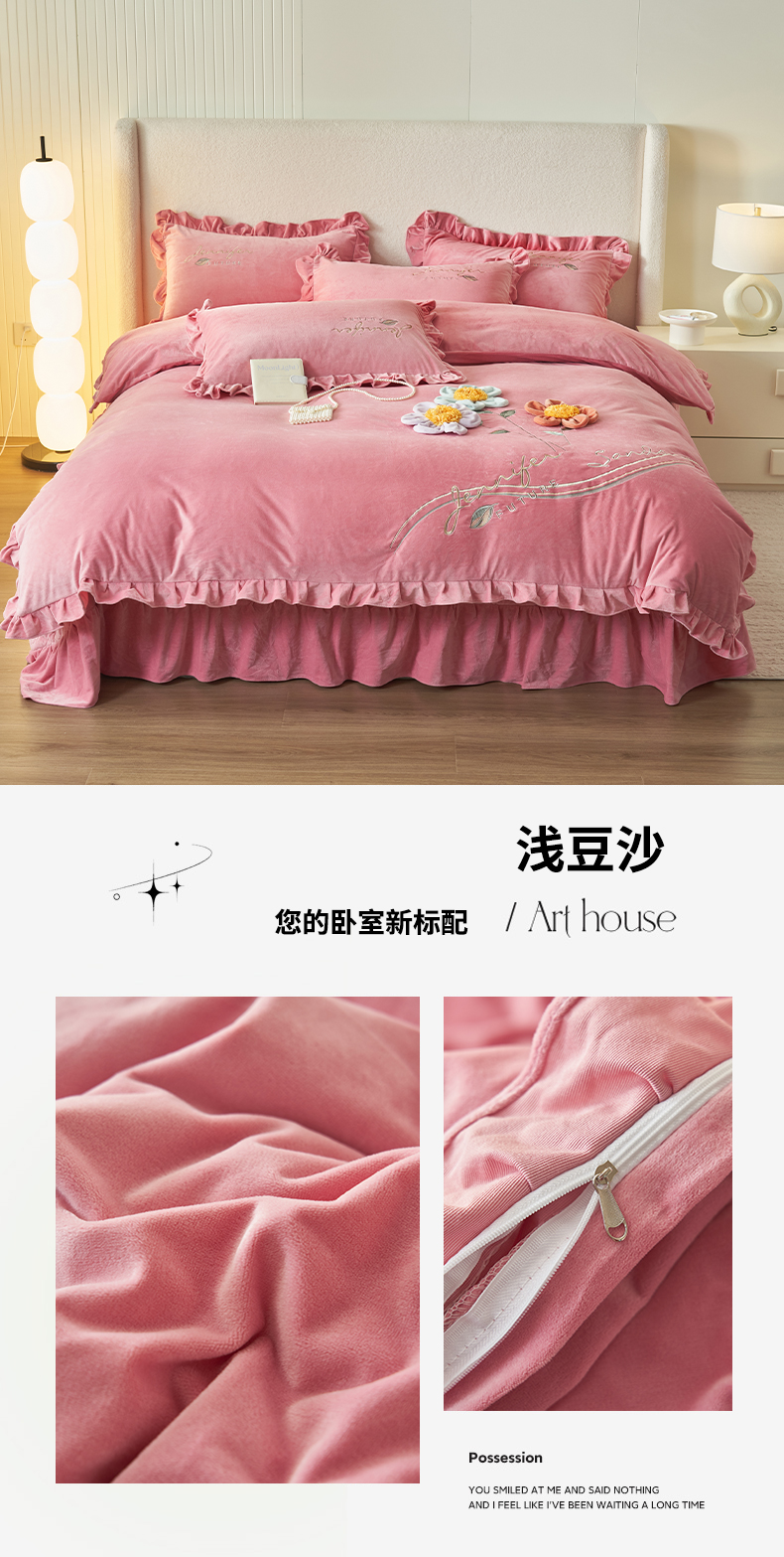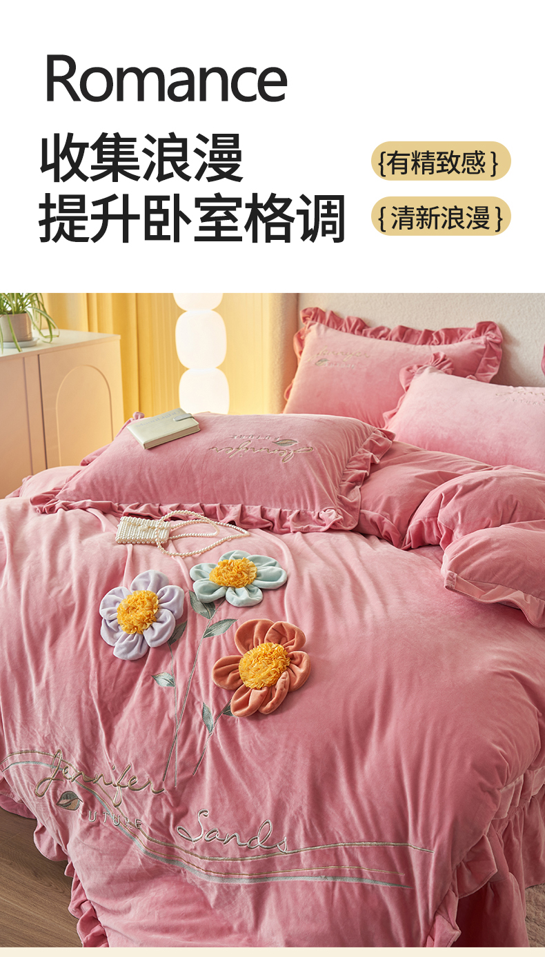(总)恒爱家纺 2025新款牛奶绒贴布绣夹棉床裙四件套,豆沙红,浪漫紫,天空蓝,温馨粉,象牙白