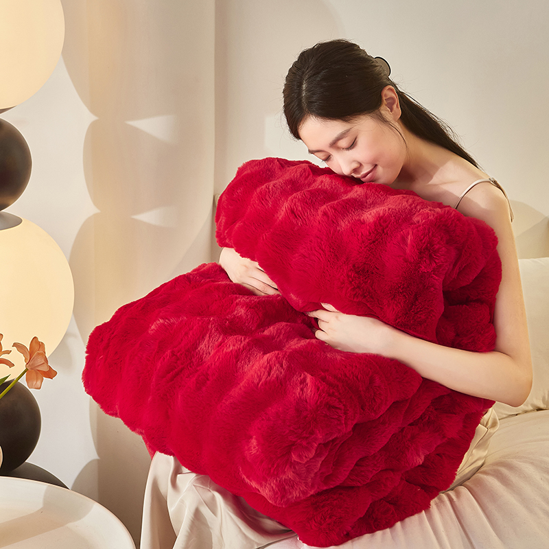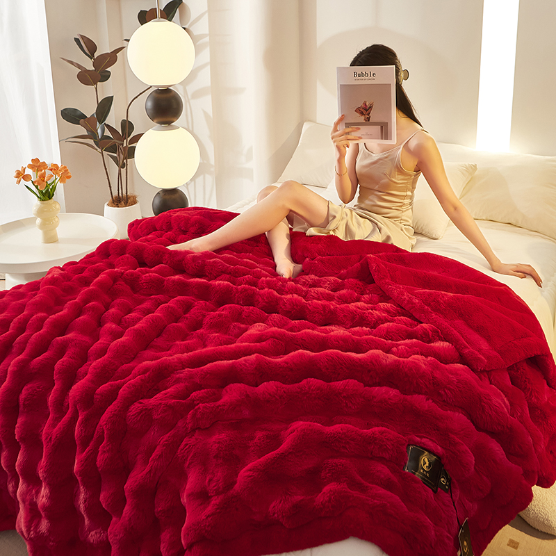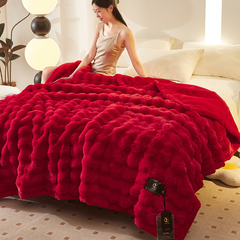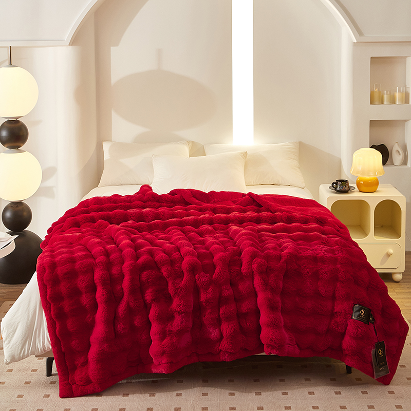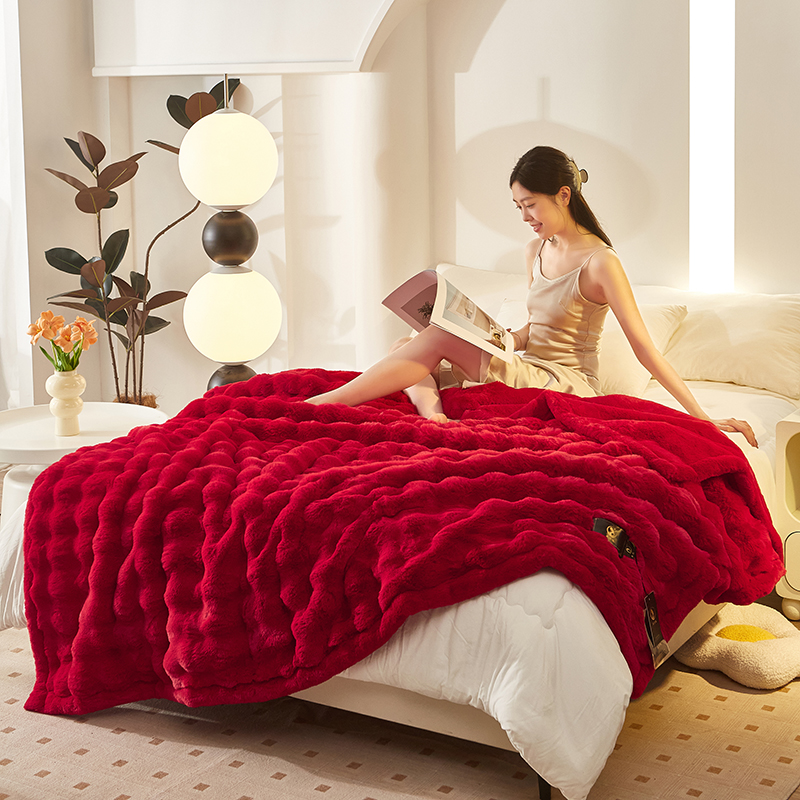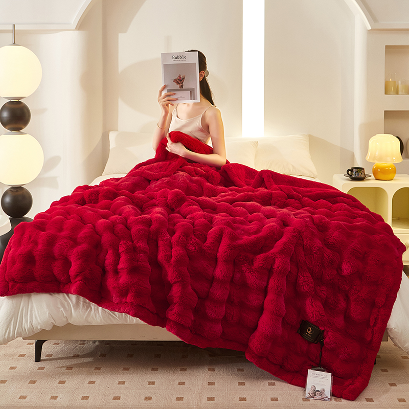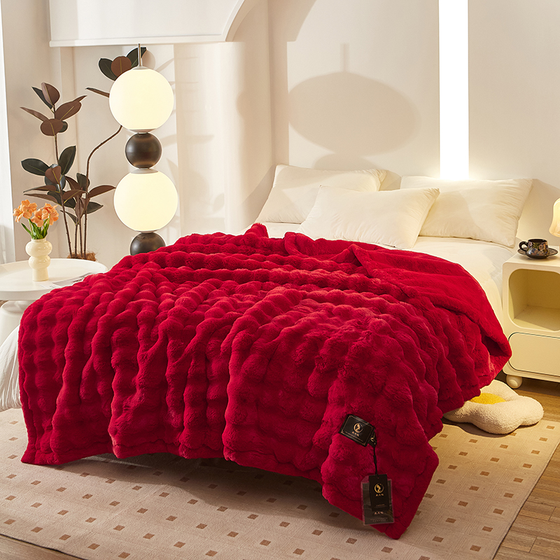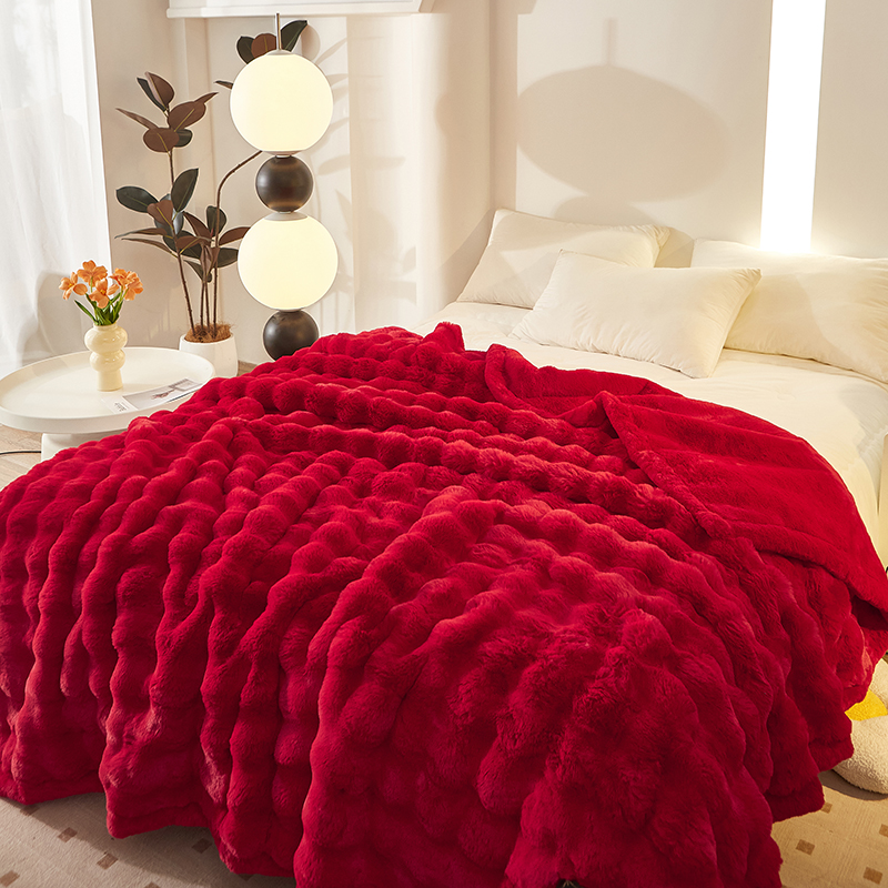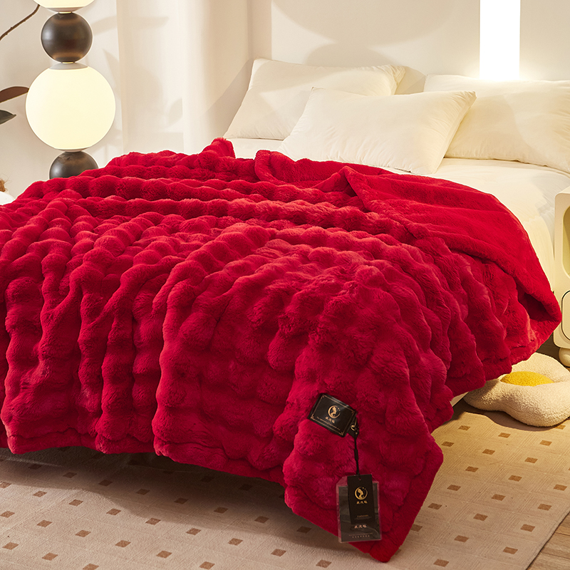 尚品凤凰 2025新款亲肤舒适加厚保暖貂绒兔毛泡泡毛毯 泡泡-大红