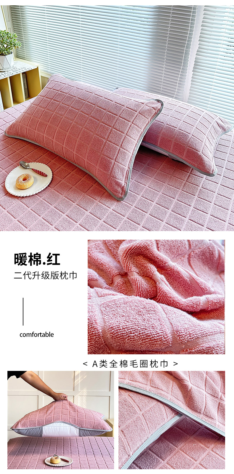 爱港家纺 2024新款全棉A类毛巾被升级款单人枕巾枕芯保护套枕套 暖棉-红