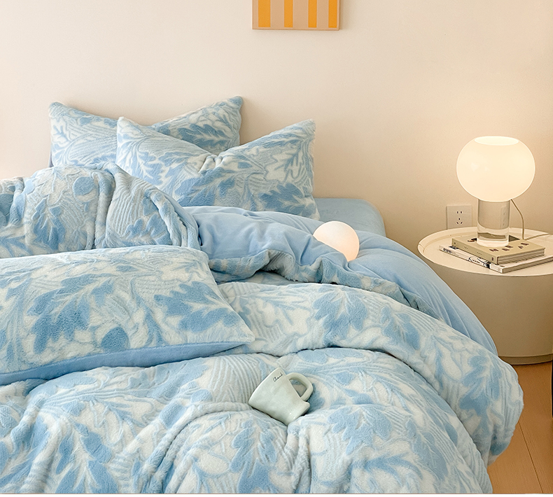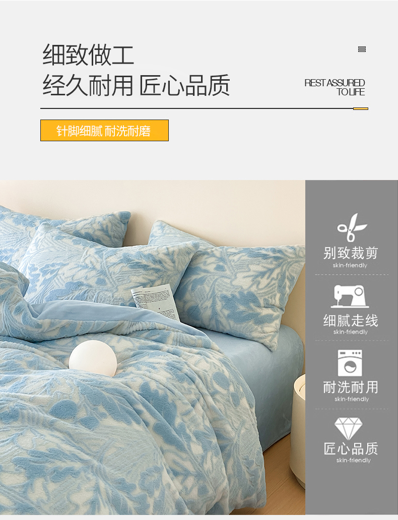 商品名称:金爱家 2024新品全消光A类纯色獭兔毛绒立体牛奶绒兔毛雕花350克四件套 兔毛罗曼蒂蓝色
