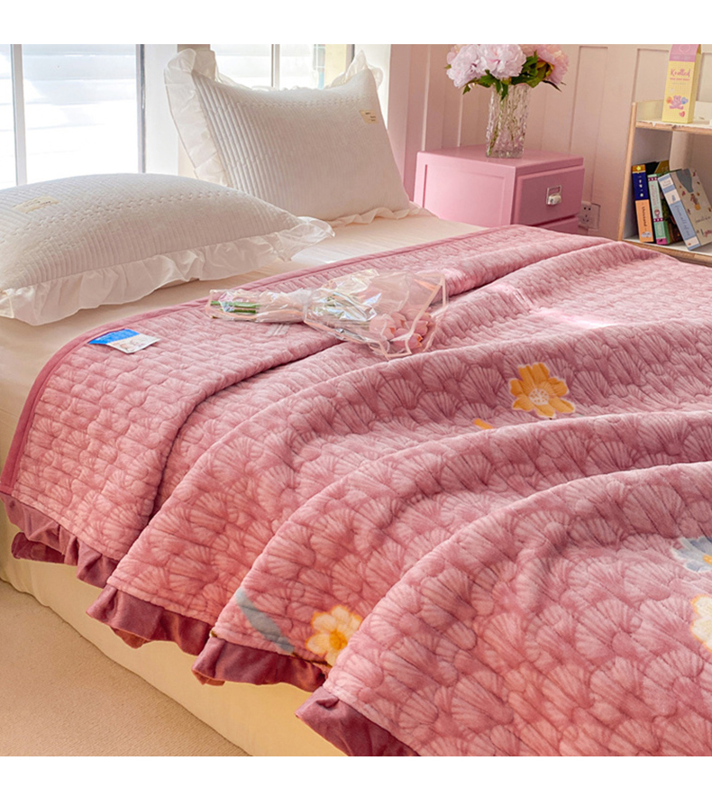 胜权家纺 2024秋冬新款印花牛奶绒加厚保暖圆角花边夹棉床盖 太阳花豆沙