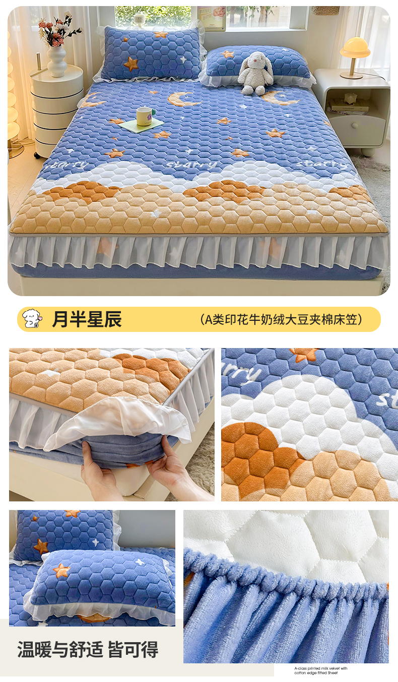 • 91家纺网 家纺一手货源 找家纺 伊人坊 2024冬季加厚牛奶绒花边夹棉床笠三件套纯色印花花边款床垫保护套 月半星辰