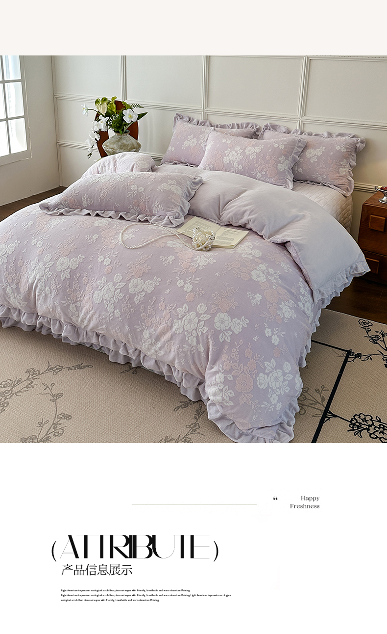 当前位置: 91家纺网 > 商品网购 > 床品套件 > 四件套 > 牛奶绒四件套 > 野合家纺 2024新款法式A类雕花牛奶绒韩版公主风四件套床盖款床单款床笠款 花开花艳-粉紫