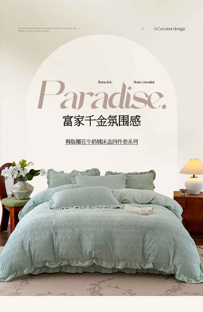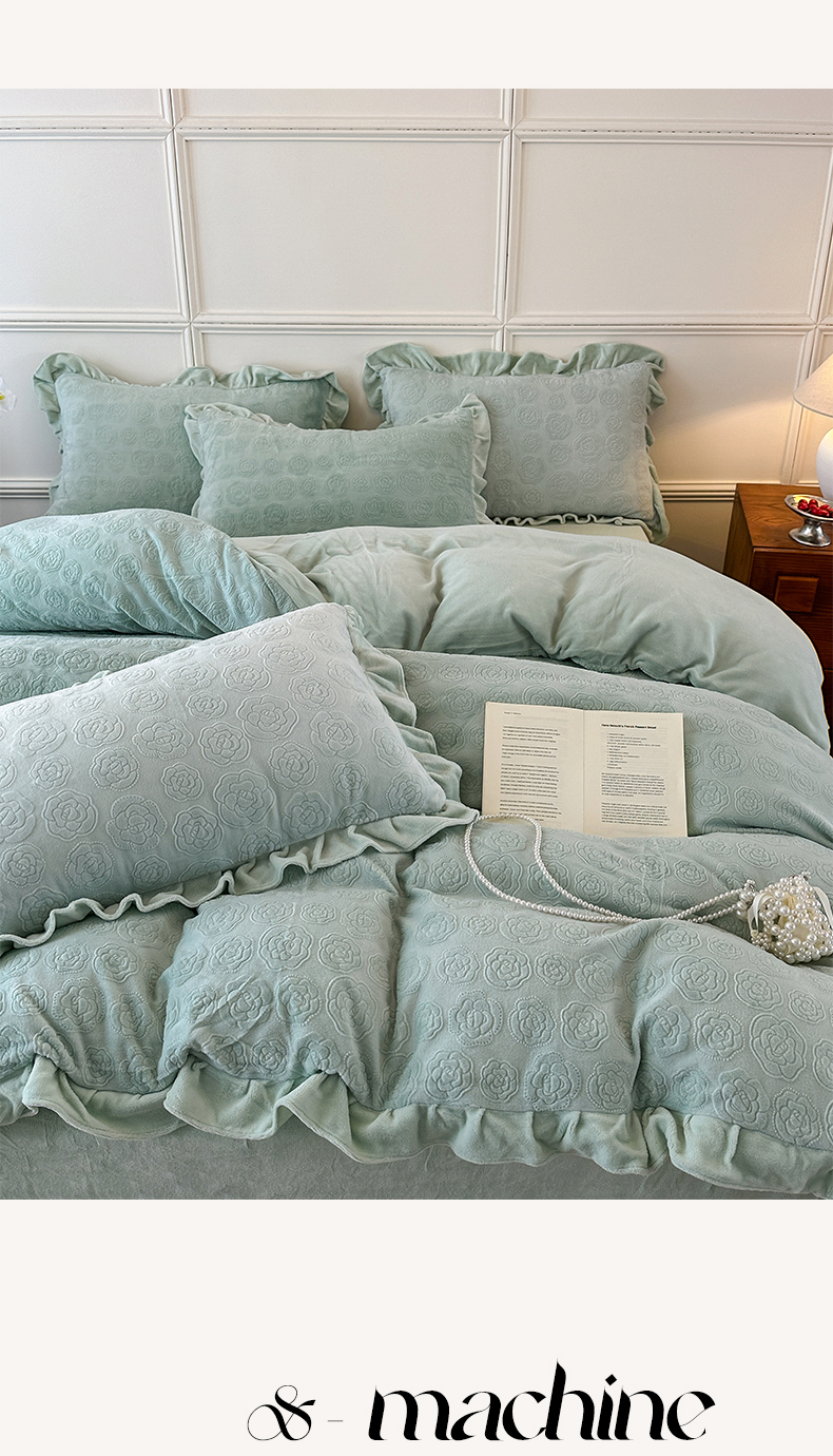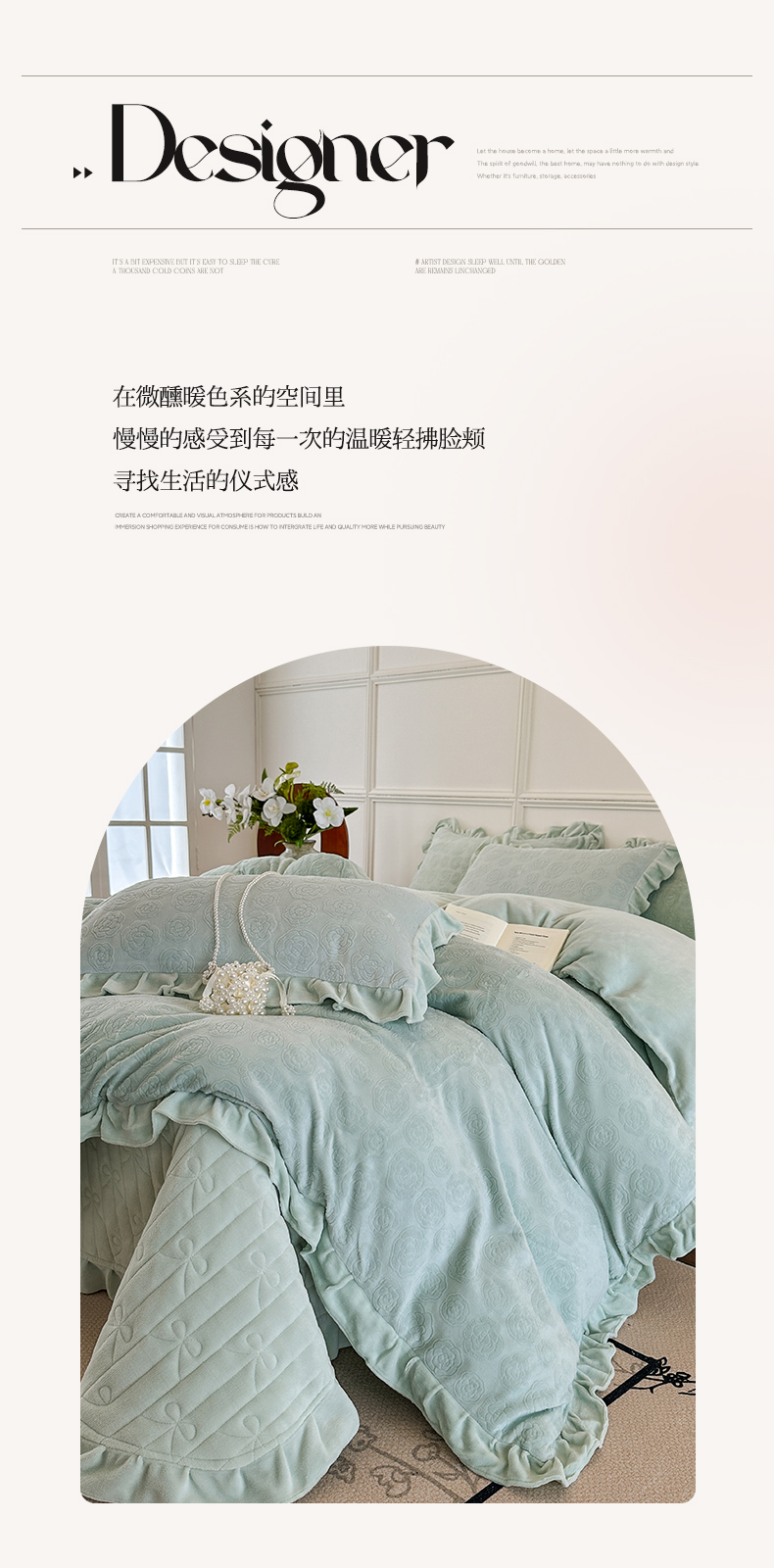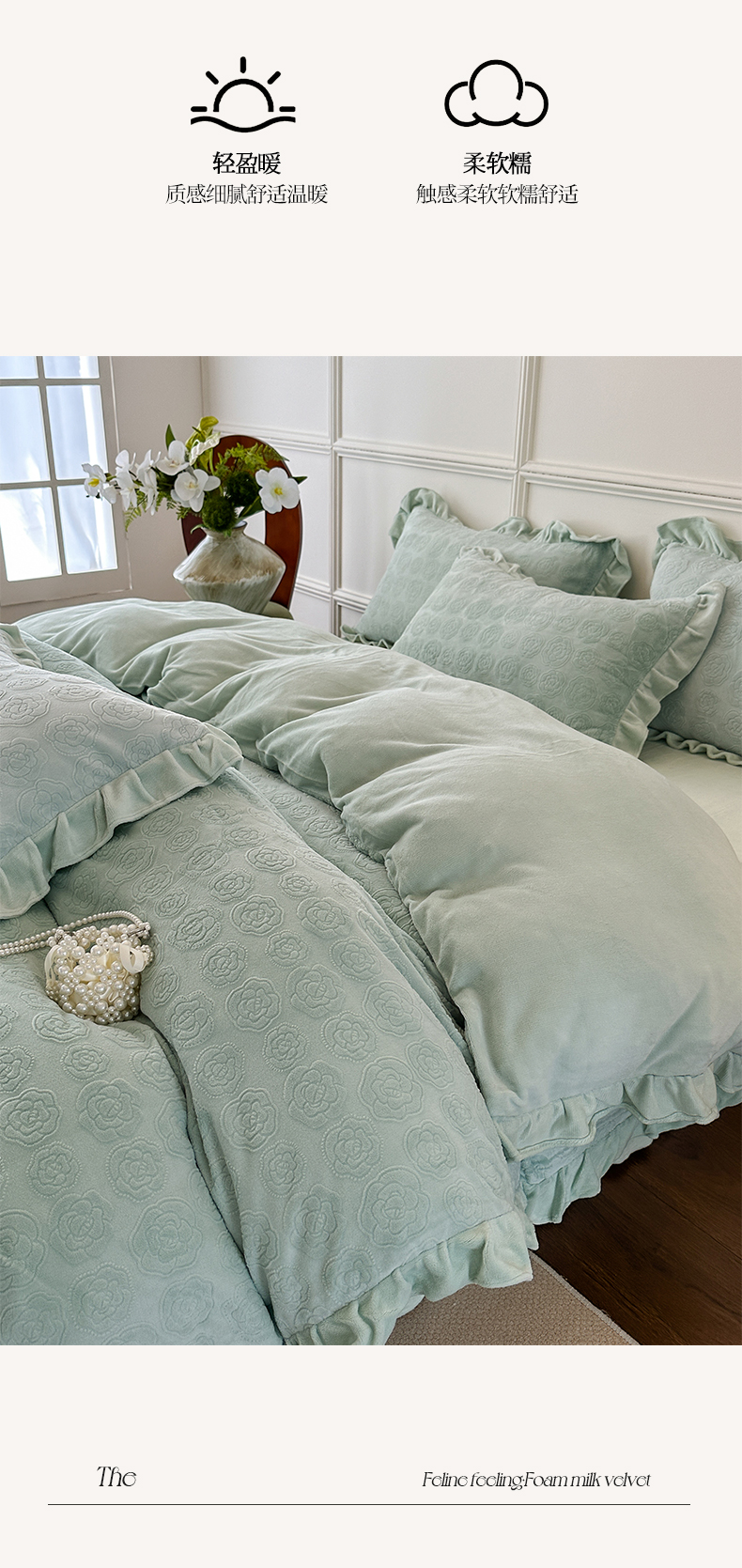 当前位置: 91家纺网 > 商品网购 > 床品套件 > 四件套 > 牛奶绒四件套 > 野合家纺 2024新款法式A类雕花牛奶绒韩版公主风四件套床盖款床单款床笠款 山茶花-马利兰