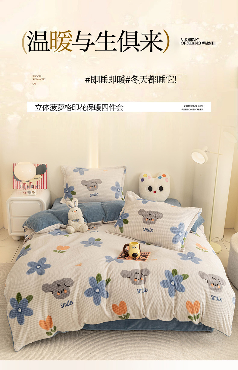 当前位置: 91家纺网 > 商品网购 > 床品套件 > 四件套 > 牛奶绒四件套 > 2024新款立体菠萝格印花保暖牛奶绒系列四件套 考拉狗
