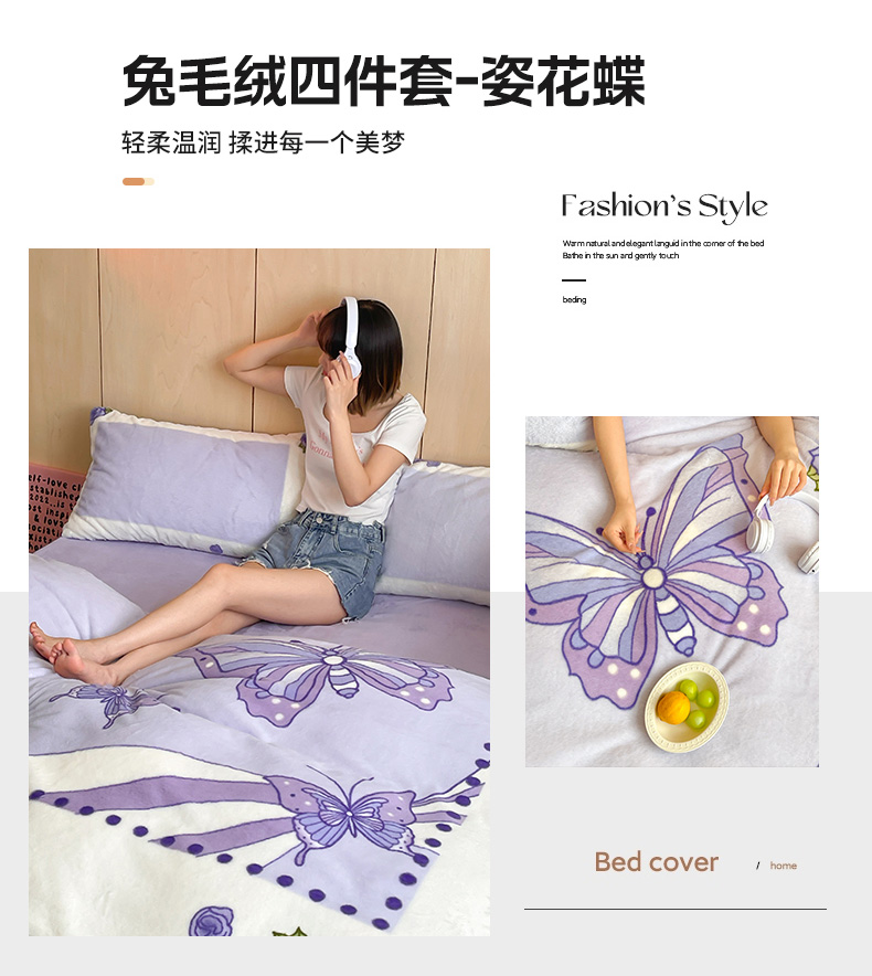 商品名称:安哆啦家纺 2024新款兔毛绒大版卡通牛奶绒兔兔绒印花四件套 姿花蝶