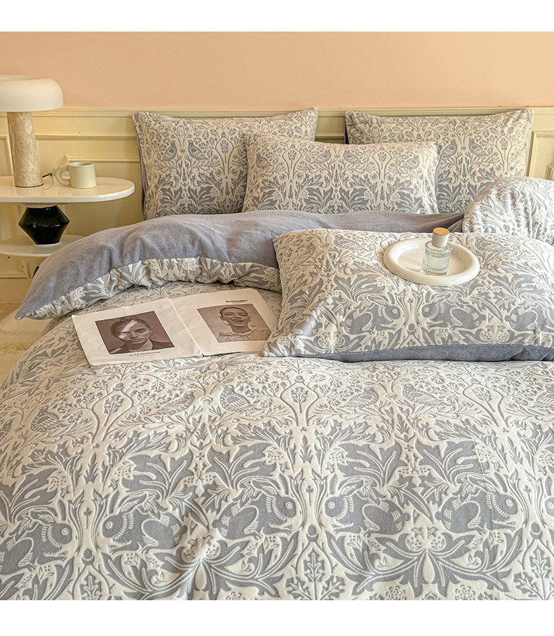 商品名称:大境 2024新款8斤A类230克牛奶绒提花烂花四件套床笠款床单款 可可西里 灰蓝