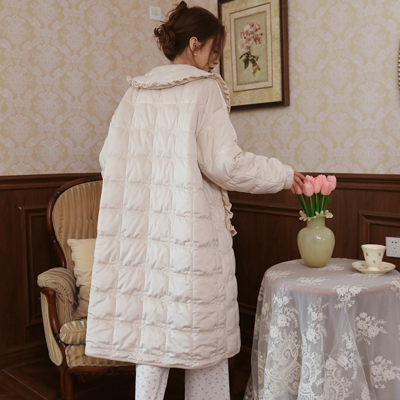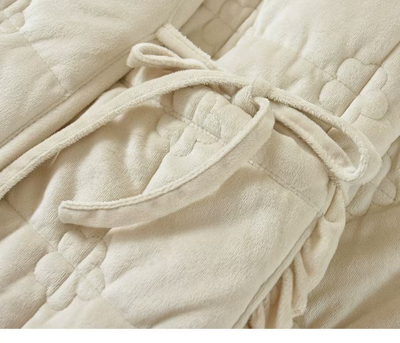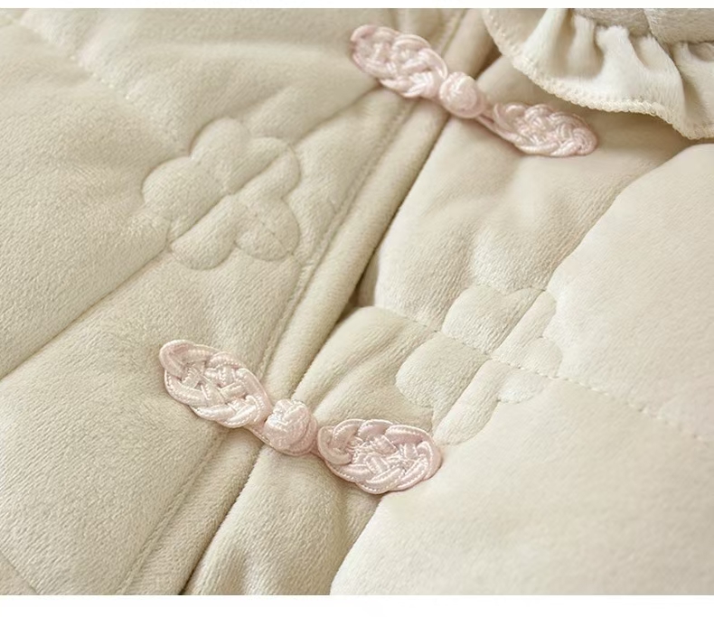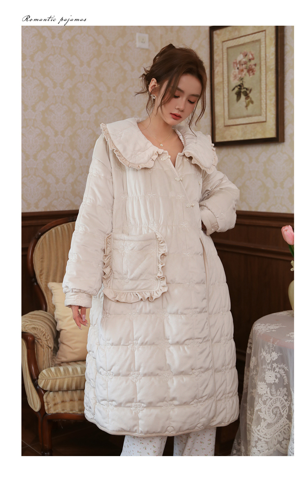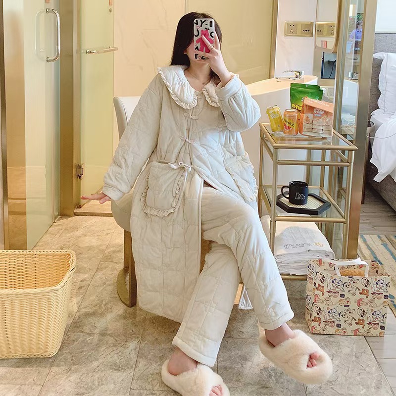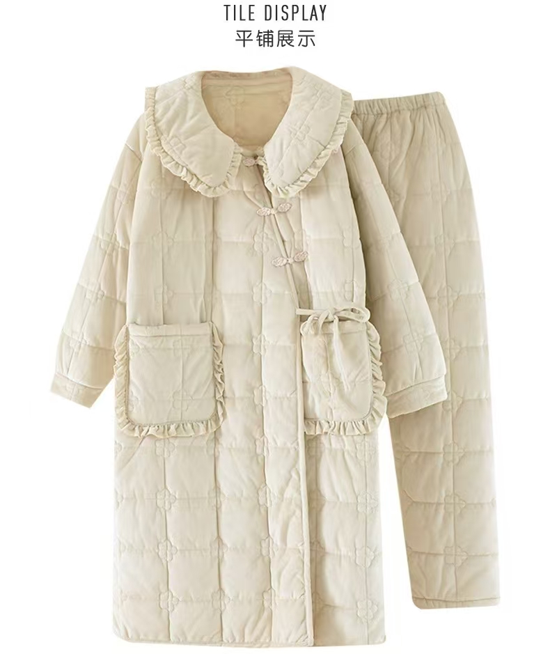 洛兰沙家居馆 2024新款中国风盘扣睡袍三层夹棉加厚睡衣女冬季中长款紫色浴袍家居服套装 一件代发 单件 白色