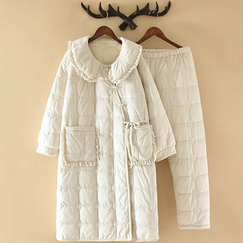 (总)洛兰沙家居馆 2024新款秋冬季清新款睡衣女三层夹棉珊瑚绒加厚保暖两件套女士可外穿加绒家居服,白色