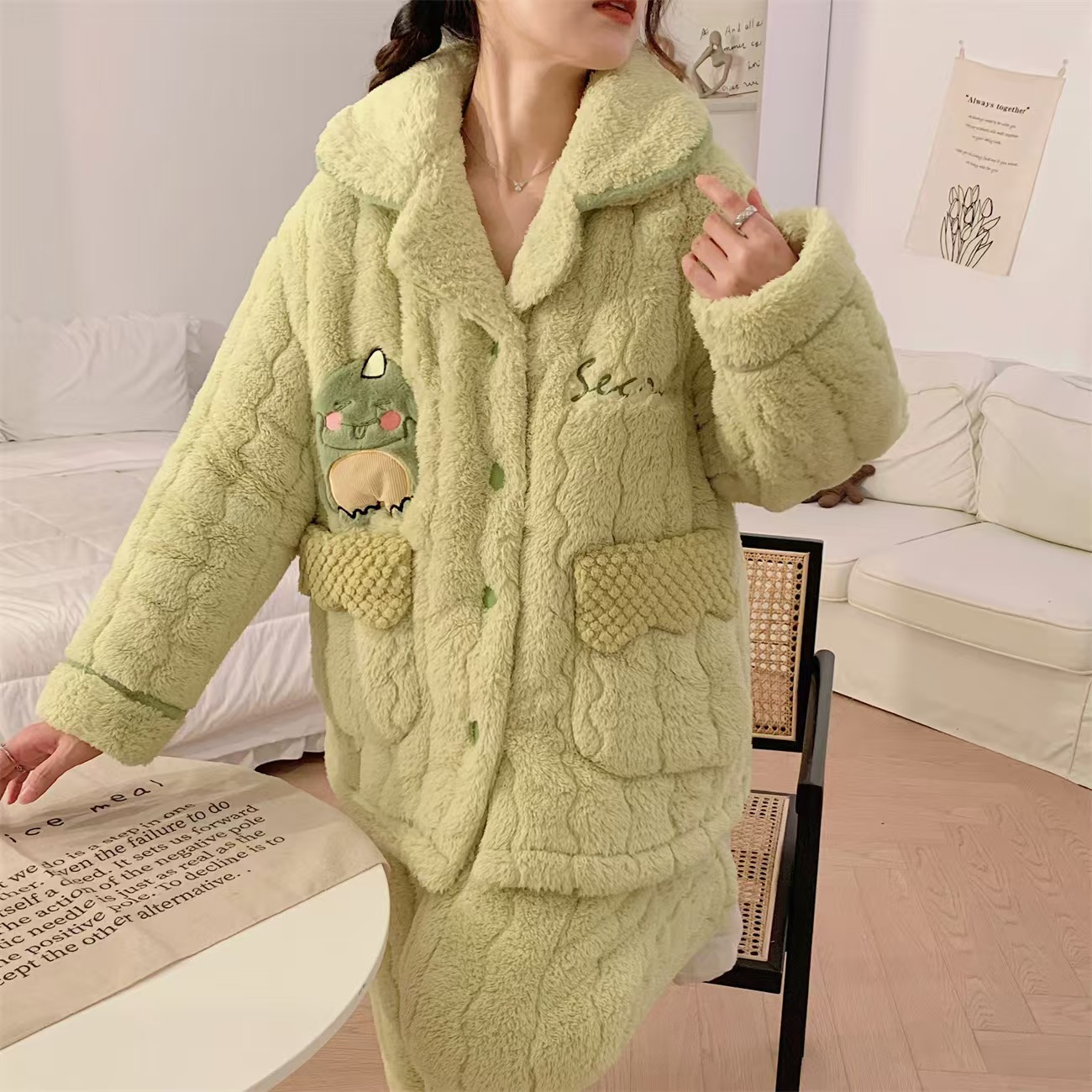 洛兰沙家居馆 2024新款公主风女秋冬季三层夹棉珊瑚绒加厚保暖两件套女士可外穿加绒家居服 L15