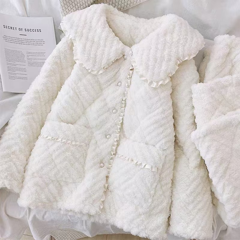 (总)洛兰沙家居馆 2024新款秋冬季清新款睡衣女三层夹棉珊瑚绒加厚保暖两件套女士可外穿加绒家居服,白色