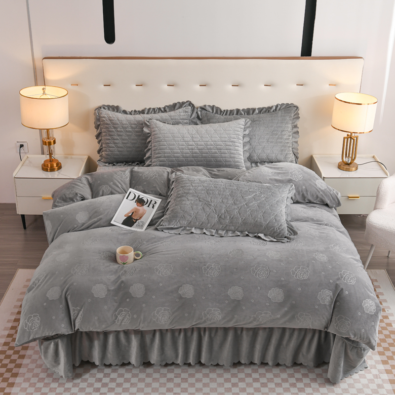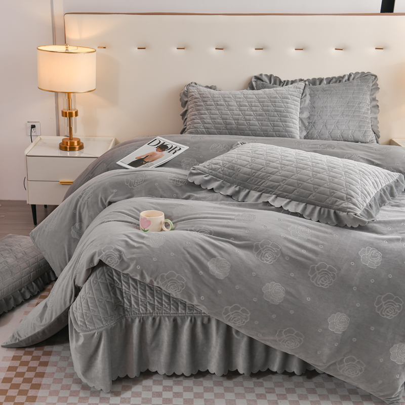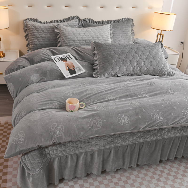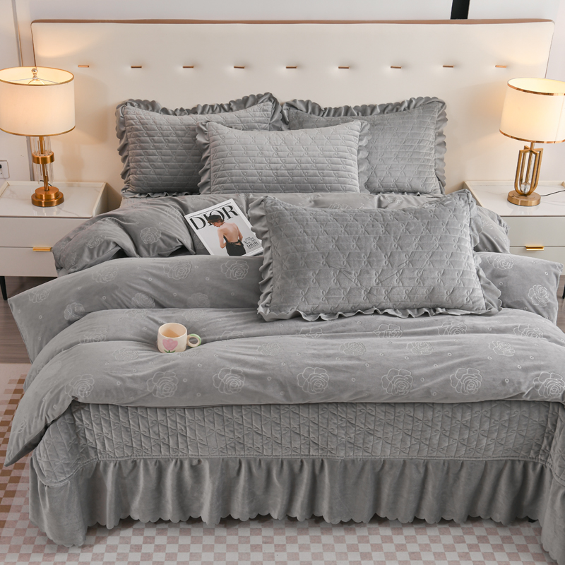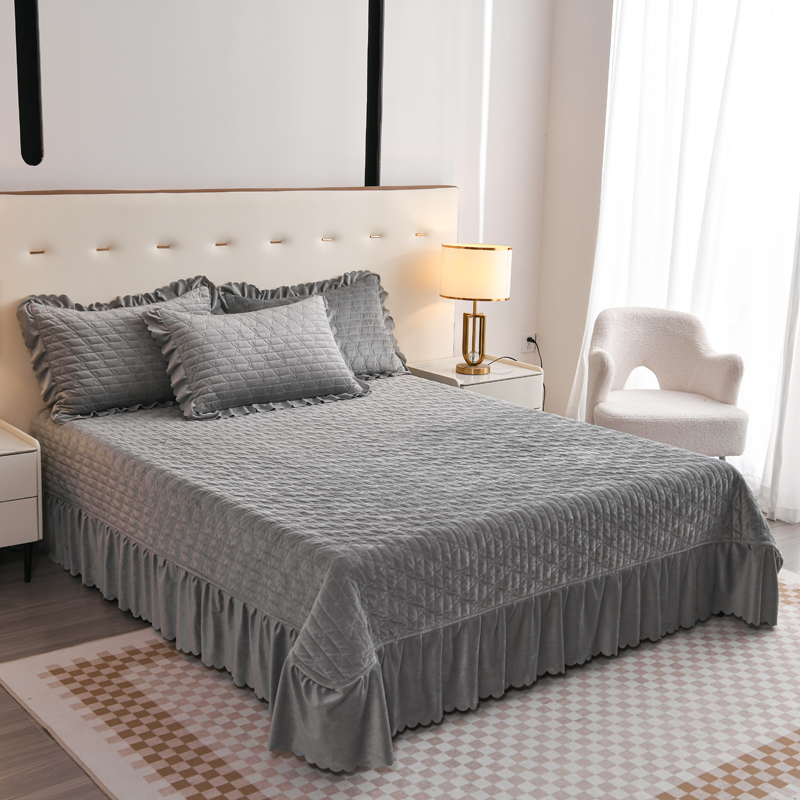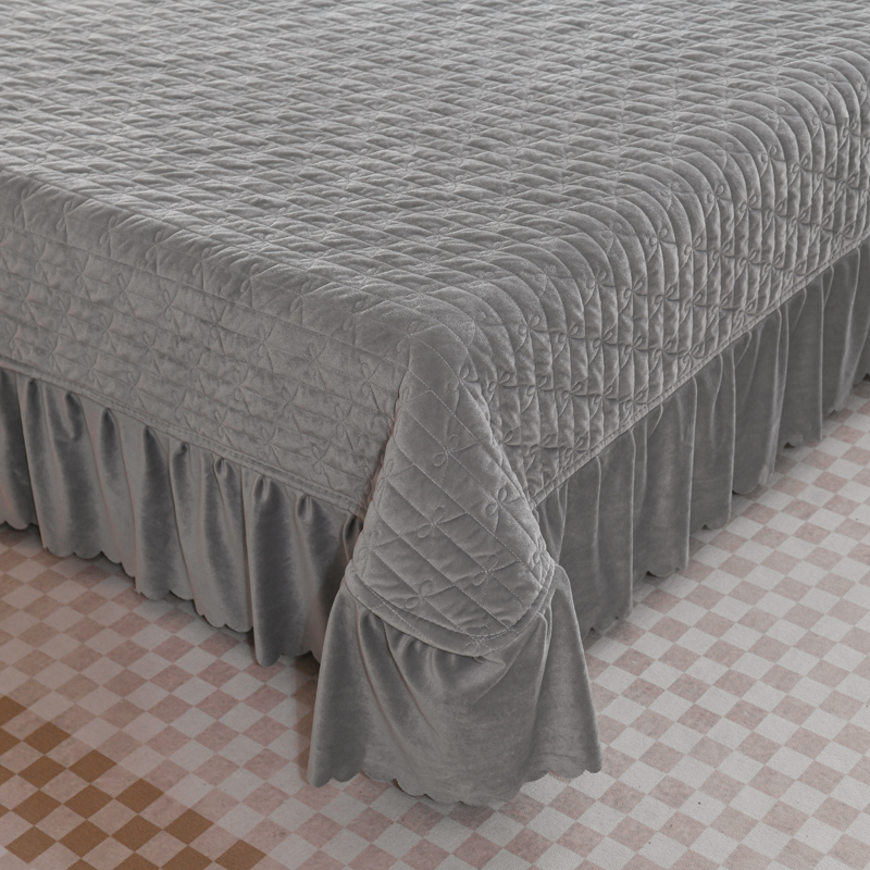 商品名称:雅眠居 直播爆款纯色宝宝绒床盖款四件套花边夹棉床裙款三件套 宝宝绒-烟灰